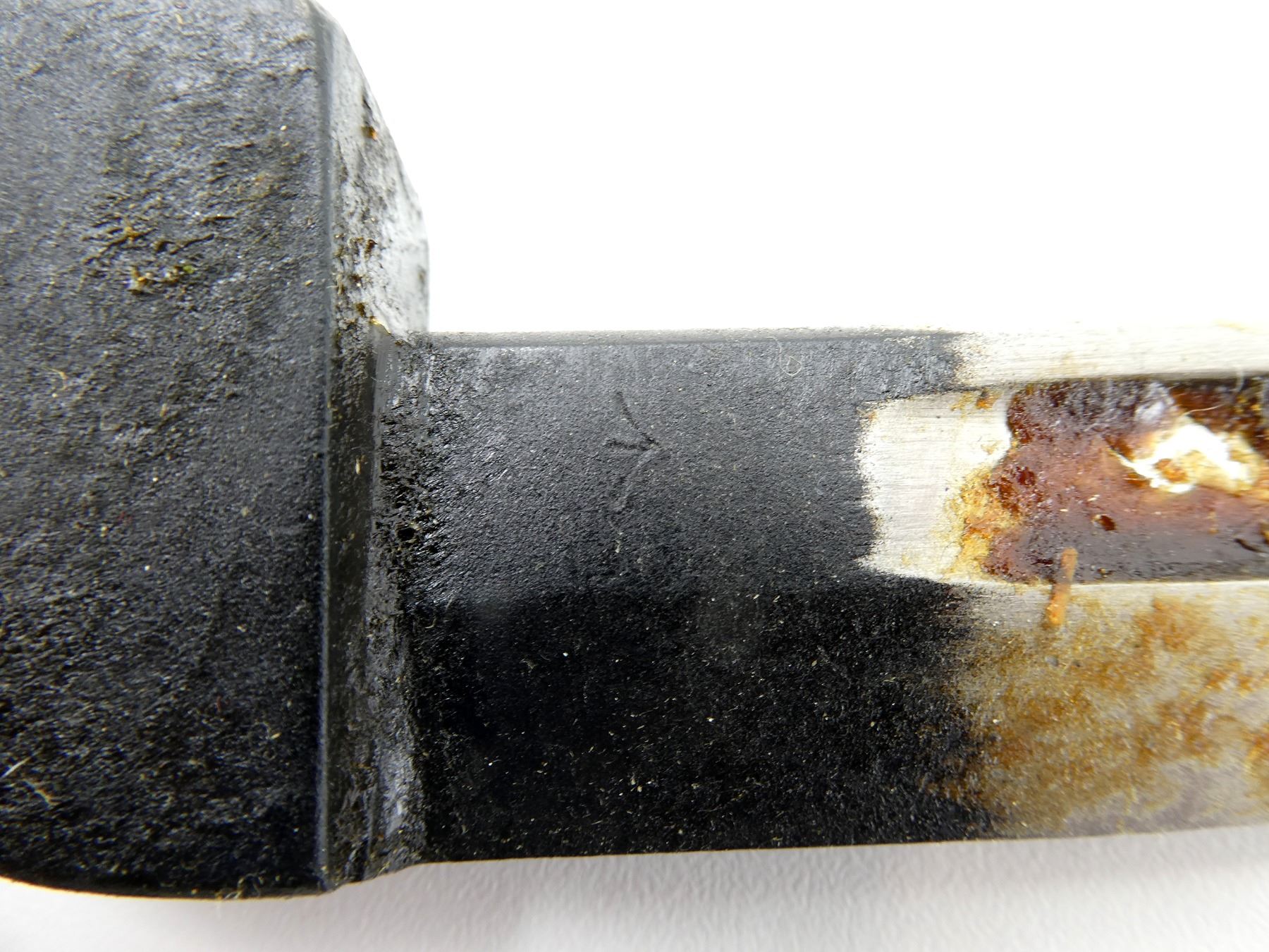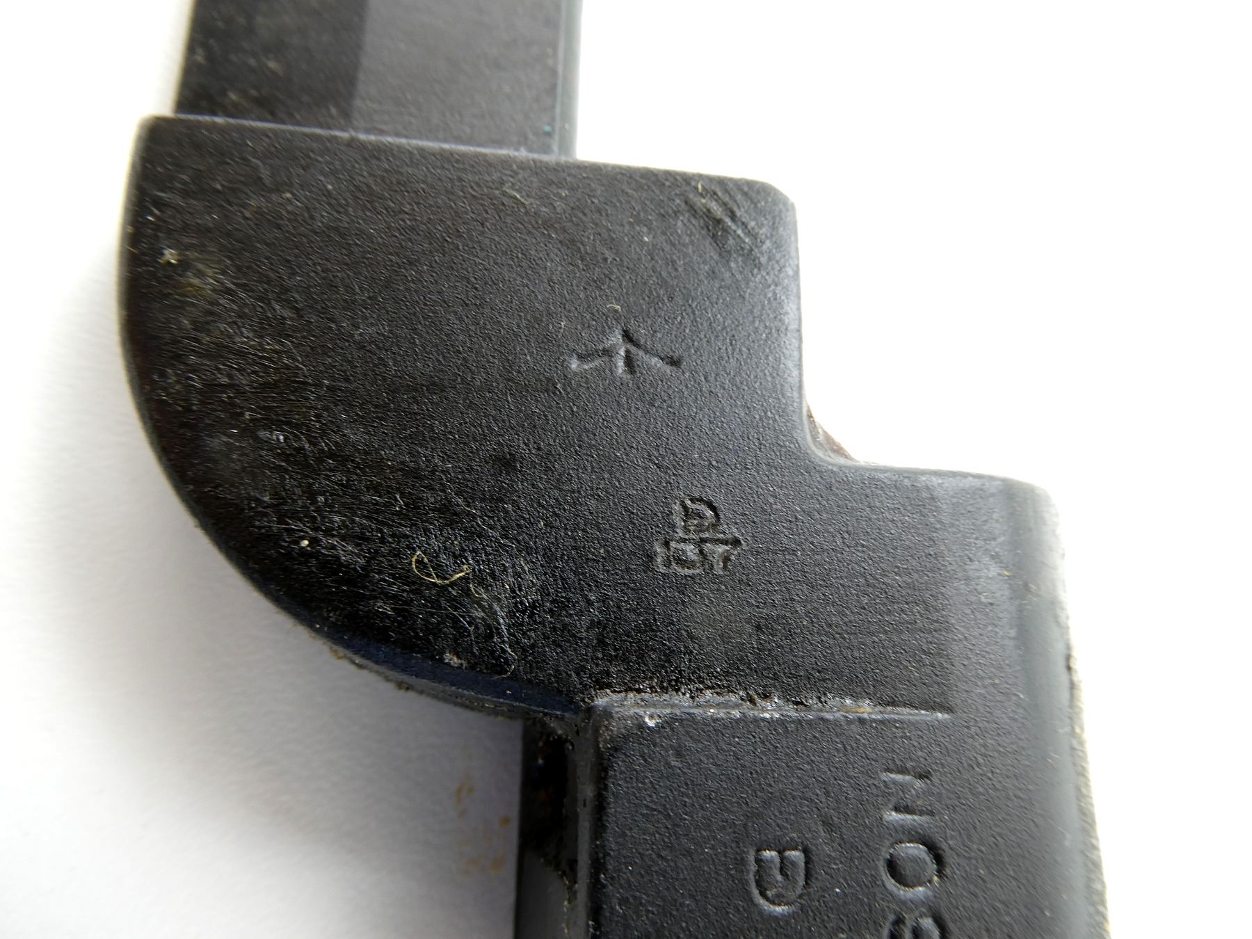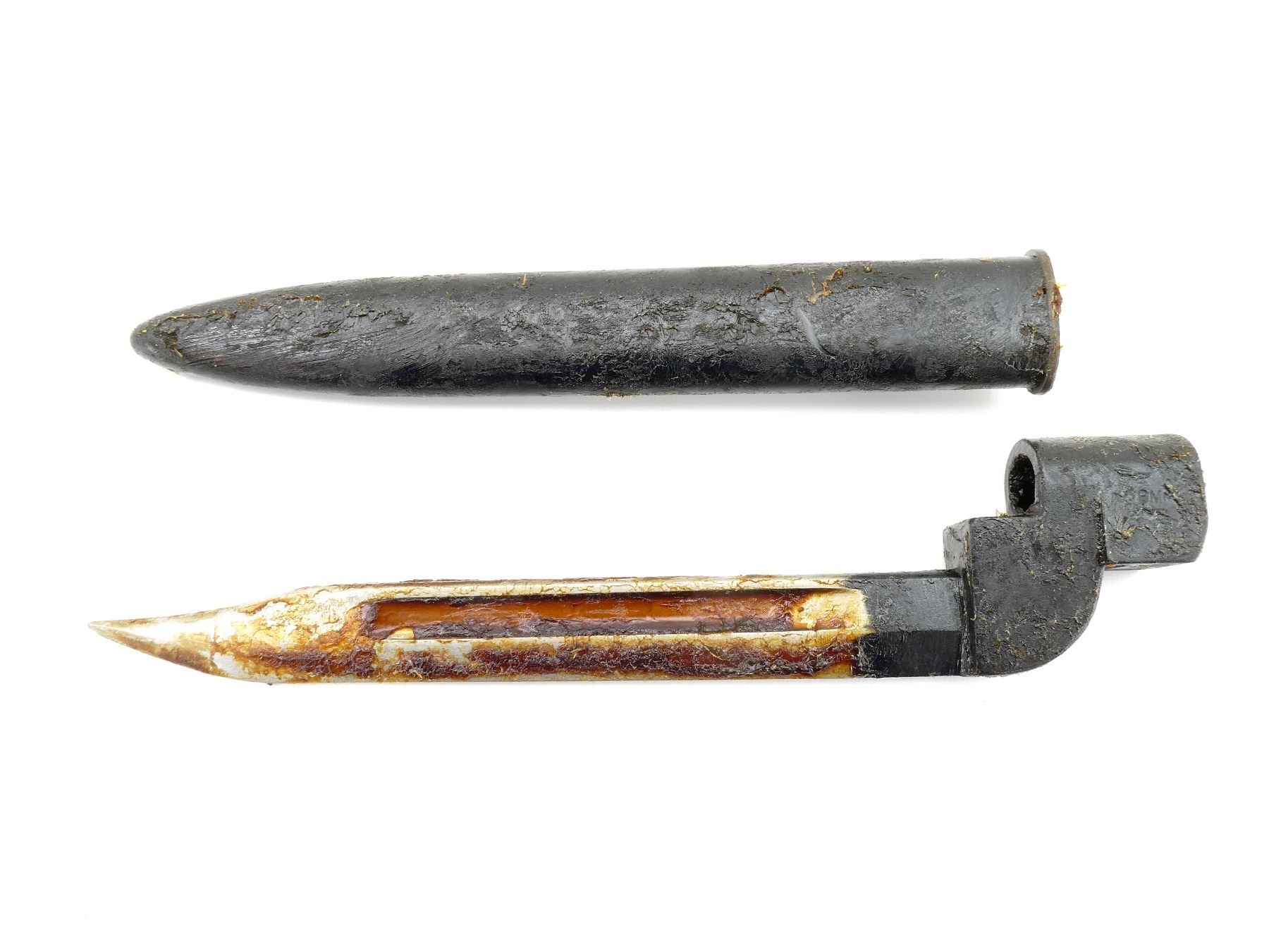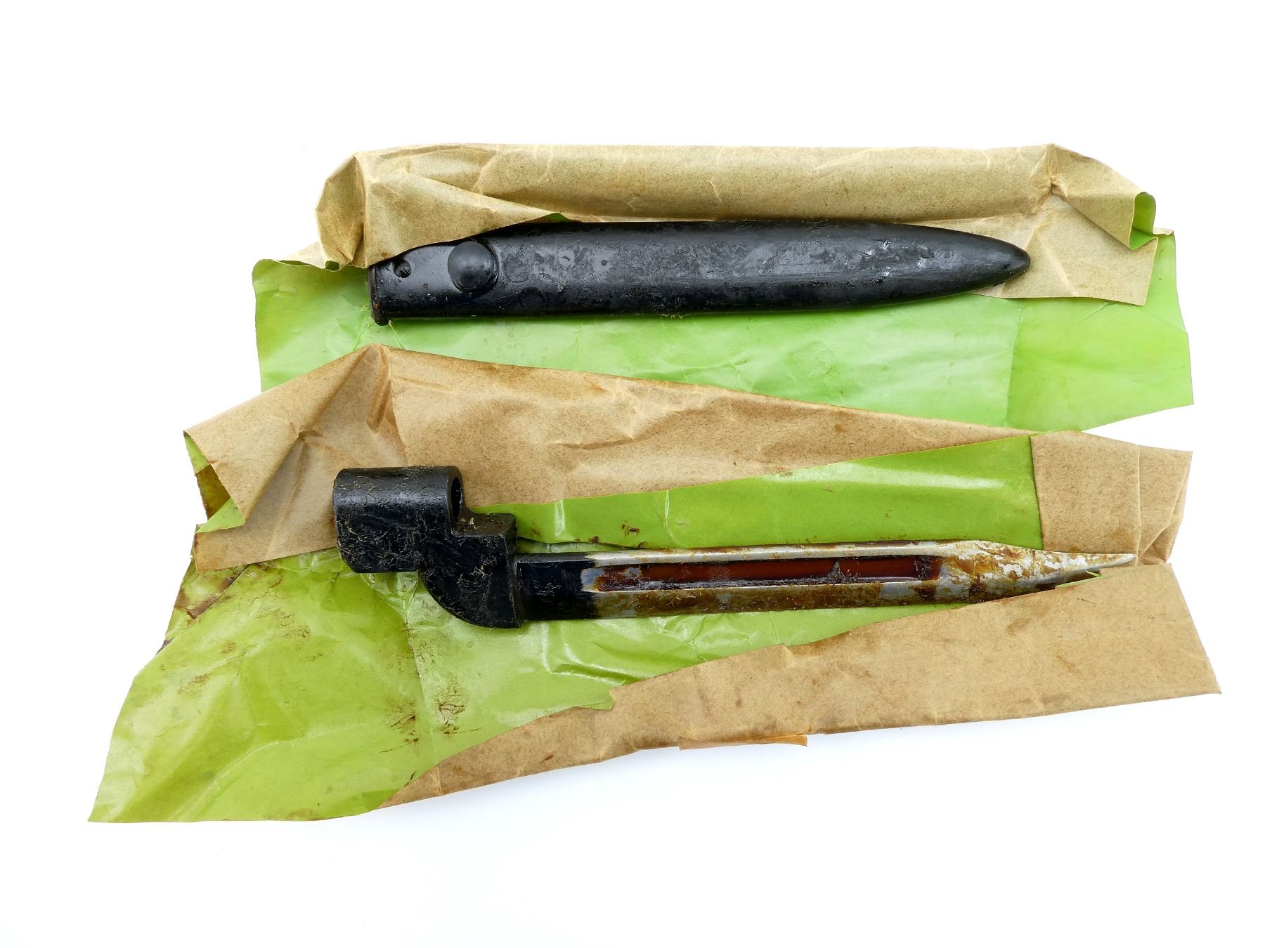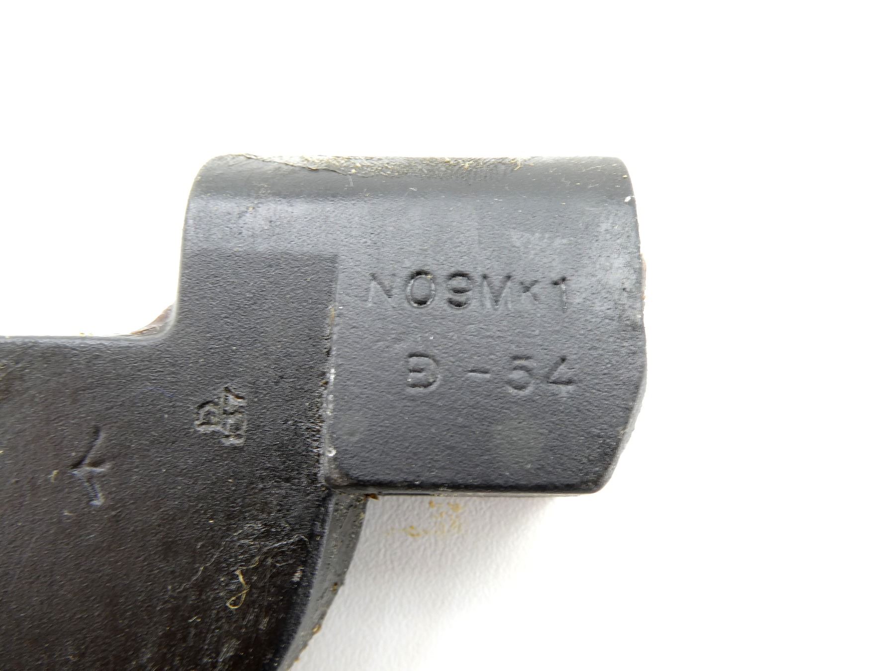 (1) FITS LEE ENFIELD NO.4 RIFLES, WRAPPED IN WAX PAPER, COVERED IN GREASE, BLADE MARKED WITH BROAD ARROW, SOCKET MARKED: "NO9MK1" OVER "ED-54", BROAD ARROW, "ED" OVER "137", CATCH RELEASE MARKED: "ED", BROAD ARROW, WITH SCABBARD WRAPPED IN WAX PAPER, COVERED IN GREASE, NO VISIBLE MARKINGS, BLADE APPROX. 8" & OVERALL LENGTH APPROX. 10.25". SEE PHOTOS.