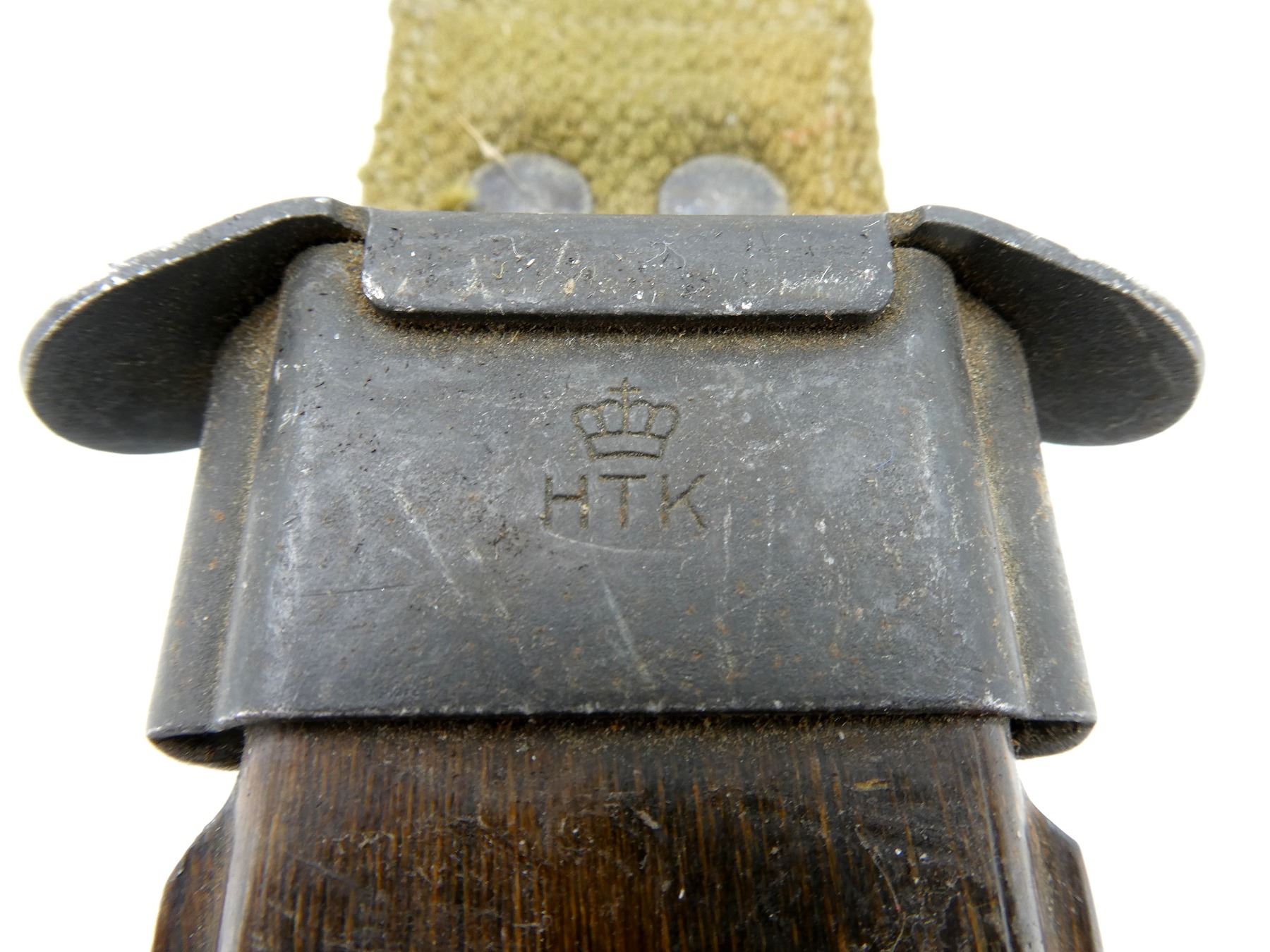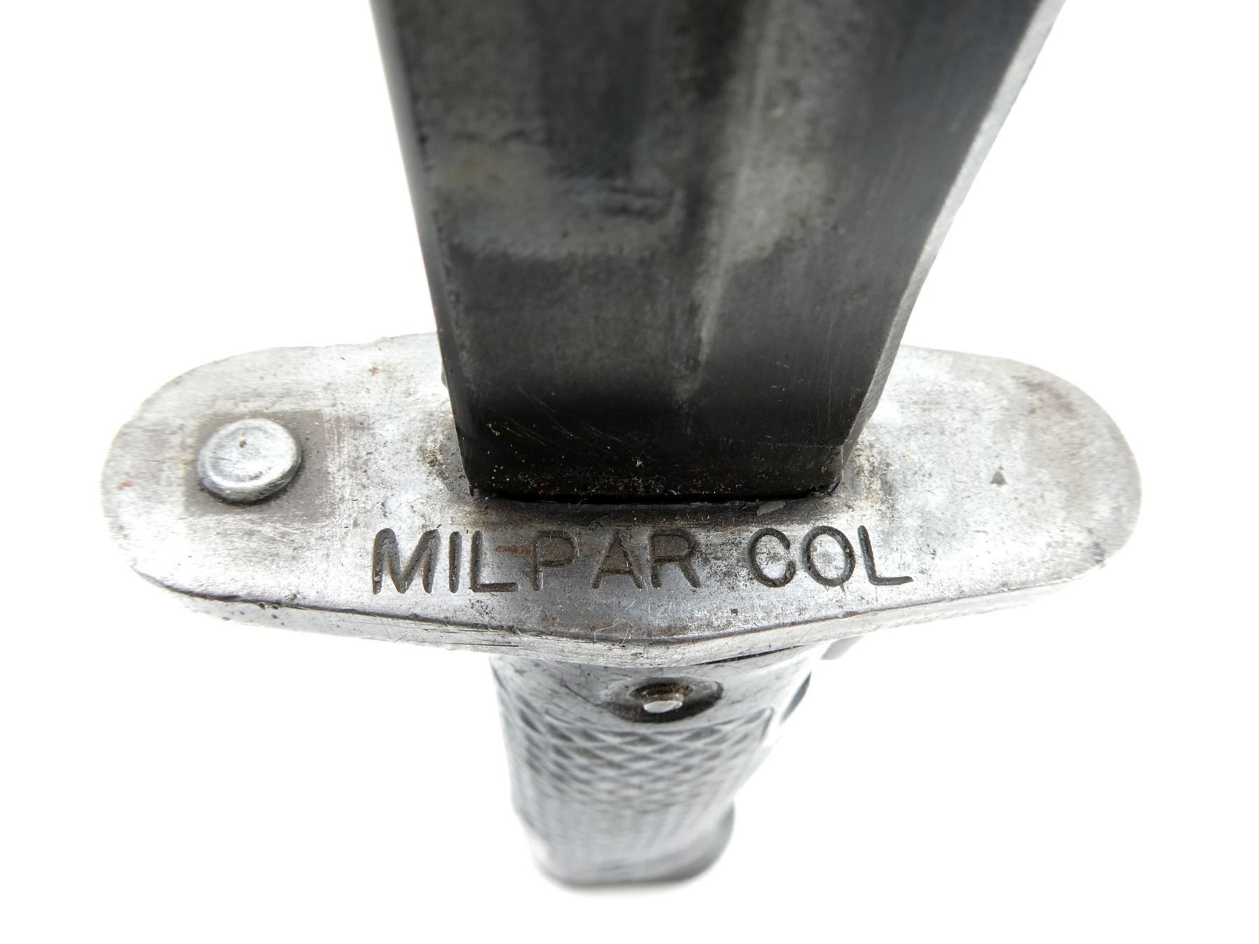 (1) FITS .30-06 M1 GARAND RIFLES, CROSS-PIECE MARKED: "U.S. M5A1, MILPAR COL", CROSS-PIECE IS LOOSE / MOVES, 2-PIECE BLACK CHECKERED GRIP, METAL POMMEL MARKED: "117", DUTCH MILITARY FIBERGLASS SCABBARD, MARKED: CROWN OVER "HTK", GREEN CANVAS FROG WITH PLASTIC BELT HOOKS, NO VISIBLE MARKINGS, BLADE APPROX. 6 5/8" & OVERALL LENGTH APPROX. 11.25". SEE PHOTOS.
