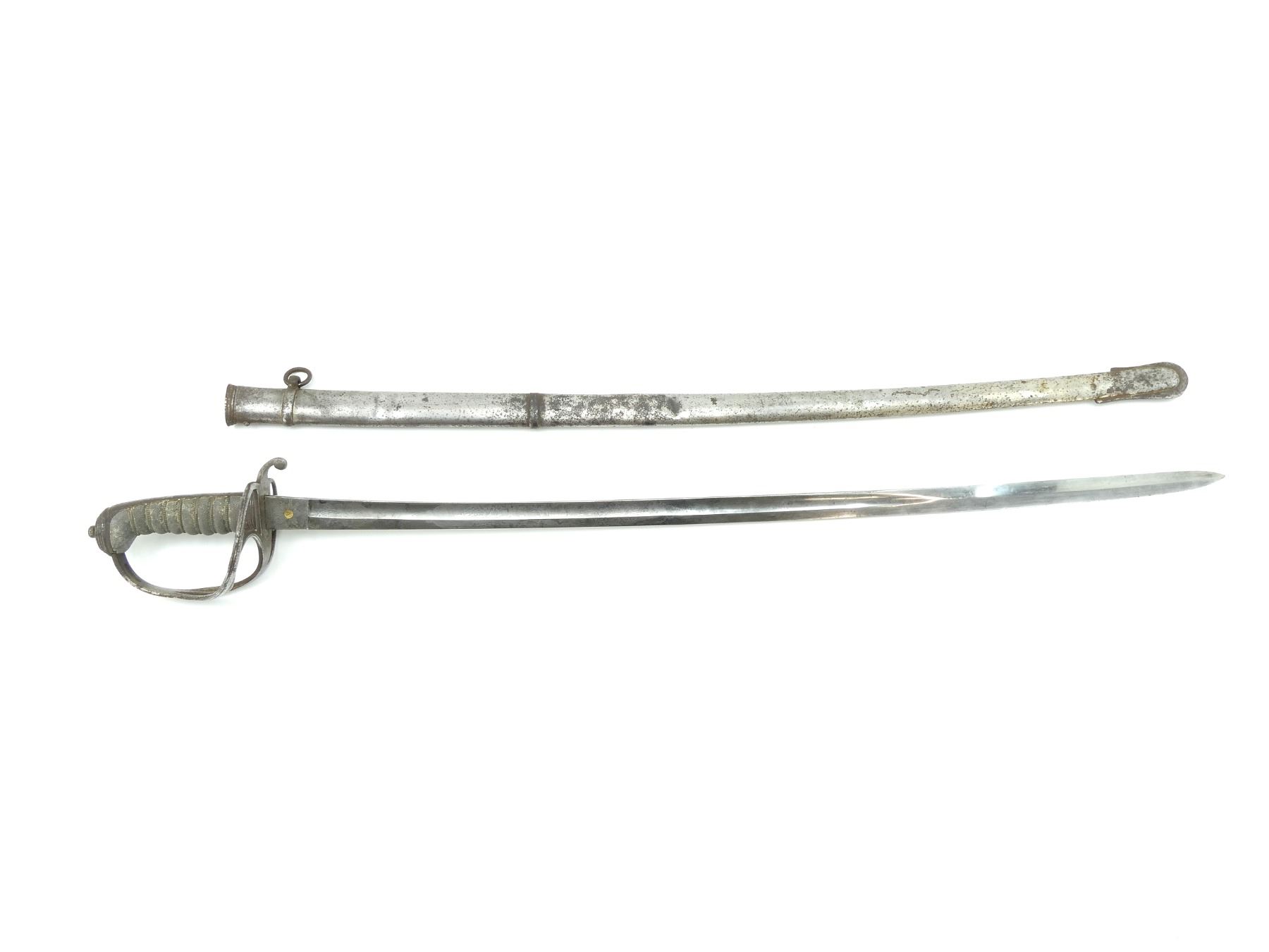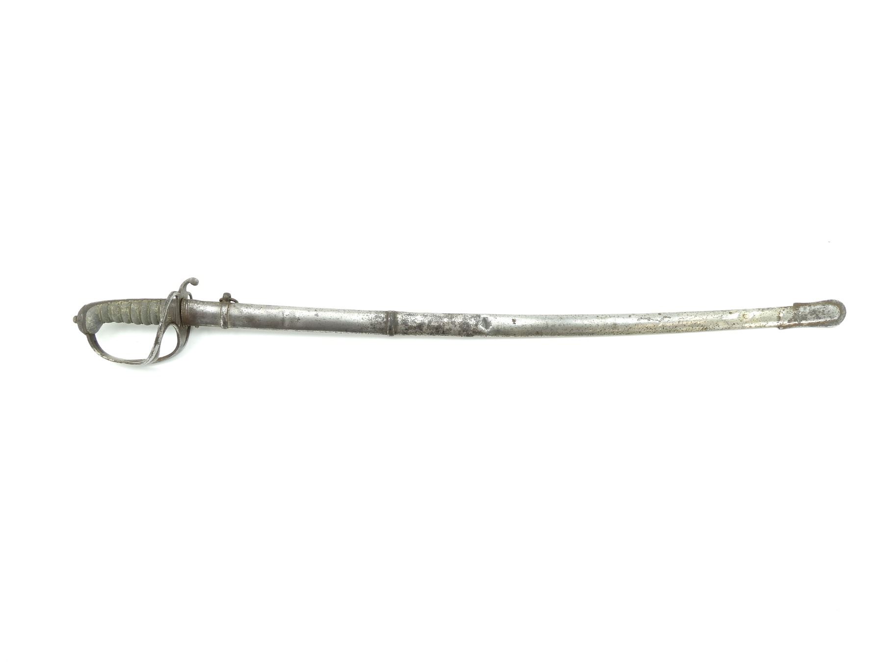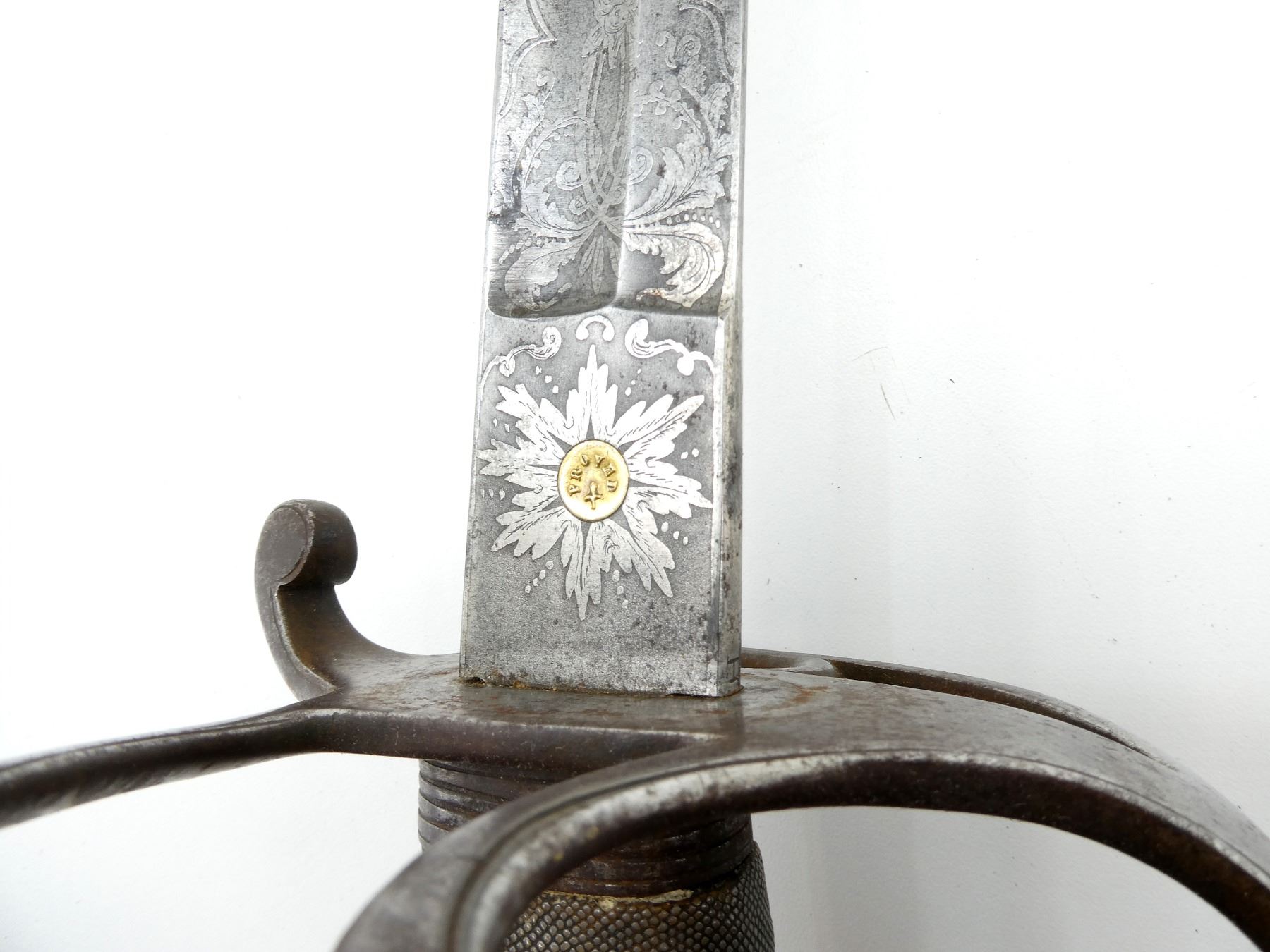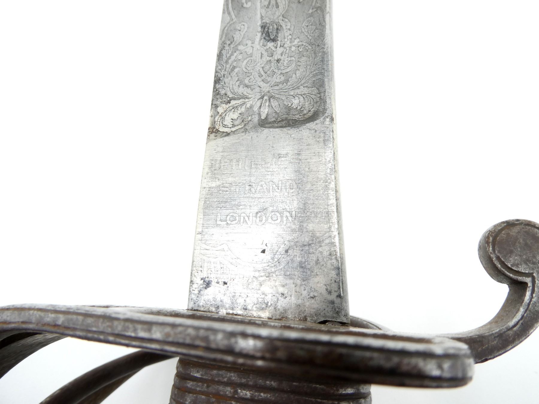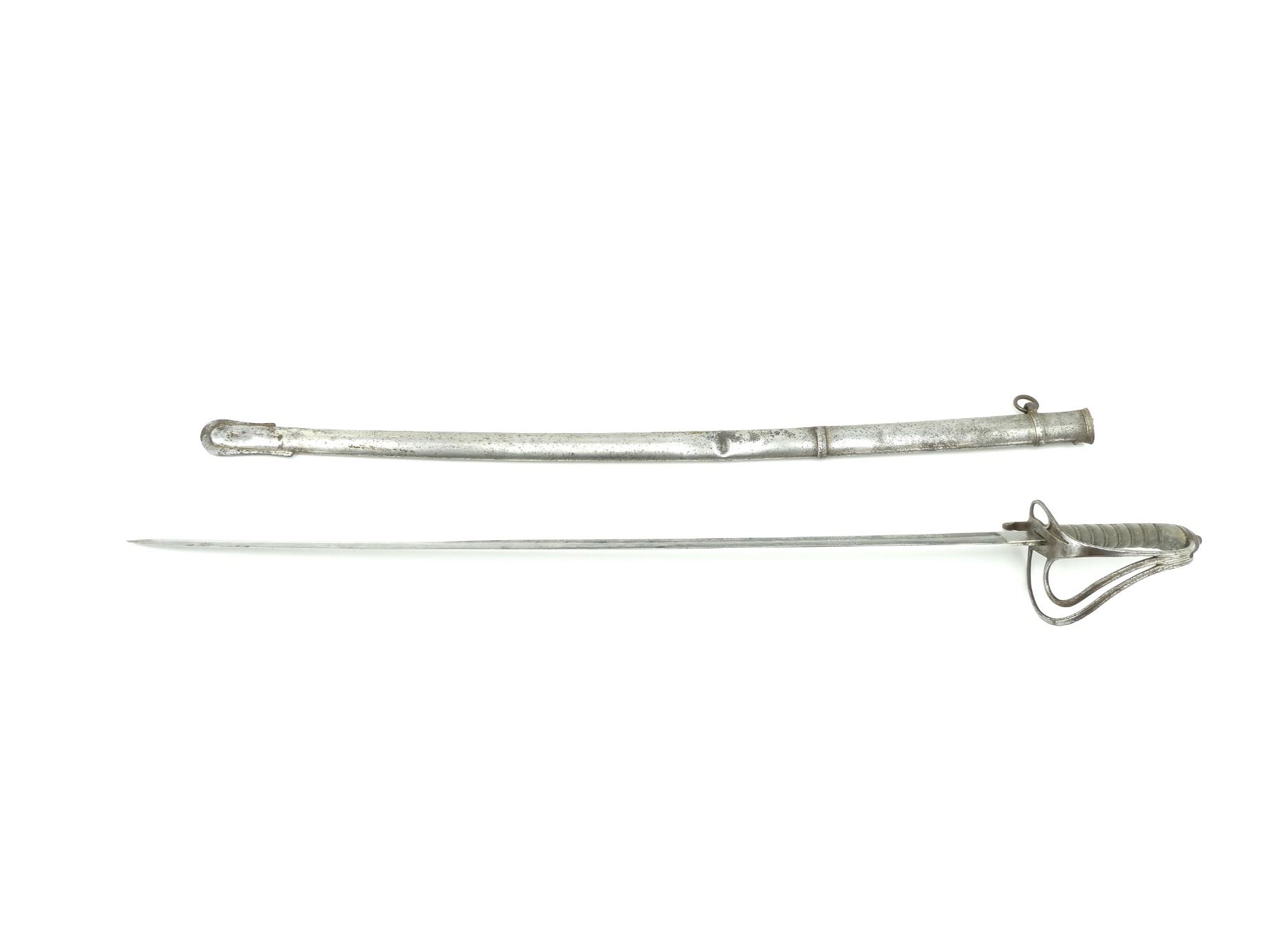 (1) SLIGHTLY CURVED SINGLE-FULLERED BLADE, RICASSO ACID ETCHED: "PHILLIPS, STRAND, LONDON", OTHER-SIDE RICASSO ACID ETCHED WITH FLORAL DESIGN WITH BRASS EMBLEM MARKED: "PROVED" IN THE CENTER, BLADE ACID ETCHED VICTORIAN CROWN OVER "VR" CYPHER WITH VARIOUS DECORATIVE FLORAL ETCHINGS ON EITHER SIDE, DECORATIVE STEEL CROSS-GUARD / HILT, NO VISIBLE MARKINGS, WIRE WRAPPED GRIP, METAL GRIP BACKING, METAL POMMEL, NO VISIBLE MARKINGS, STEEL SCABBARD WITH ONE HANGER, ONE IS MISSING, ONE THROAT SCREW IS MISSING / CRACKED ABOVE HOLE, VARIOUS DENTS, NO VISIBLE MARKINGS ON SCABBARD, BLADE APPROX. 34.75" & OVERALL LENGTH APPROX. 40.75". SEE PHOTOS.