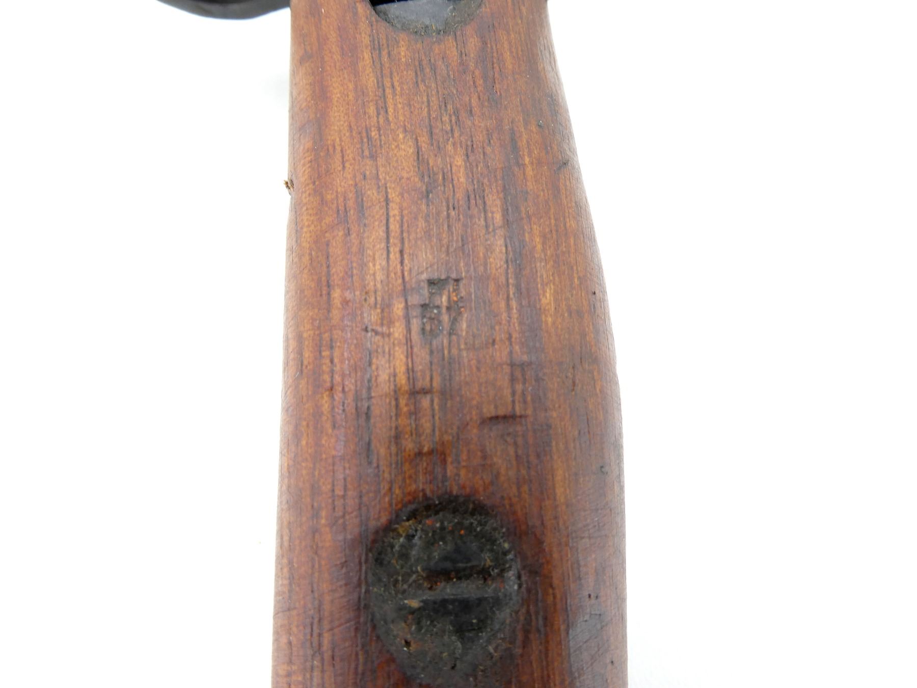 (1) FITS LEE ENFIELD NO.1 MKIII RIFLES, RICASSO MARKED: CROWN OVER "G.R.I" OVER "MK.II*" OVER "2 43" OVER "R.F.I", OTHER SIDE WITH VARIOUS PROOF MARKS, 2-PIECE WOODEN GRIP WITH FAINT PROOF MARK ON EITHER SIDE, METAL POMMEL, NO VISIBLE MARKINGS, LEATHER & METAL SCABBARD, NO VISIBLE MARKINGS, BLADE APPROX. 12" & OVERALL LENGTH APPROX. 16.75". SEE PHOTOS.