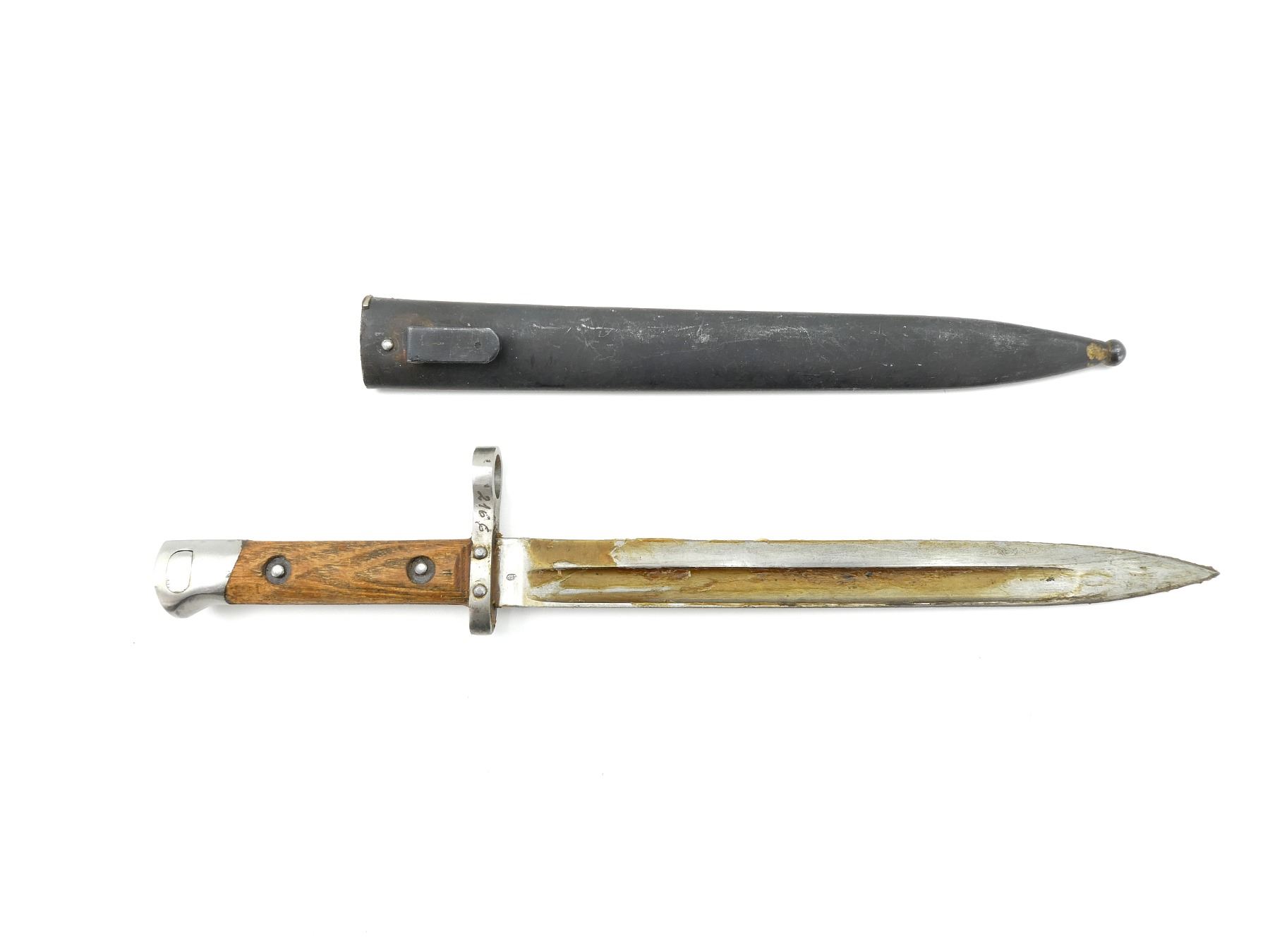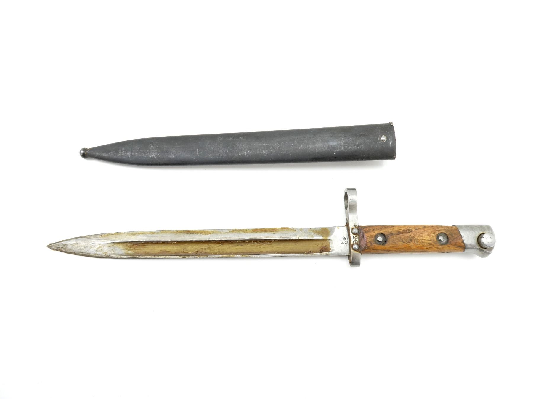 (1) FITS 8MM M1895 MANNLICHER RIFLES, RICASSO MARKED: "F.G., GY.", OTHER-SIDE MARKED WITH CREST PROOF MARK, CROSS-PIECE MARKED: "934 (CROSSED OUT), OTHER-SIDE MARKED: "2166", 2-PIECE WOODEN GRIP, METAL POMMEL, NO VISIBLE MARKINGS, STEEL SCABBARD, PROOF MARK ON STUD, BLADE APPROX. 9.5" & OVERALL LENGTH APPROX. 13 7/8". SEE PHOTOS.