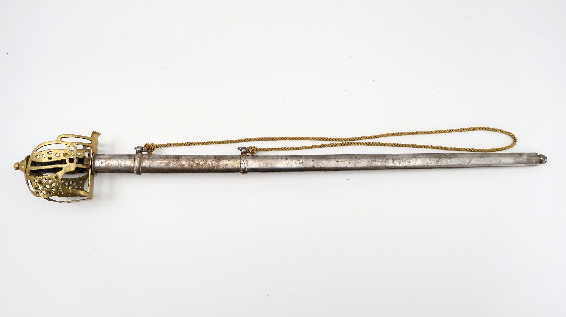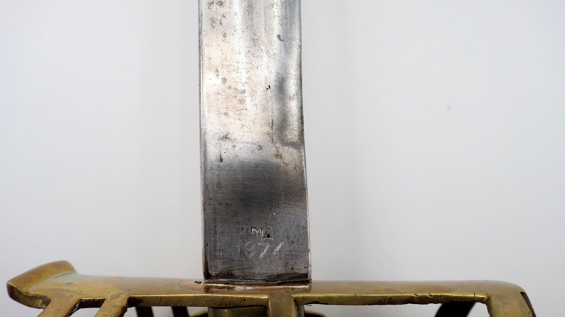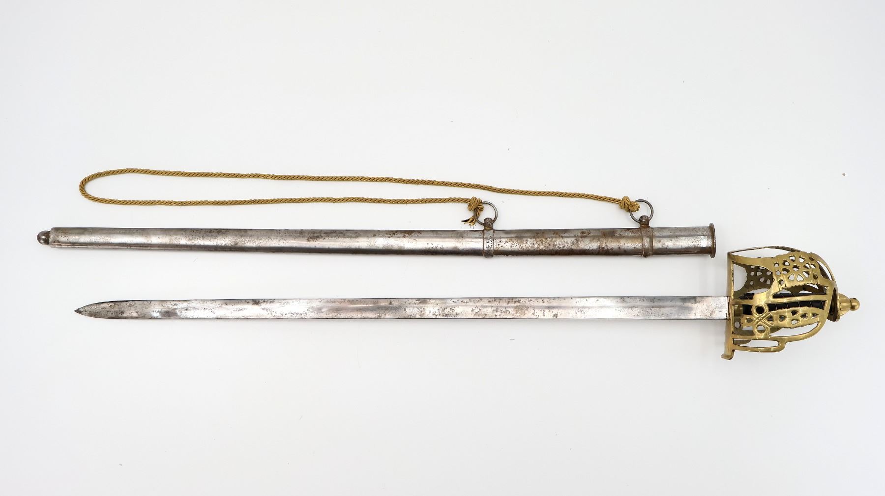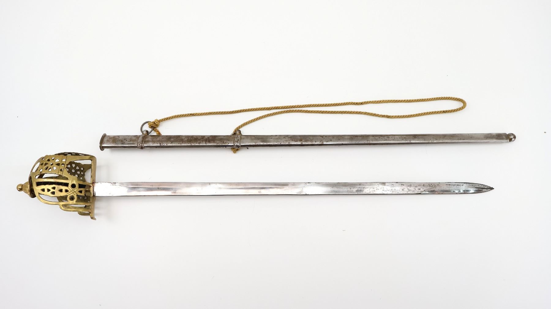 (1) SINGLE-FULLERED STRAIGHT BLADE WITH DOUBLE-EDGED BLADE TIP, RICASSO MARKED: "INDIA" WITH HAND-ETCHED: "1874" UNDERNEATH, MISSING BUFFER PAD / WASHER, DECORATIVE BRASS BASKET HILT, NO VISIBLE MARKINGS, WIRE & LEATHER WRAPPED GRIP, BRASS POMMEL, NO VISIBLE MARKINGS, METAL SCABBARD WITH TWO HANGER LOOPS, TWISTED ROPE CORD ATTACHED, NO VISIBLE MARKINGS, BLADE APPROX. 33 3/8" & OVERALL LENGTH APPROX. 39.25". SEE PHOTOS.