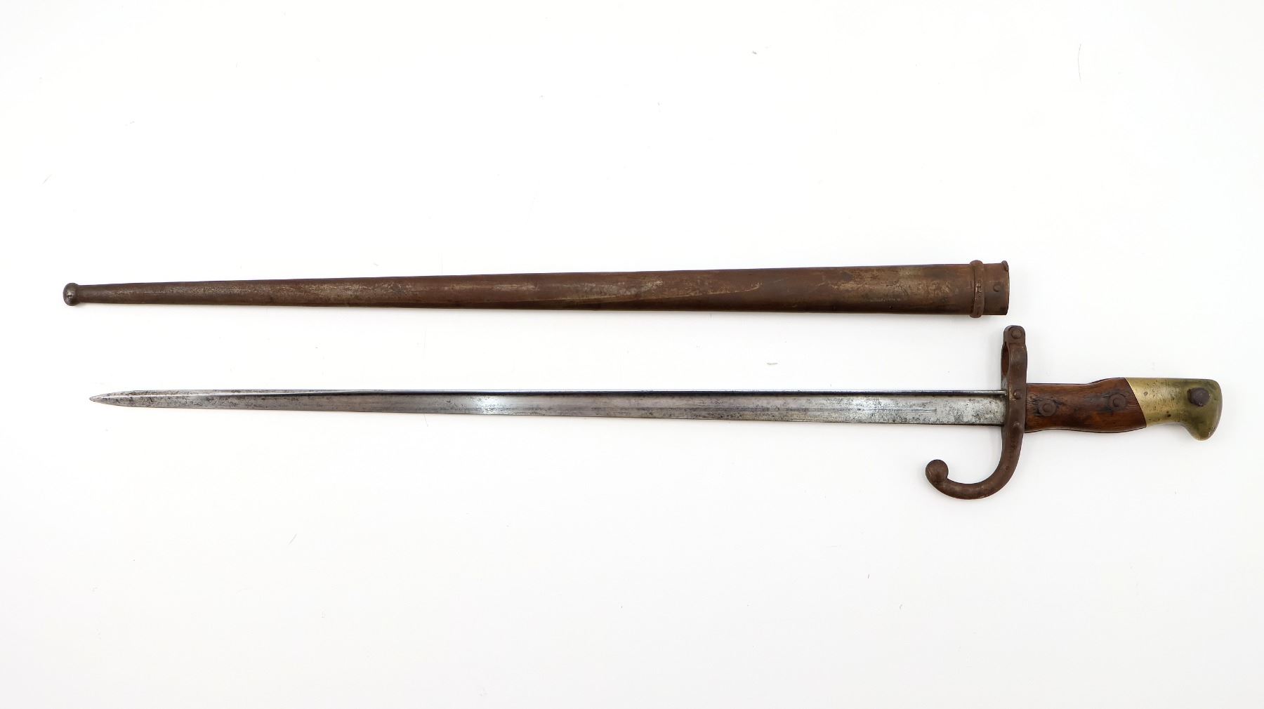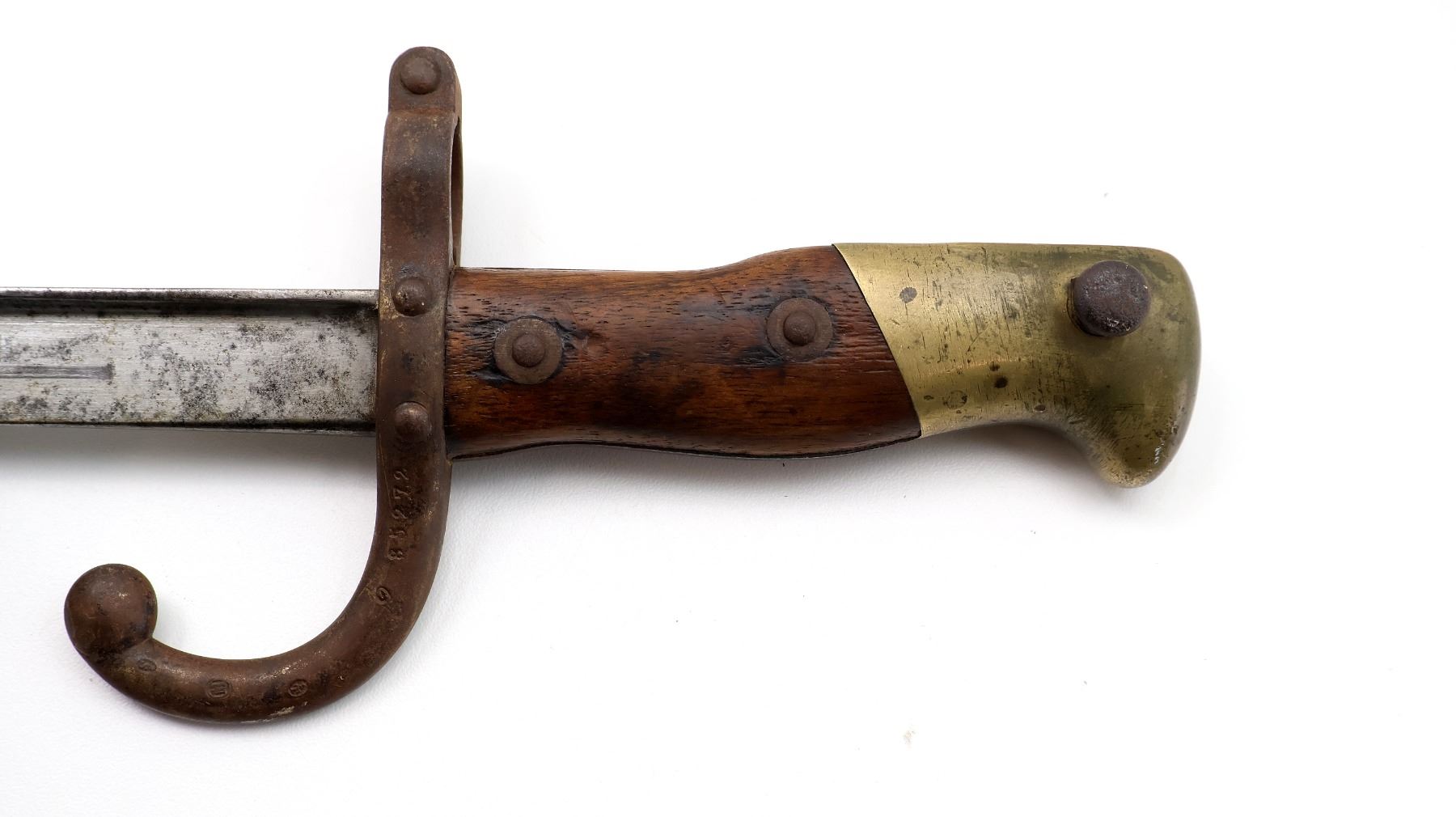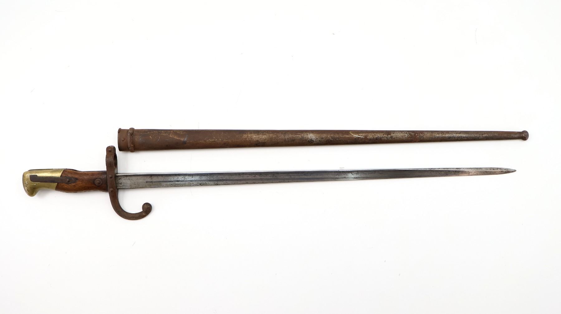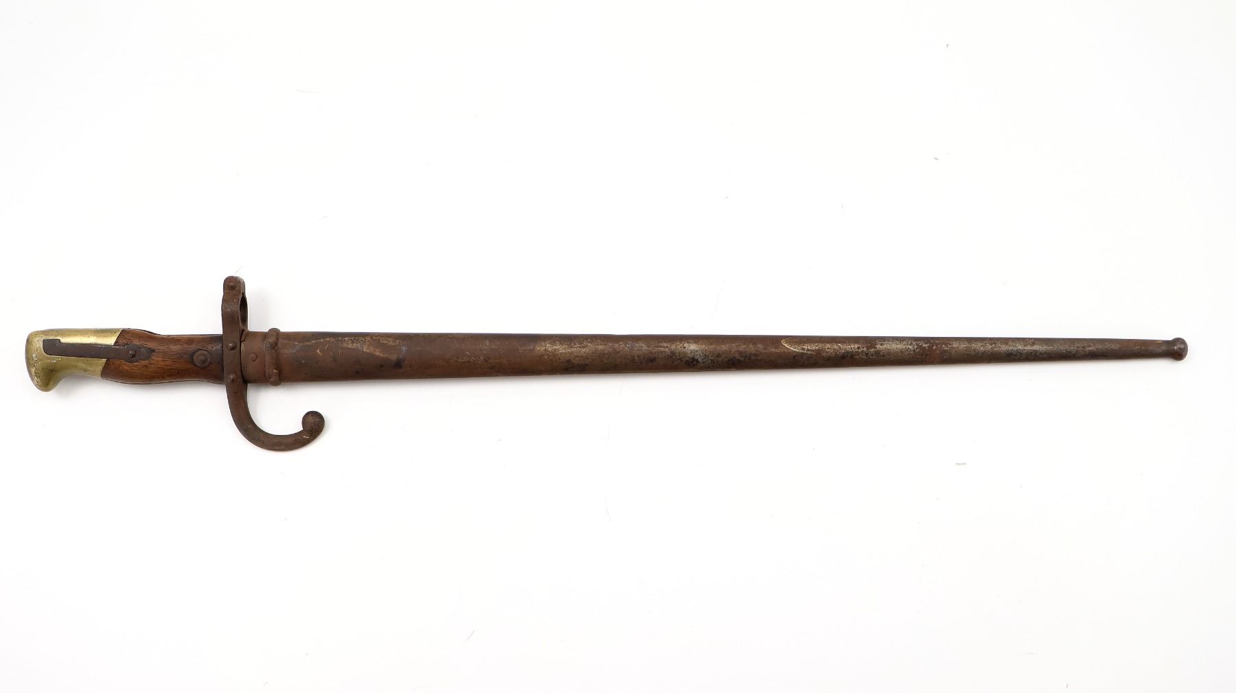 (1) FITS 11MM M1874 GRAS RIFLES, RICASSO MARKED WITH MAKER'S MARKS, SPINE MARKED: "MRE D'ARMES DE ST. ETIENNE JUILLET 1880", CROSS-PIECE MARKED: "L 85272" & VARIOUS MAKER'S MARKS, HOOKED QUILLON, 2-PIECE WOOD GRIP, BRASS POMMEL, NO VISIBLE MARKINGS, VARIOUS MAKER'S MARKS IN SLOT ON BRASS POMMEL, METAL SCABBARD MARKED: "? 67106", VARIOUS PROOF MARKS ON SCABBARD BALL TIP / NEAR THROAT, BLADE APPROX. 20 5/8" & OVERALL LENGTH APPROX. 25.5". SEE PHOTOS.