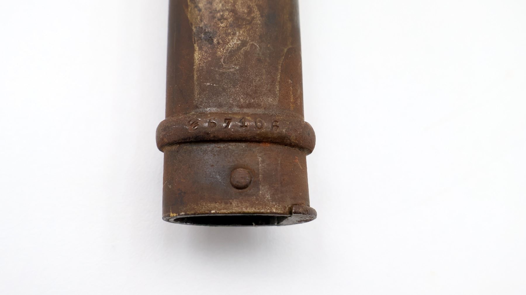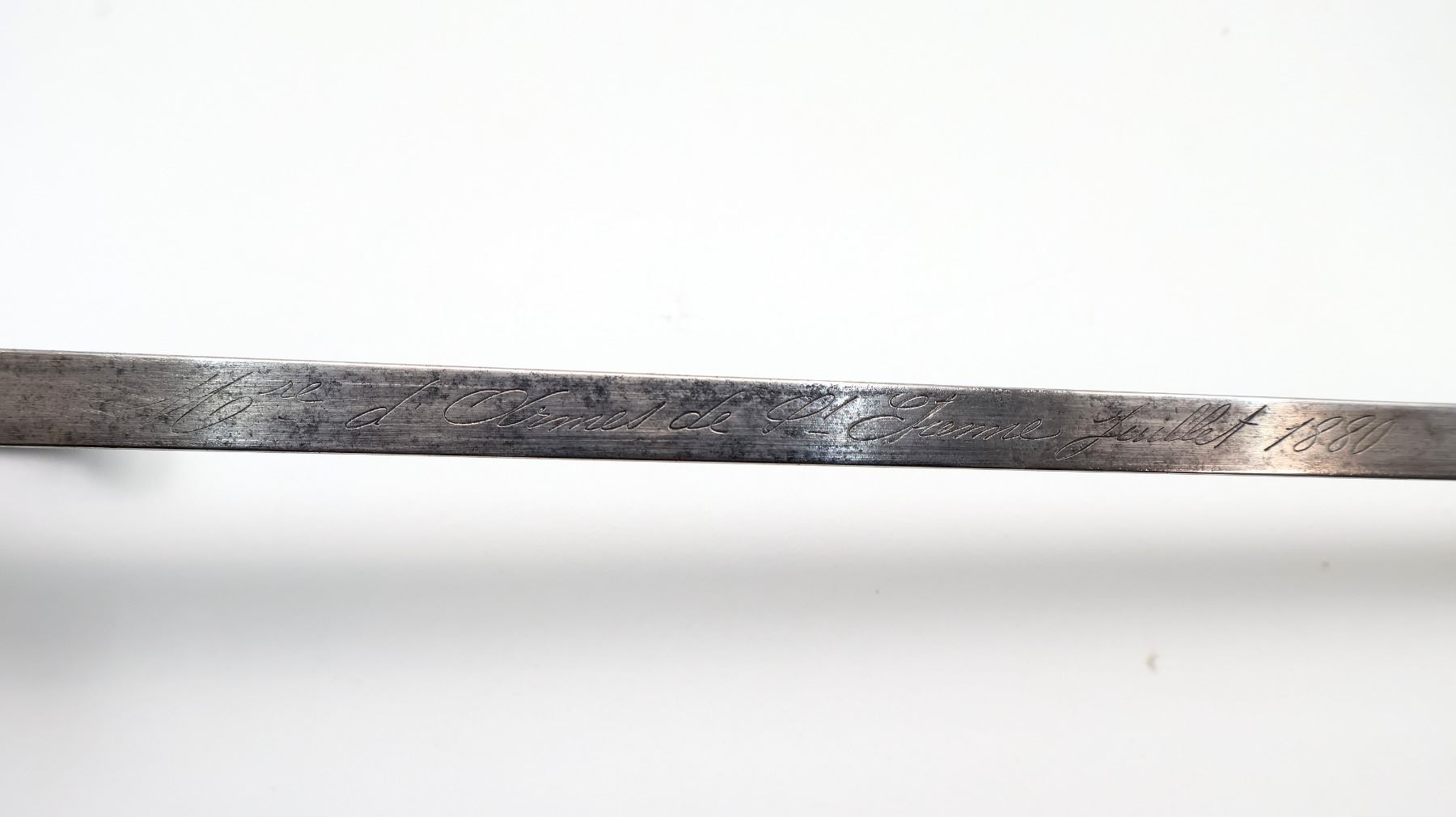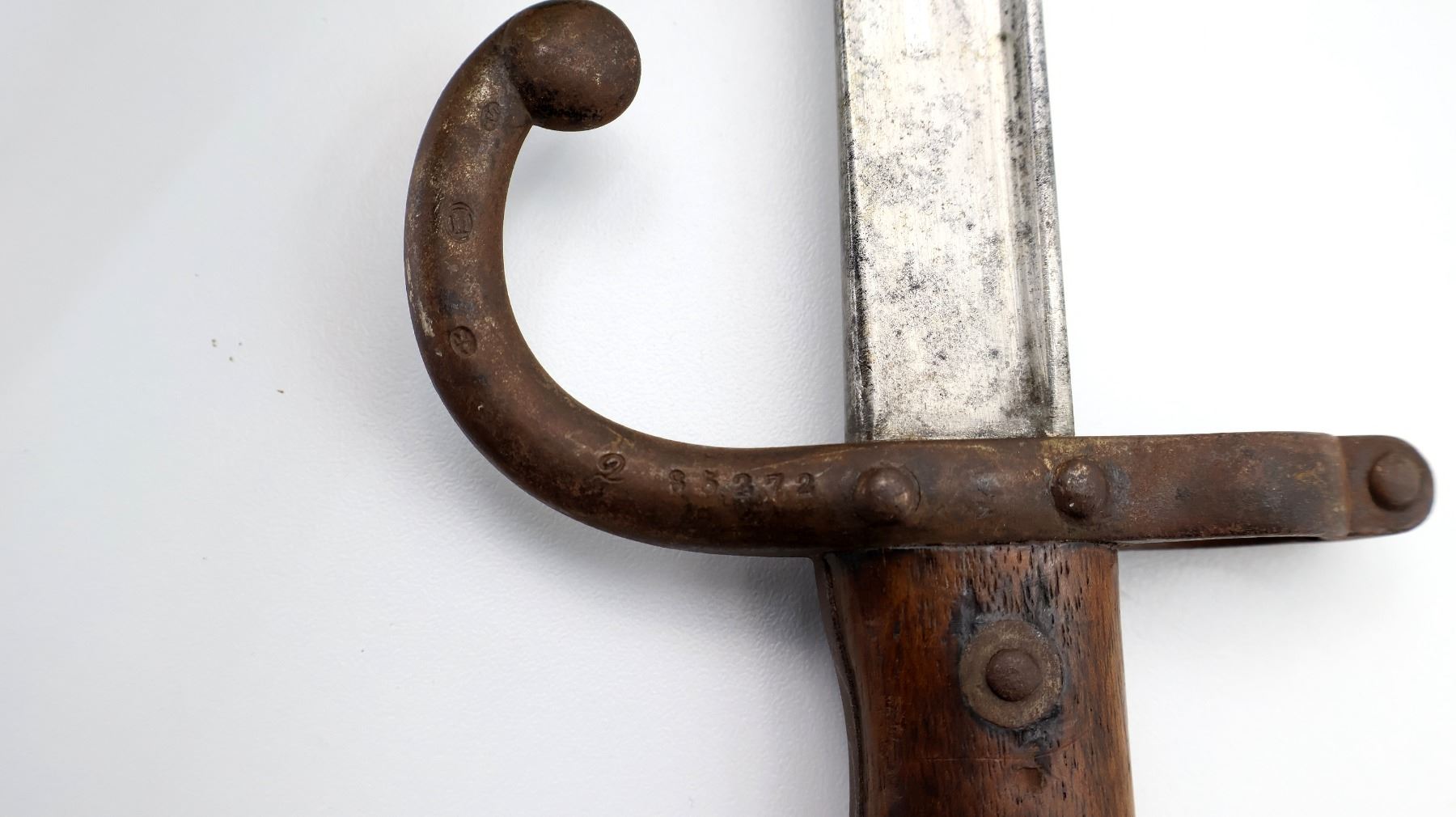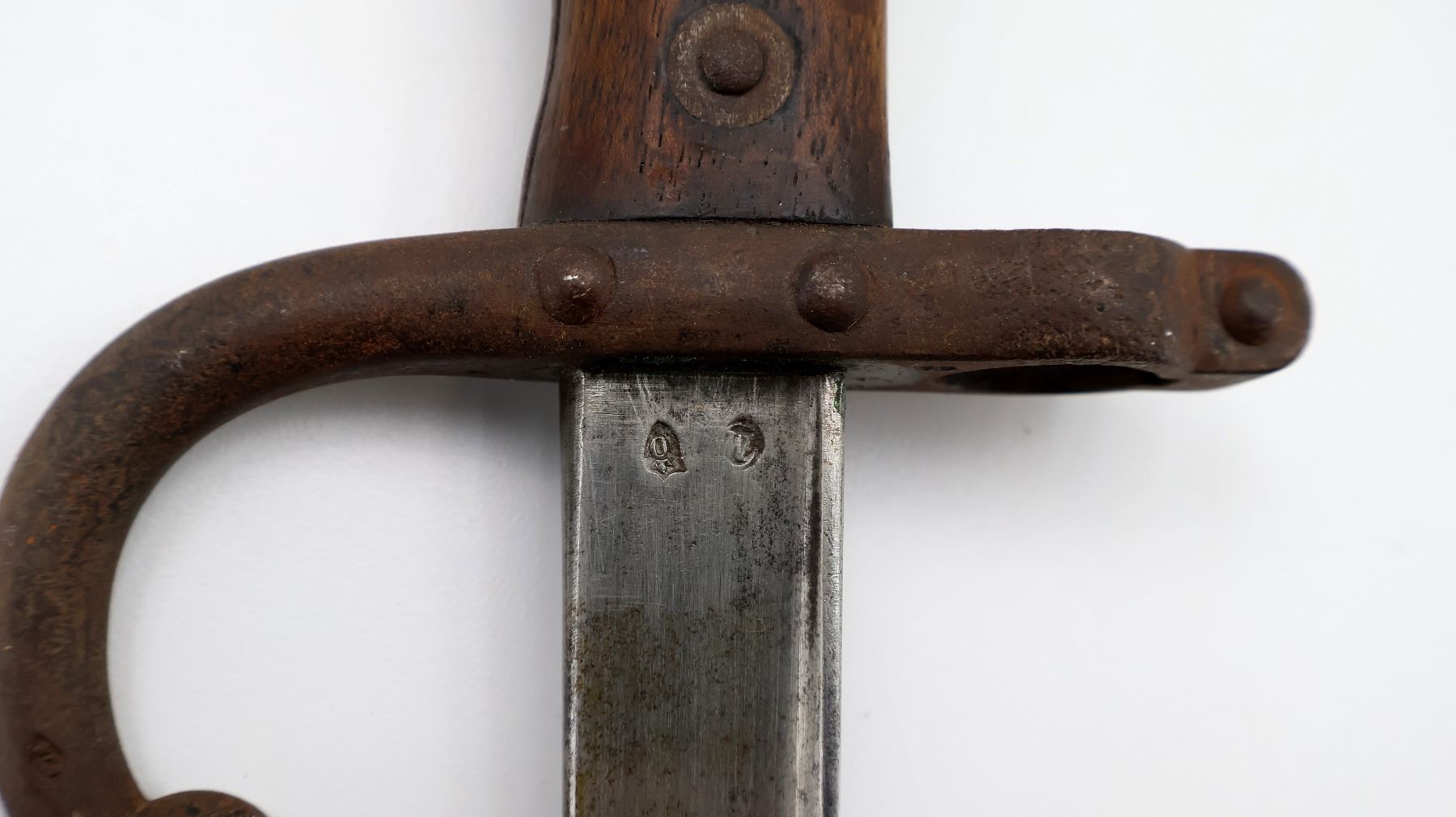 (1) FITS 11MM M1874 GRAS RIFLES, RICASSO MARKED WITH MAKER'S MARKS, SPINE MARKED: "MRE D'ARMES DE ST. ETIENNE JUILLET 1880", CROSS-PIECE MARKED: "L 85272" & VARIOUS MAKER'S MARKS, HOOKED QUILLON, 2-PIECE WOOD GRIP, BRASS POMMEL, NO VISIBLE MARKINGS, VARIOUS MAKER'S MARKS IN SLOT ON BRASS POMMEL, METAL SCABBARD MARKED: "? 67106", VARIOUS PROOF MARKS ON SCABBARD BALL TIP / NEAR THROAT, BLADE APPROX. 20 5/8" & OVERALL LENGTH APPROX. 25.5". SEE PHOTOS.