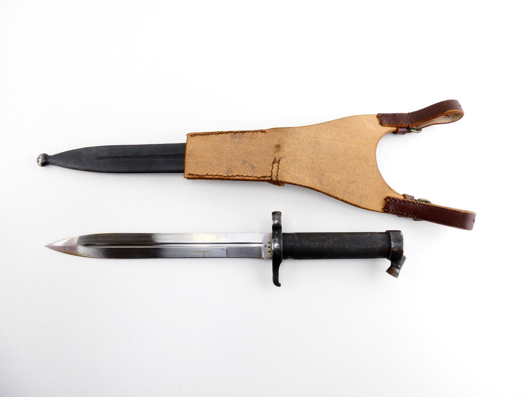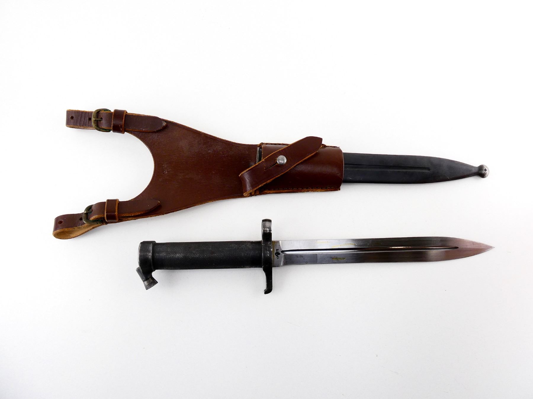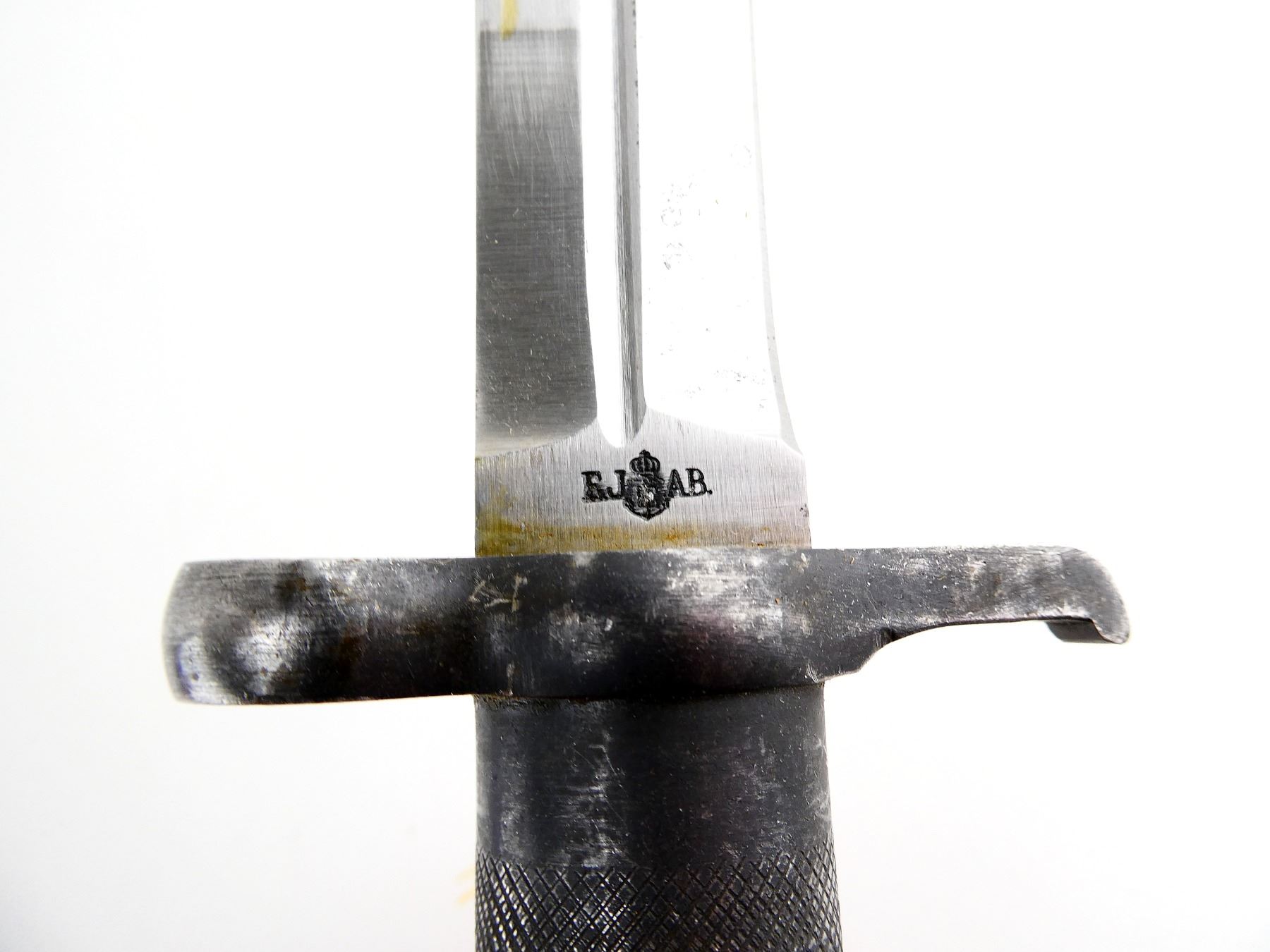 (1) FITS 6.5MM M1896, M1938 SHORT & AG42B LJUNGMAN SELF-LOADING RIFLES, RICASSO MARKED: "EJ" CROWN OVER ANCHOR "AB", OTHER SIDE MARKED: CROWN OVER "330", CROSS-PIECE MARKED: "EJ" CROWN OVER ANCHOR "AB" WITH CROWN PROOF MARK, METAL GRIP/POMMEL, NO VISIBLE MARKINGS, STEEL SCABBARD, THROAT MARKED: CROWN OVER "C", "968", BALL TIP MARKED: CROWN PROOF MARK, "184", BROWN LEATHER FROG MARKED WITH THREE CROWNS, BLADE APPROX. 8 3/8" & OVERALL LENGTH APPROX. 13.25". SEE PHOTOS.