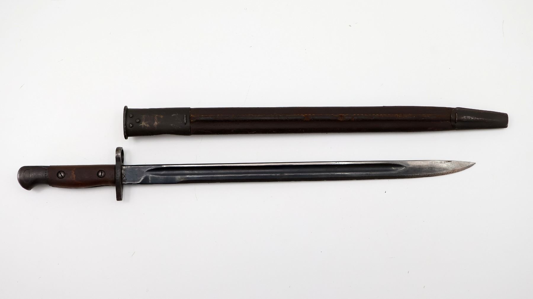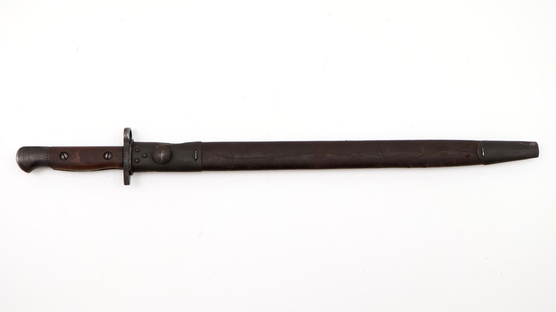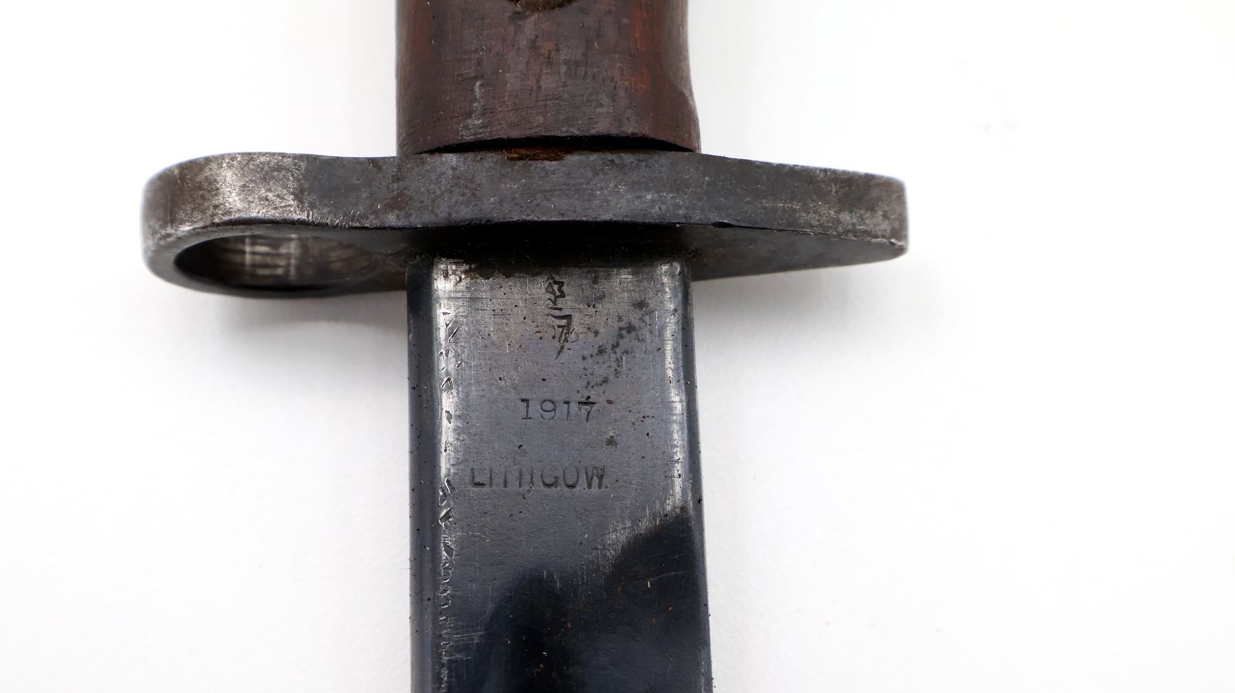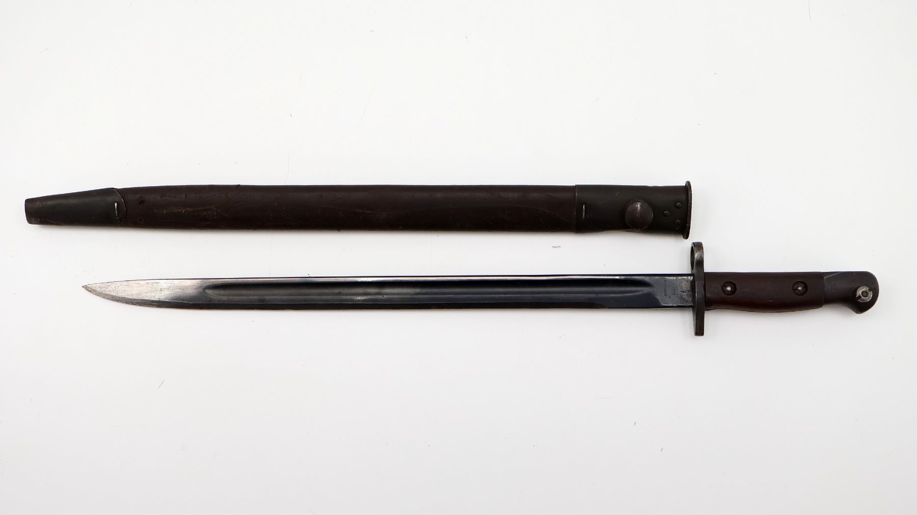 (1) FITS LEE ENFIELD NO.1 MKIII RIFLES, RICASSO MARKED: "A" IN A STAR OVER "??07" PARTIAL MARKING OVER "1917" OVER "LITHGOW" OTHER-SIDE MARKED: "A" IN A STAR (TWICE), "L" IN A SHIELD, "X (BEND TEST)", CROSS-PIECE MARKED: "3.M.D, 47803", 2-PIECE WOOD GRIP, NO VISIBLE MARKINGS, METAL POMMEL MARKED: "12705", LEATHER & STEEL SCABBARD, LEATHER MARKED: "MANGROVITE 44", STEEL ENDS MARKED: "OA", BLADE APPROX. 16 7/8" & OVERALL LENGTH APPROX. 21.75". SEE PHOTOS.