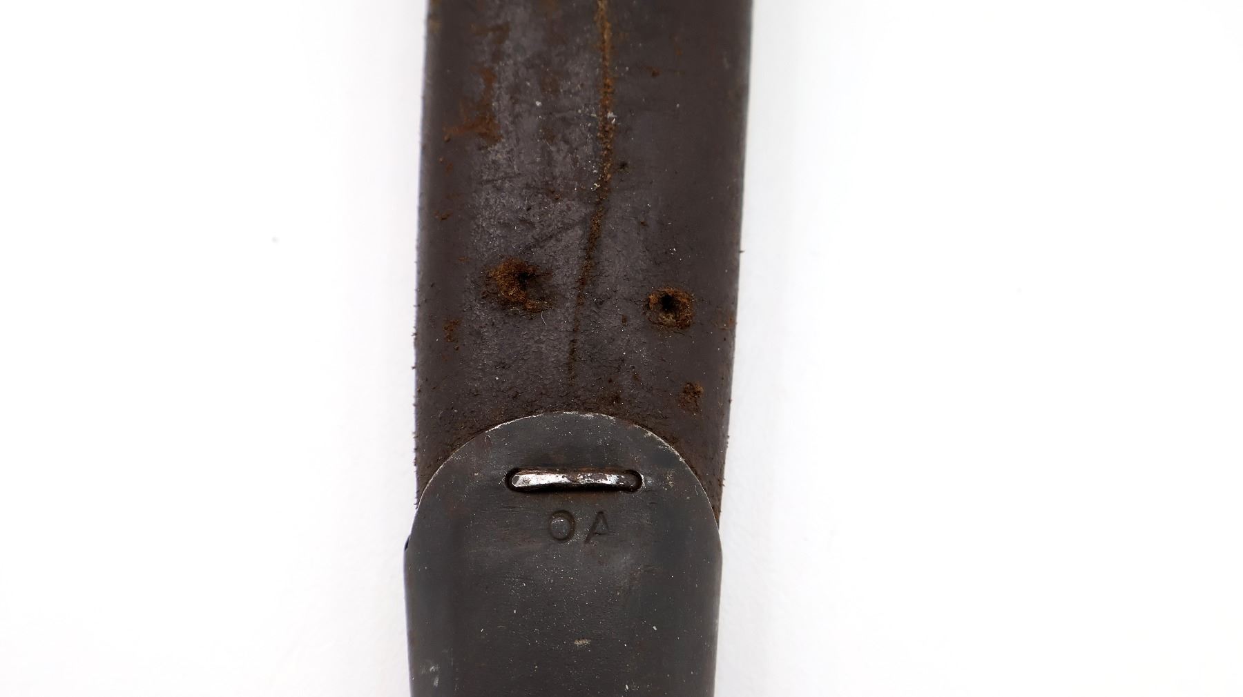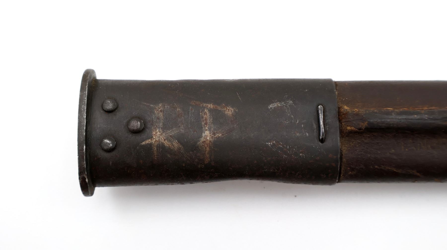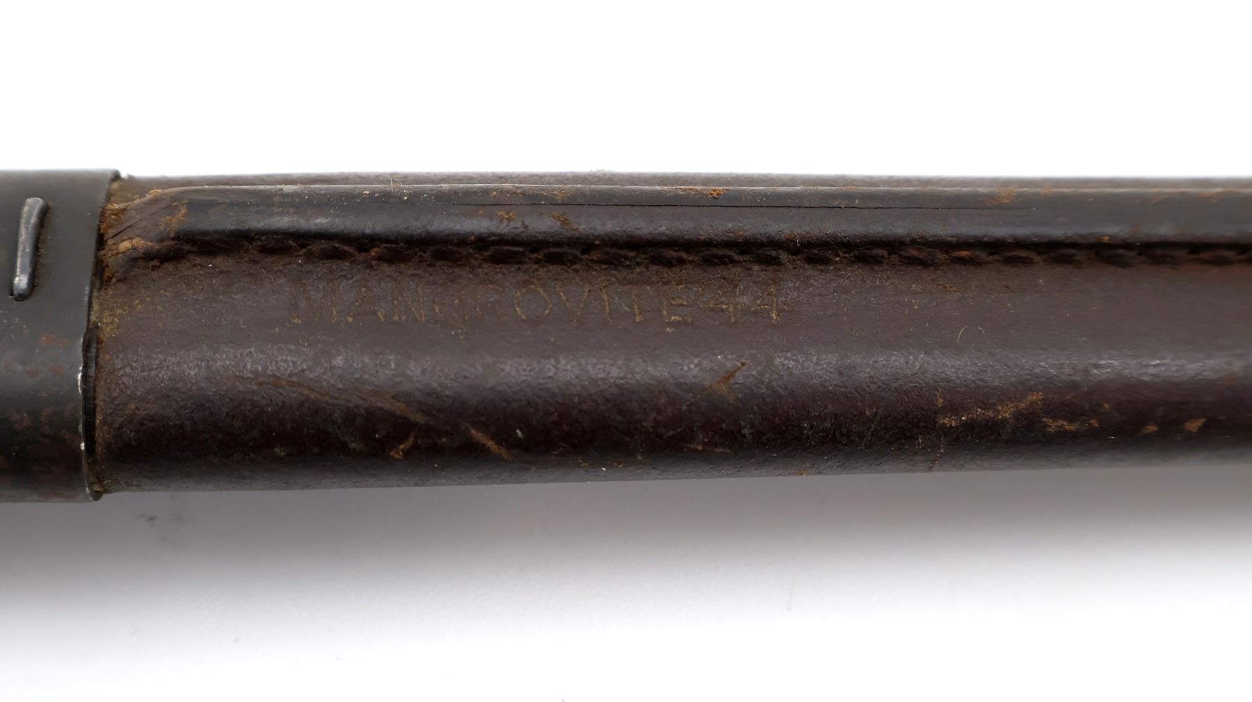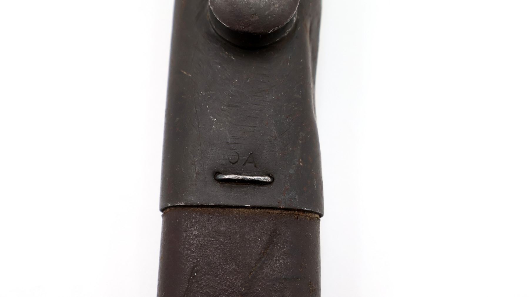 (1) FITS LEE ENFIELD NO.1 MKIII RIFLES, RICASSO MARKED: "A" IN A STAR OVER "??07" PARTIAL MARKING OVER "1917" OVER "LITHGOW" OTHER-SIDE MARKED: "A" IN A STAR (TWICE), "L" IN A SHIELD, "X (BEND TEST)", CROSS-PIECE MARKED: "3.M.D, 47803", 2-PIECE WOOD GRIP, NO VISIBLE MARKINGS, METAL POMMEL MARKED: "12705", LEATHER & STEEL SCABBARD, LEATHER MARKED: "MANGROVITE 44", STEEL ENDS MARKED: "OA", BLADE APPROX. 16 7/8" & OVERALL LENGTH APPROX. 21.75". SEE PHOTOS.