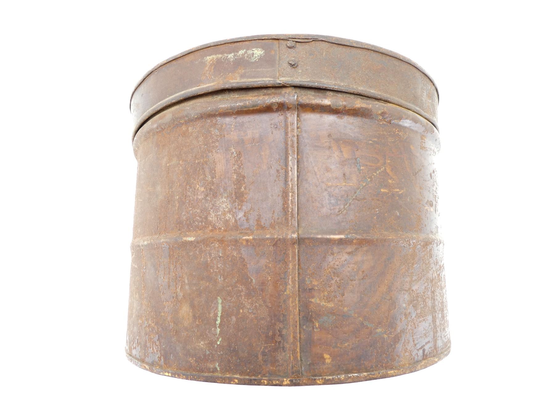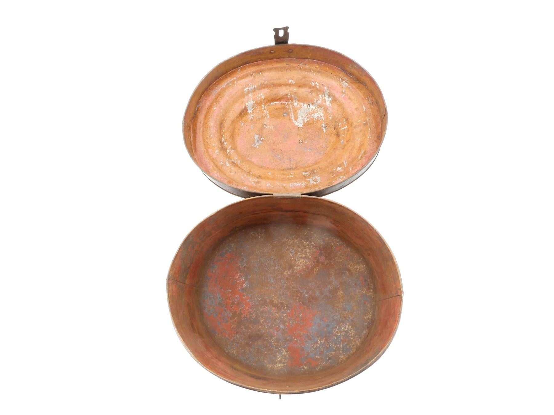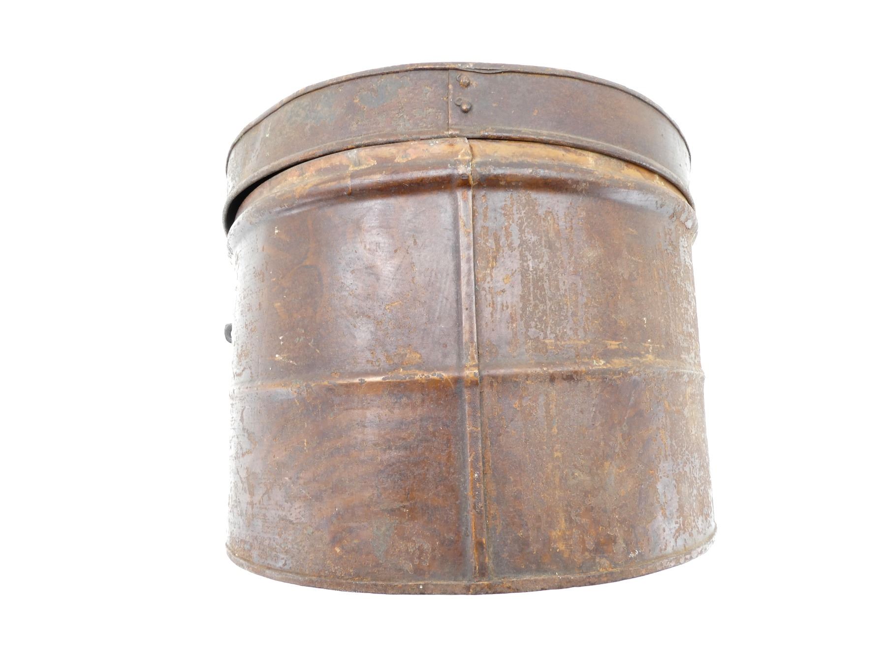 (1) BROWN / RED PAINTED METAL HEAD WEAR STORAGE TIN, NO VISIBLE MARKINGS, METAL LATCH CLOSURE, METAL CARRY HANDLE, SHOWS AGE / WEAR / TEAR, APPROX. 14.25" X 12" X 10.25". SEE PHOTOS.