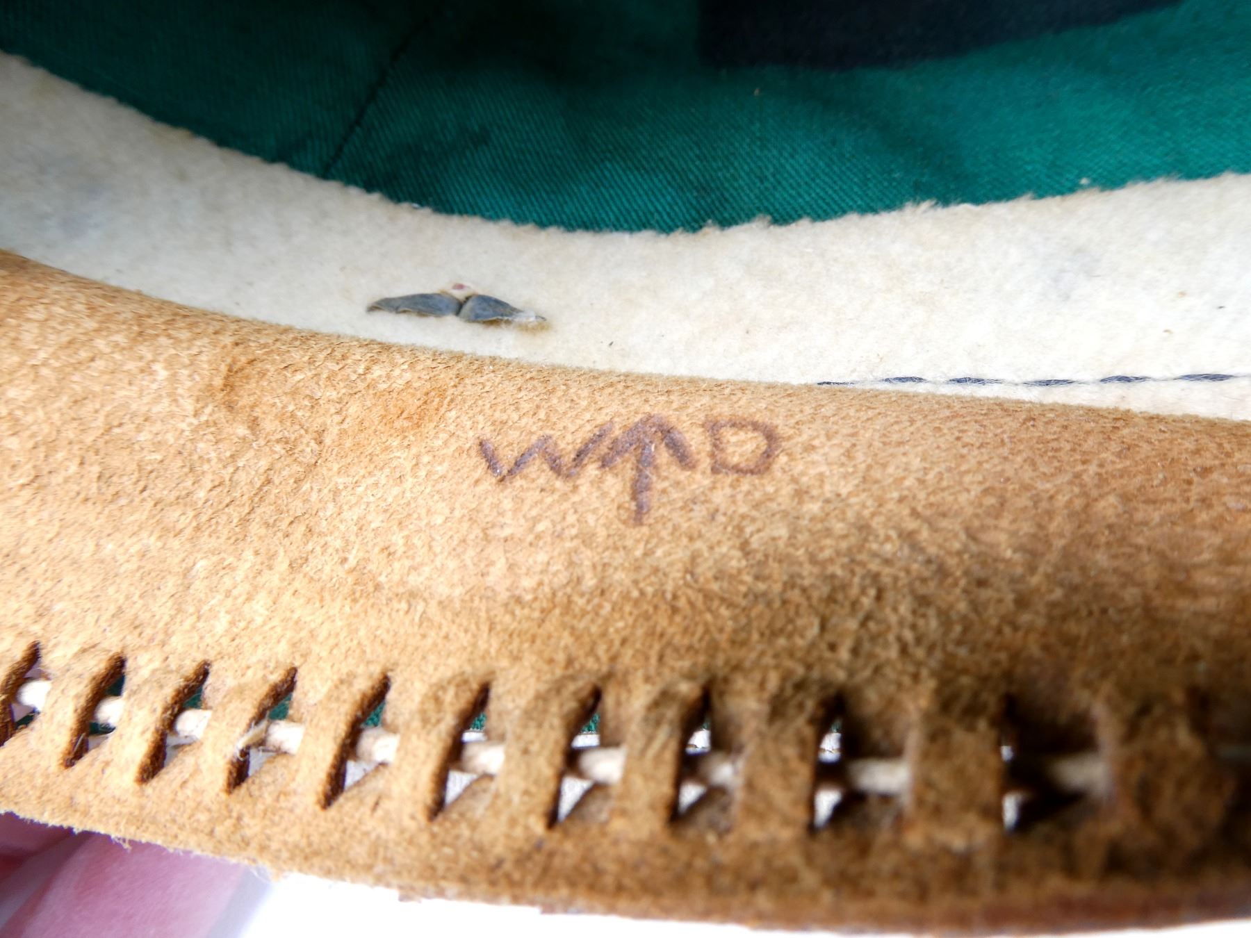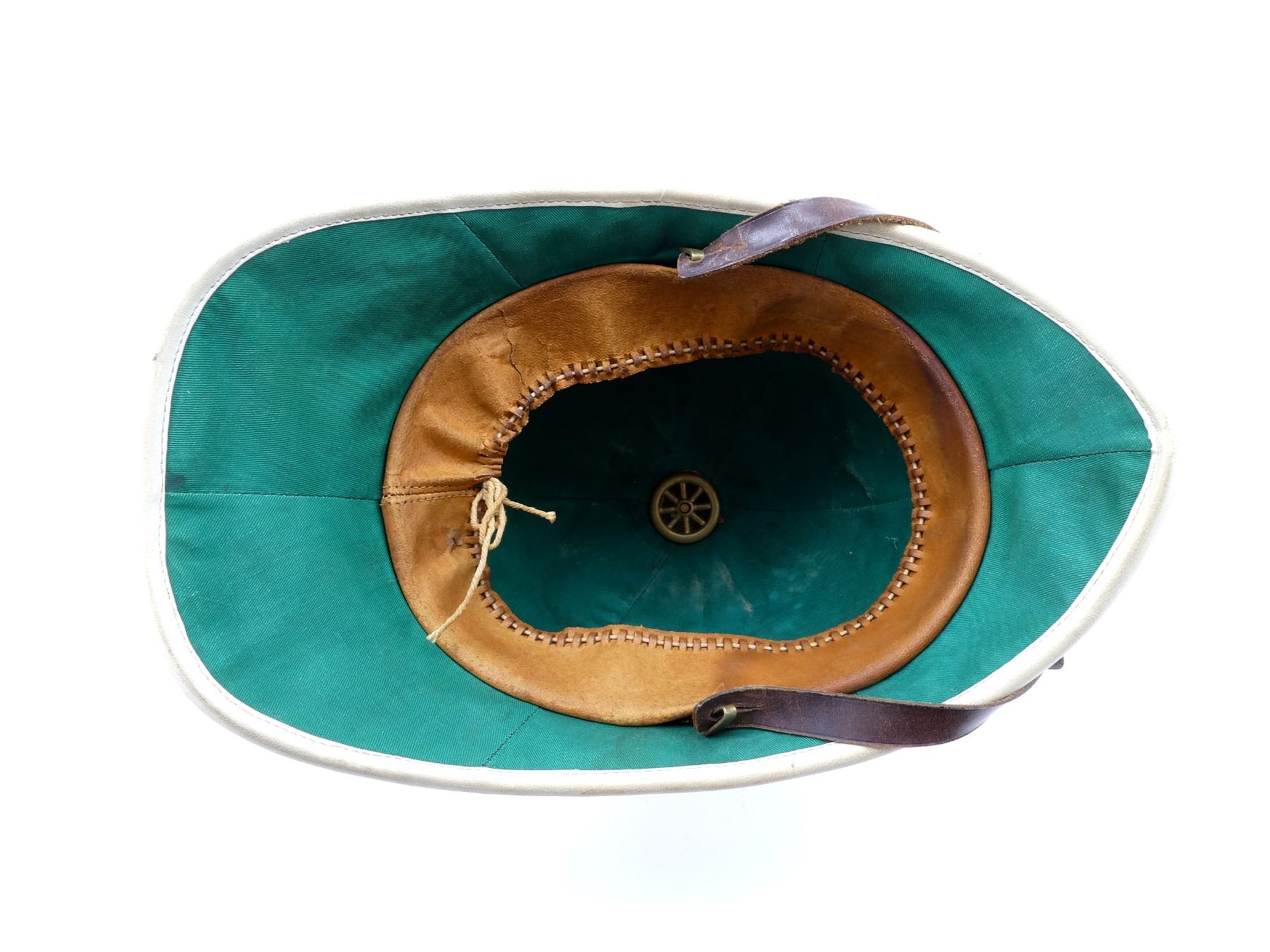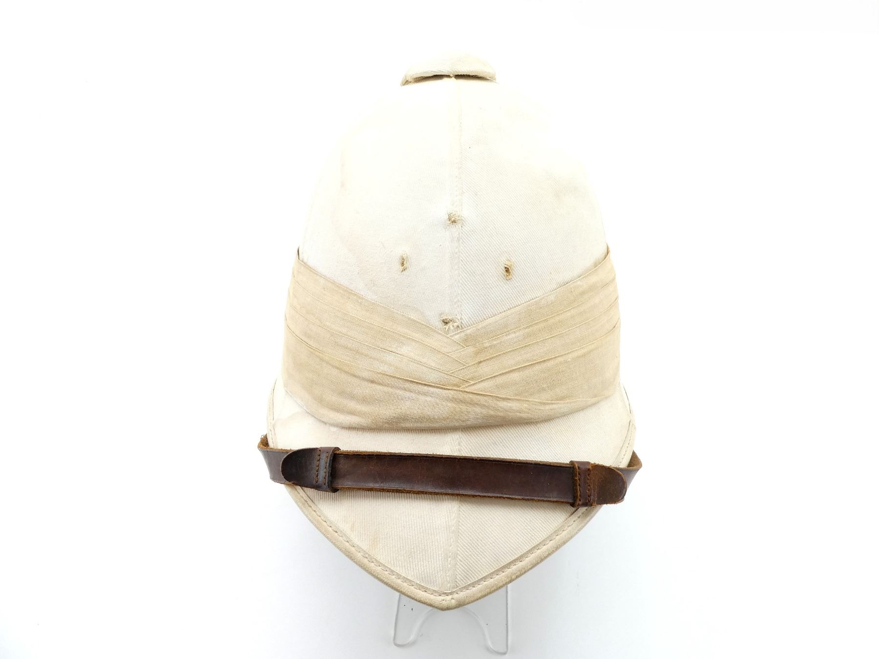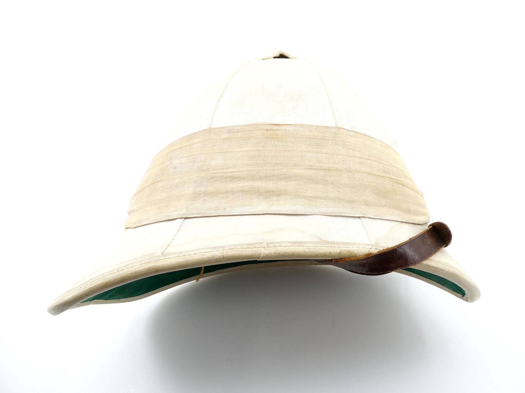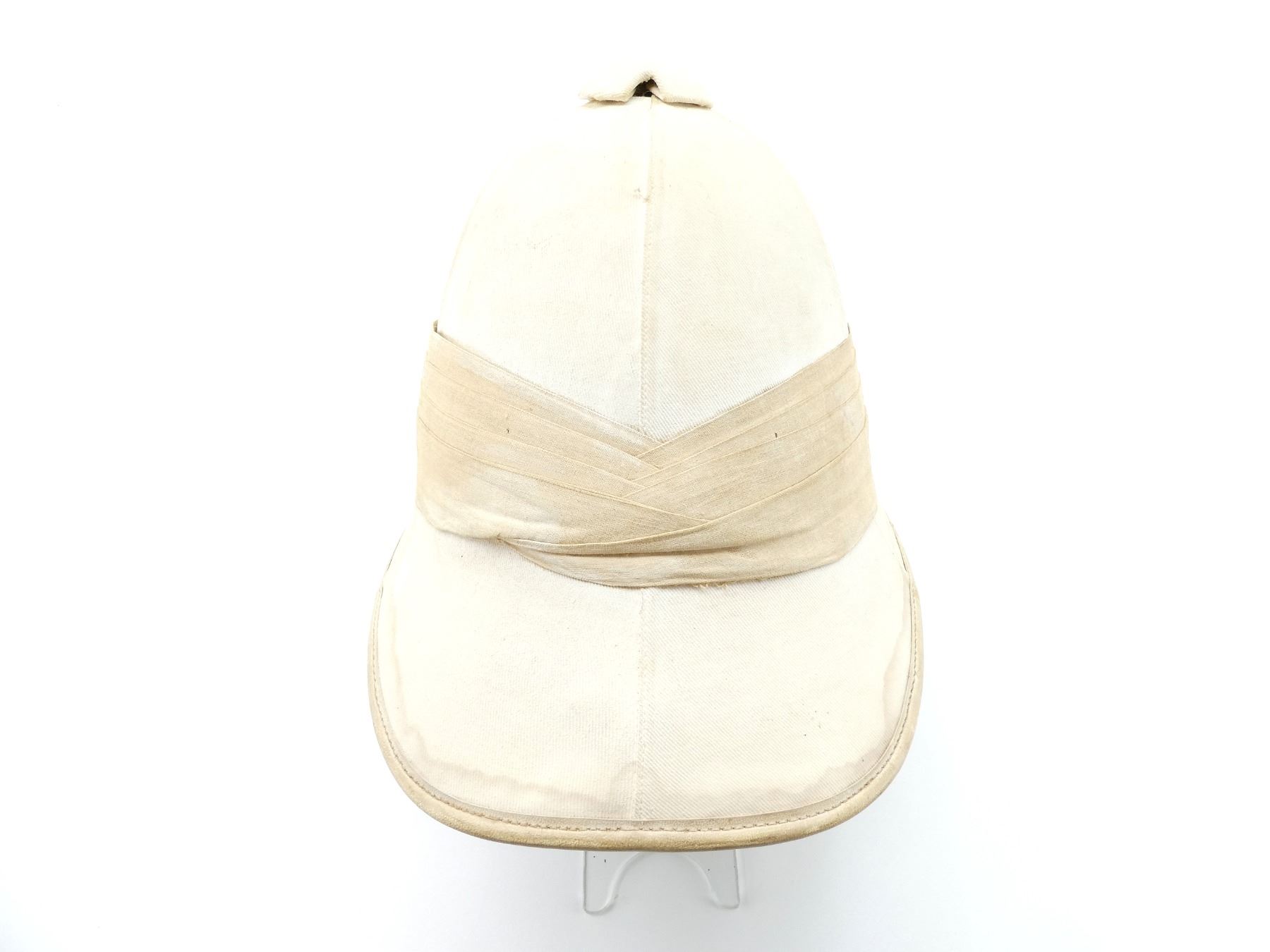 (1) WHITE COTTON AND/OR CANVAS COVERED HELMET WITH PUGGAREE, COTTON / CANVAS VENT, GREEN COTTON / LINEN LINING, BROWN LEATHER HEAD BAND, LEATHER IS SOFT, BAND MARKED: "W" BROAD ARROW "D", BROWN LEATHER CHIN STRAP WITH VARIOUS HAND-WRITTEN MARKINGS, SHOWS AGE / WEAR. SEE PHOTOS.