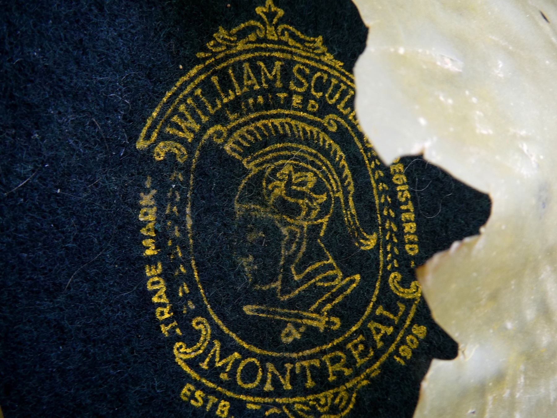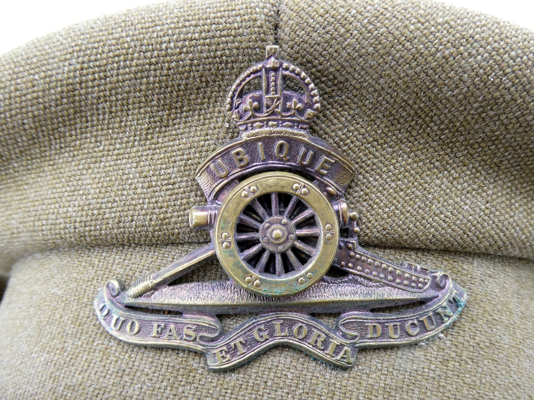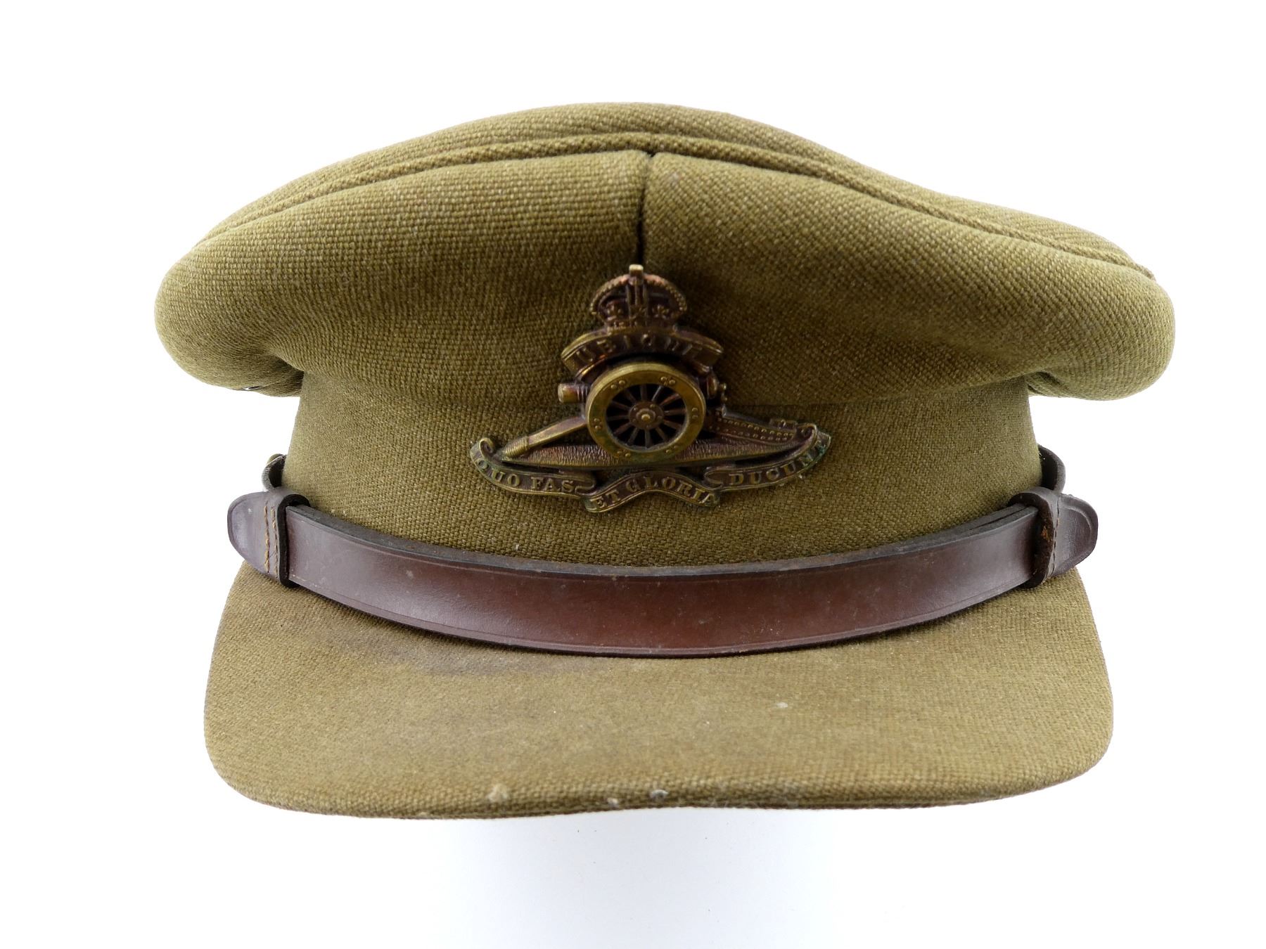 (1) TAN CANVAS PEAKED CAP WITH BRASS KING'S CROWN ARTILLERY CAP BADGE, CANNON WHEEL ON CAP BADGE SPINS, LEATHER CHIN STRAP, BRASS KING'S CROWN CANADA BUTTONS, LEATHER HEAD BAND WITH STITCHING THAT LET GO, PLASTIC LINING TORN, MARKED: "WILLIAM SCULLY LIMITED, MONTREAL" ETC., SHOWS AGE / WEAR / TEAR. SEE PHOTOS.