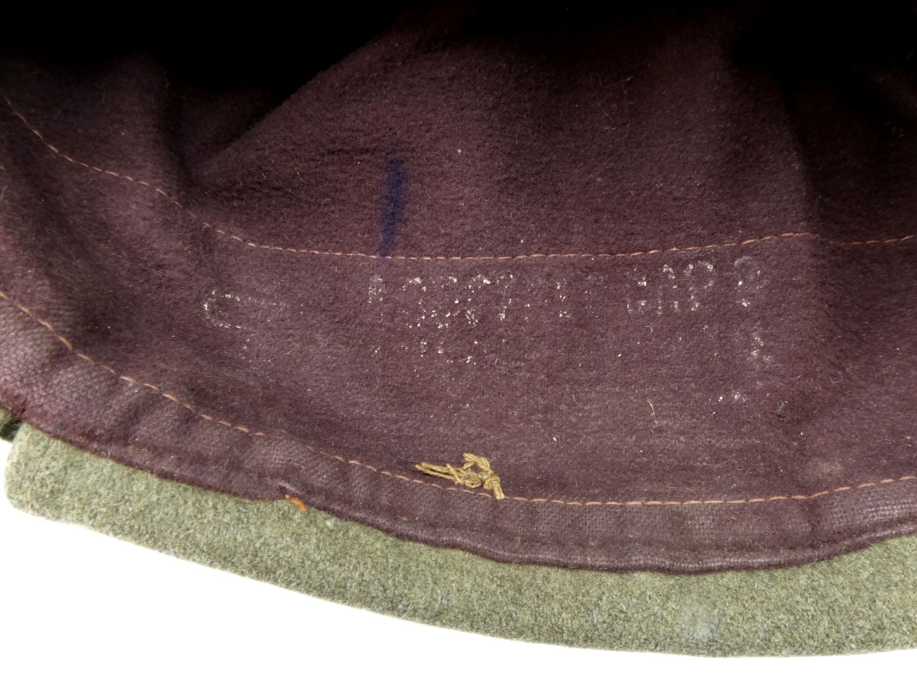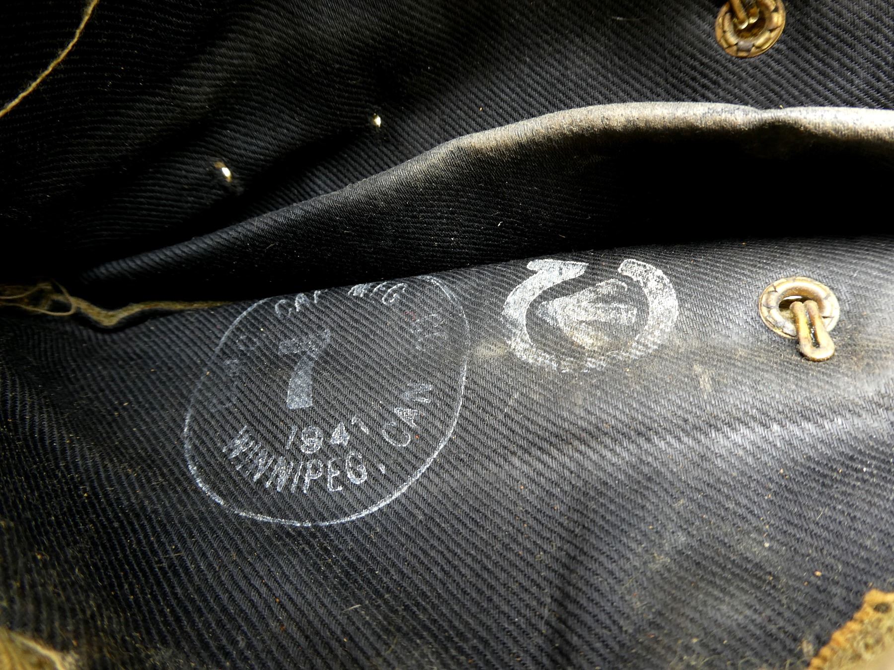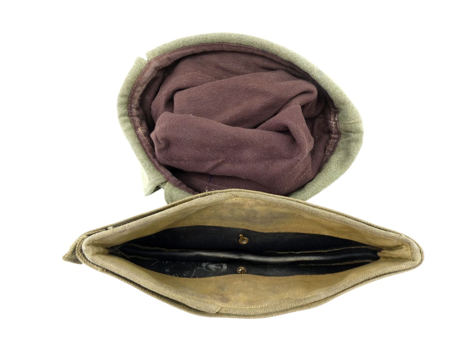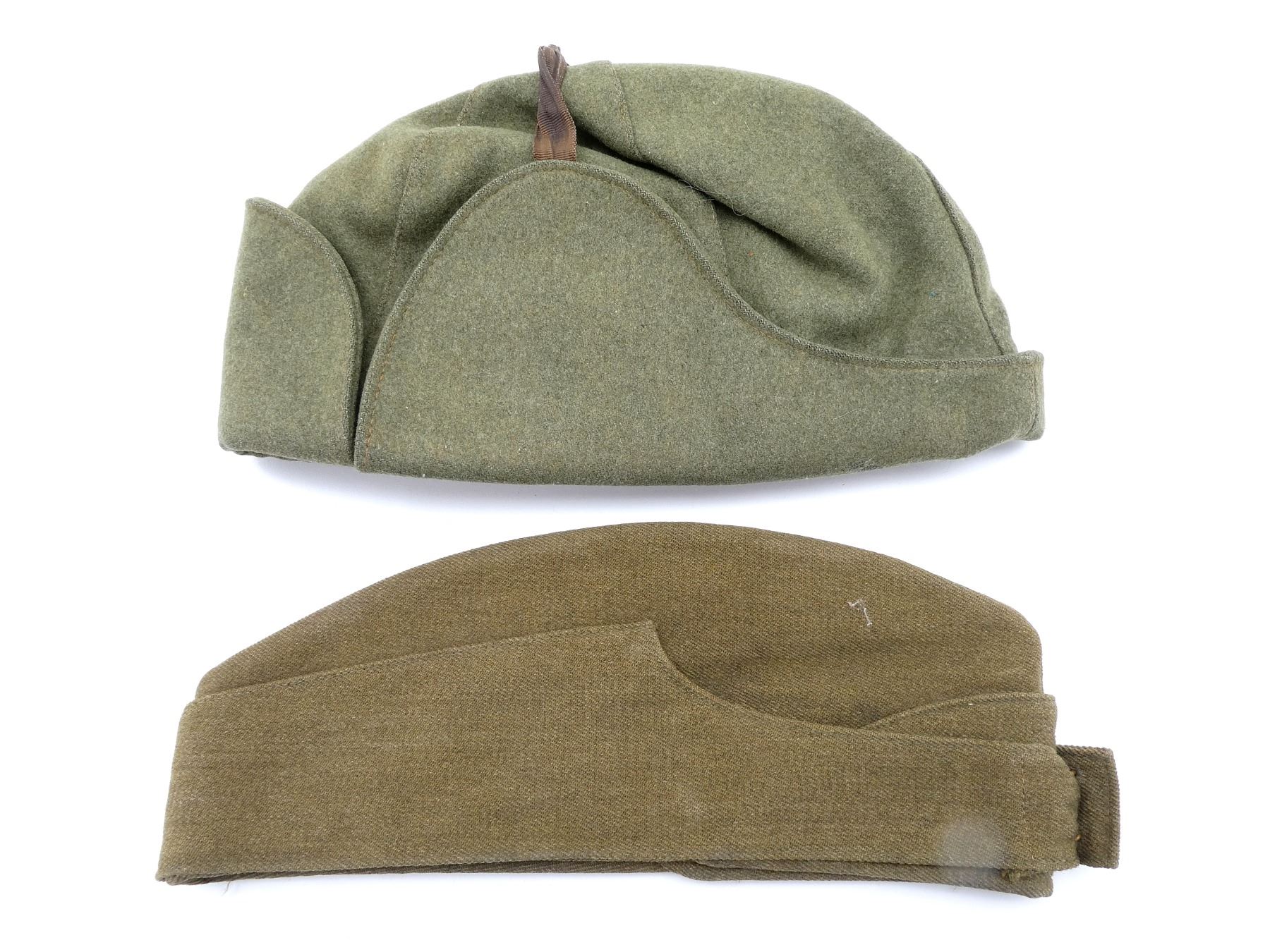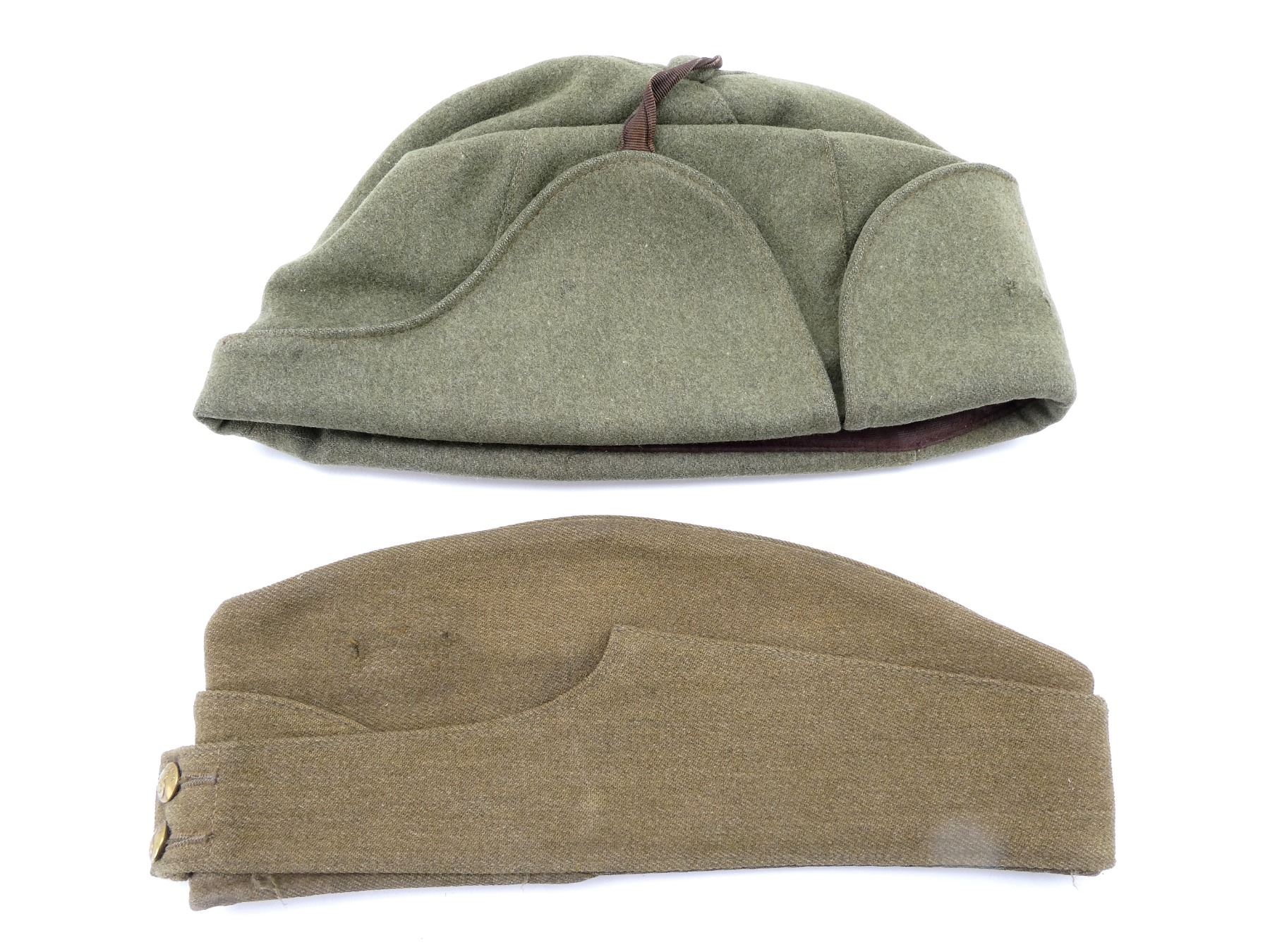 LOT INCLUDES; (1) WWII CANADIAN MILITARY TAN CANVAS WEDGE CAP WITH BRASS KING'S CROWN CANADA BUTTONS, INSIDE MARKED: "D.M.C. CAP MFG. CO., 7, 1941, WINNIPEG CAN" WITH C-BROAD ARROW, SHOWS SOME AGE / WEAR & (1) UNKNOWN MILITARY OLIVE GREEN WOOL WINTER STYLE HAT, BROWN FELT LIKE INTERIOR, VARIOUS FAINT / UN-CLEAR MARKINGS, EAR FLAPS THAT TIE UP / DOWN, SHOWS SLIGHT AGE / WEAR. SEE PHOTOS.