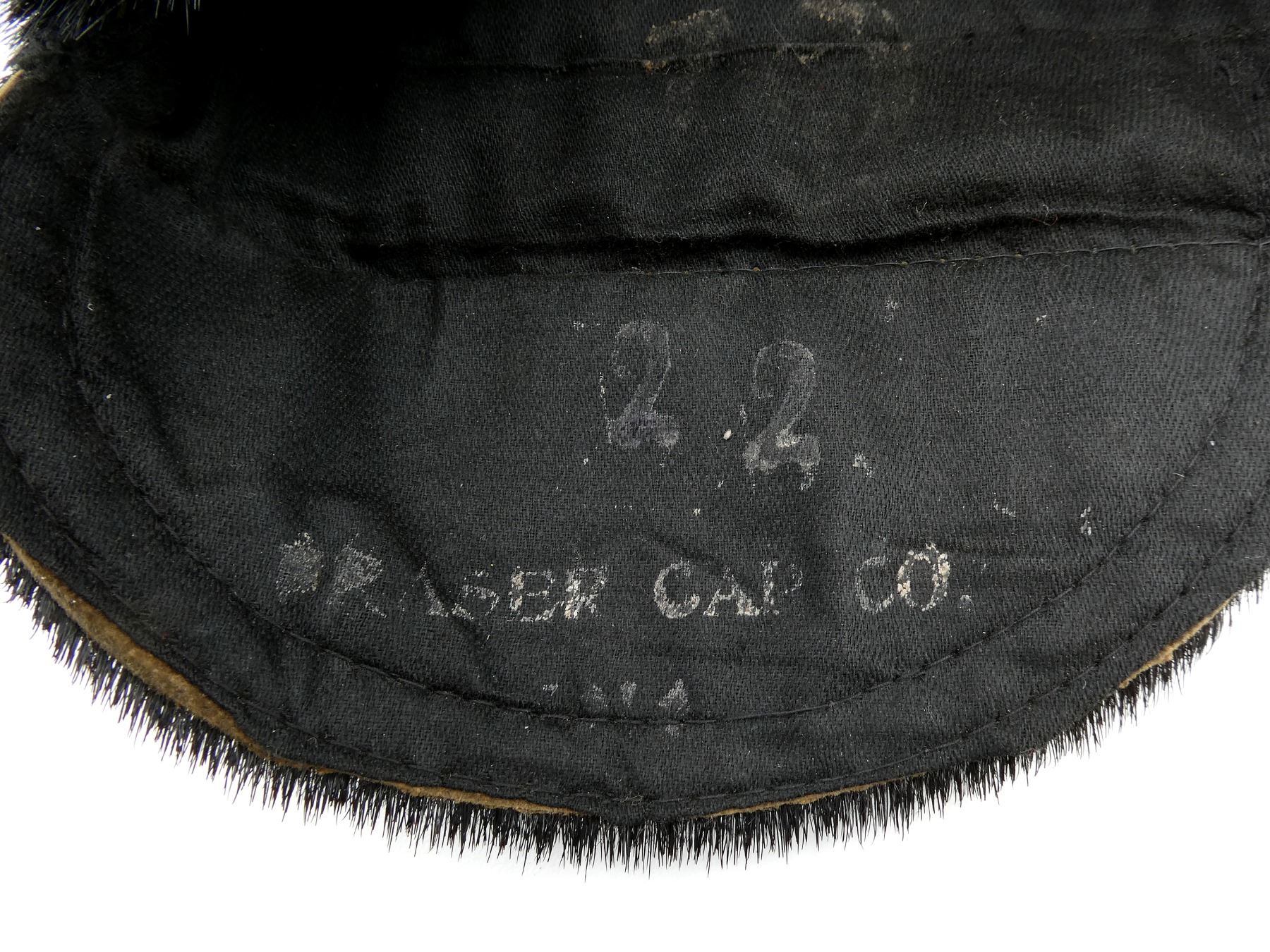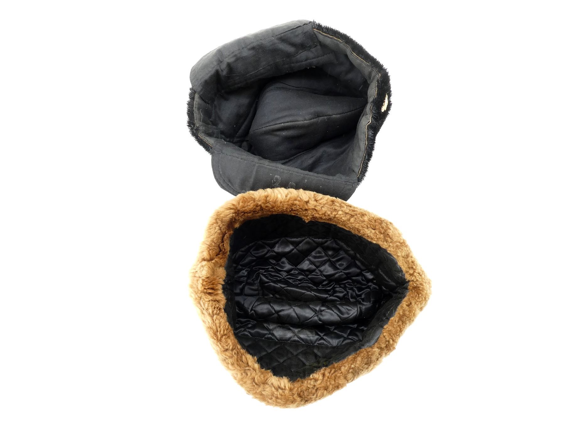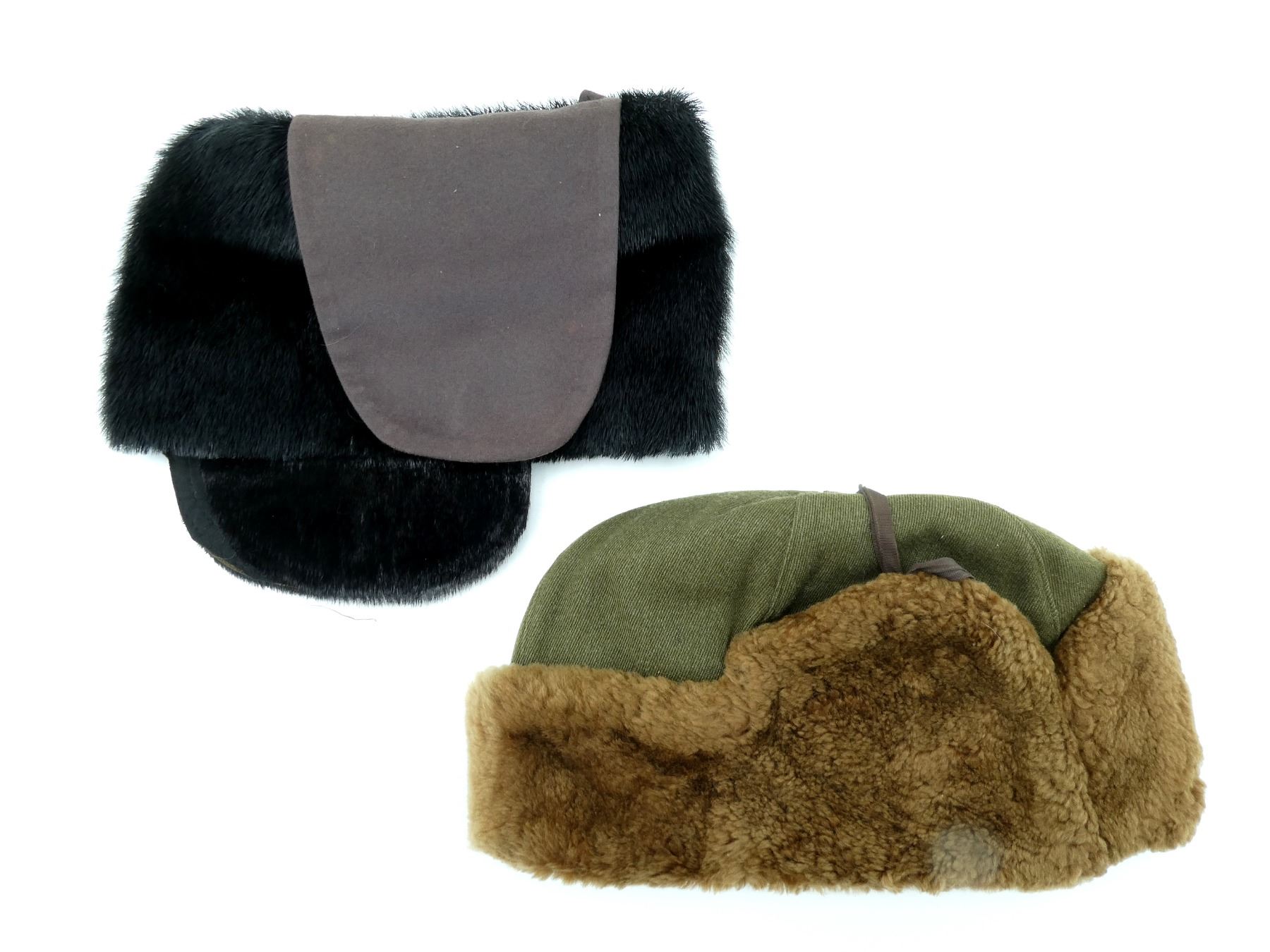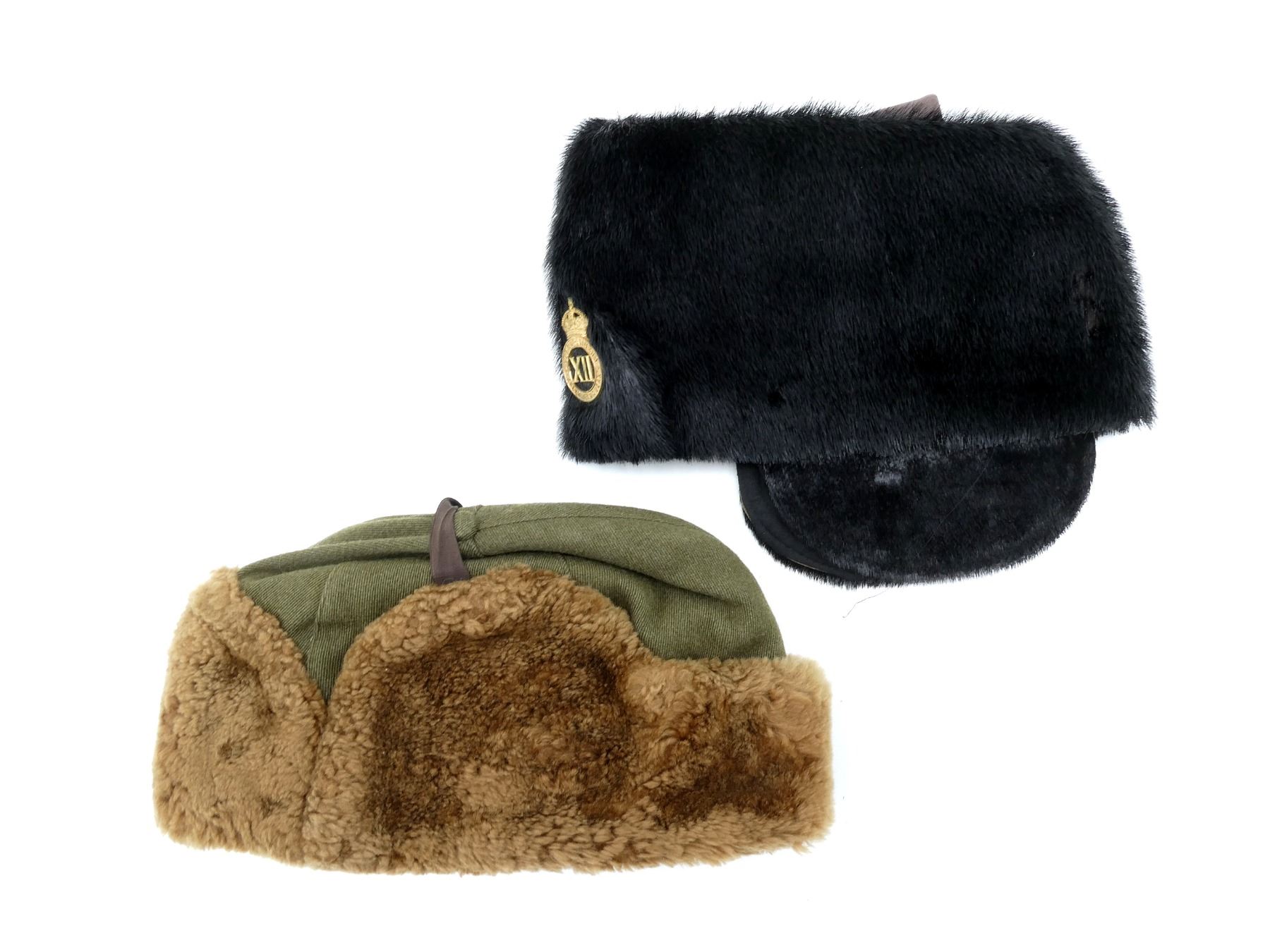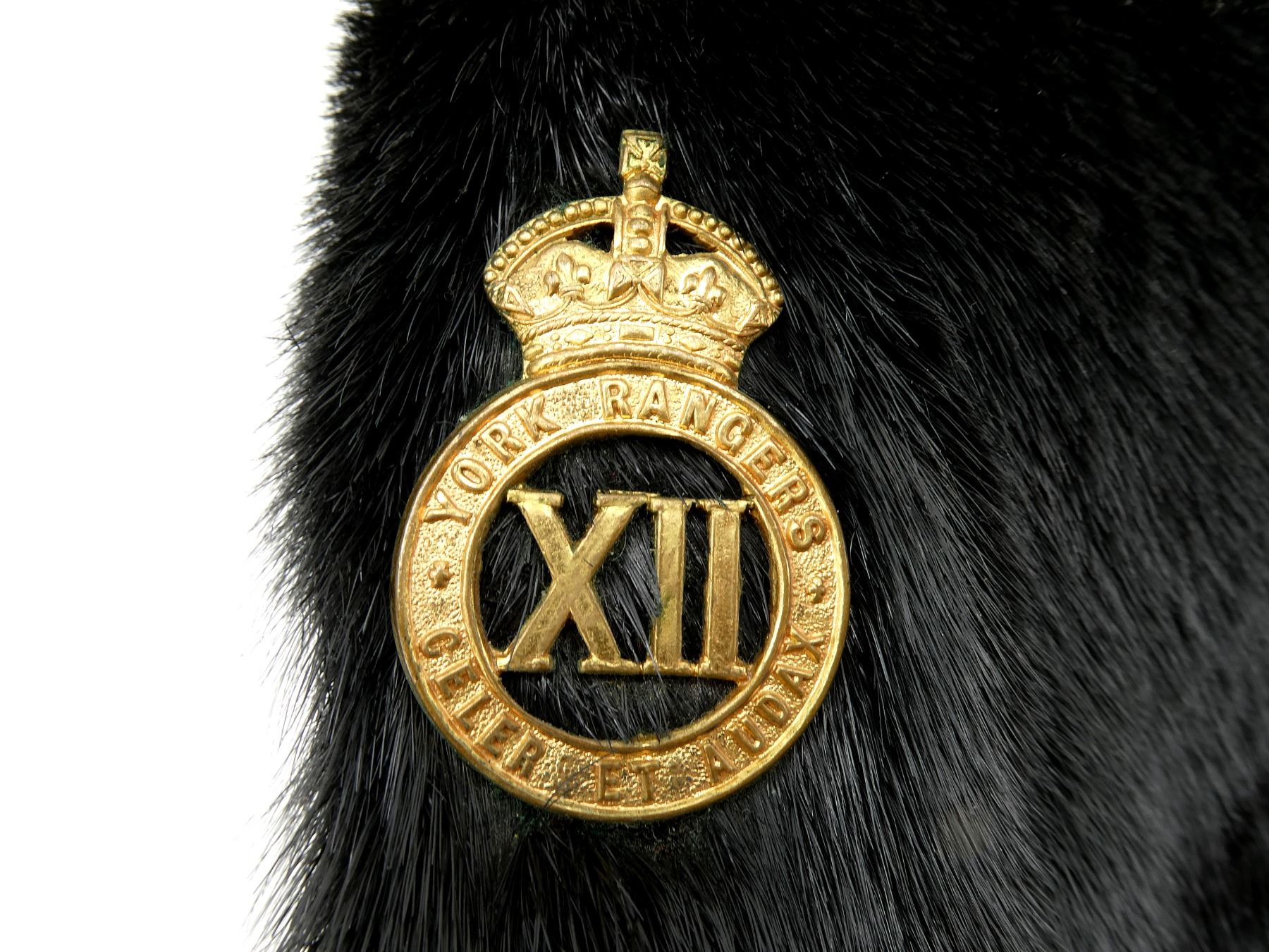 LOT INCLUDE; (1) WWII CANADIAN BLACK FUR-LIKE WINTER HAT WITH BRASS KING'S CROWN YORK RANGERS CAP BADGE, BADGE MARKED: "YORK RANGERS, XII, CELER ET AUDAX", INSIDE HAT MARKED: C-BROAD ARROW, "22, FRASER CAP CO., ??" WITH FAINT NAME TAG SEWN INSIDE, SHOWS AGE / WEAR & (1) UNKNOWN MILITARY OLIVE GREEN CANVAS WINTER HAT WITH BROWN WOOL BRIM / EAR FLAPS, FAINT YELLOW INK STAMP INSIDE (POSSIBLE C-BROAD ARROW). SEE PHOTOS.