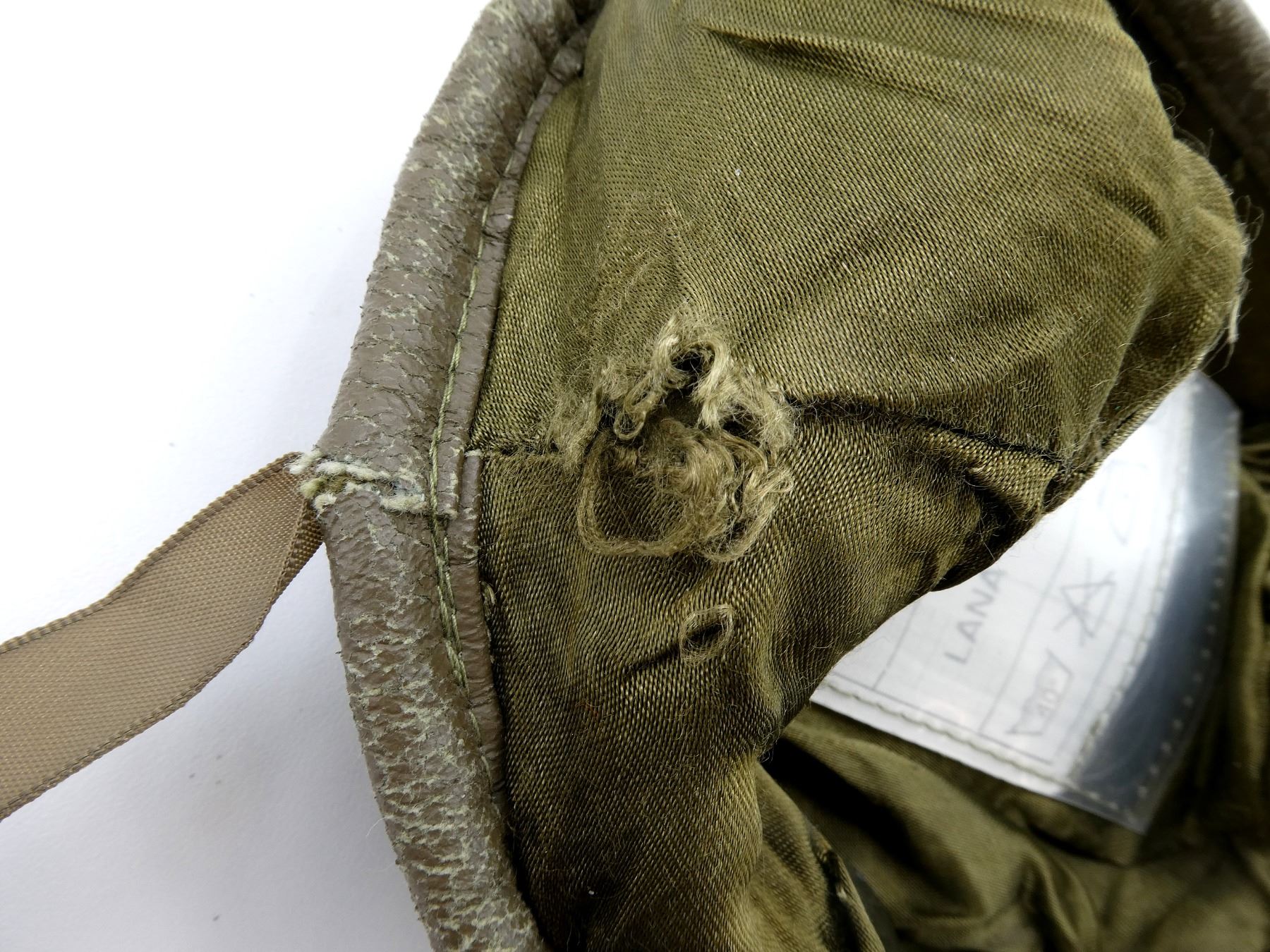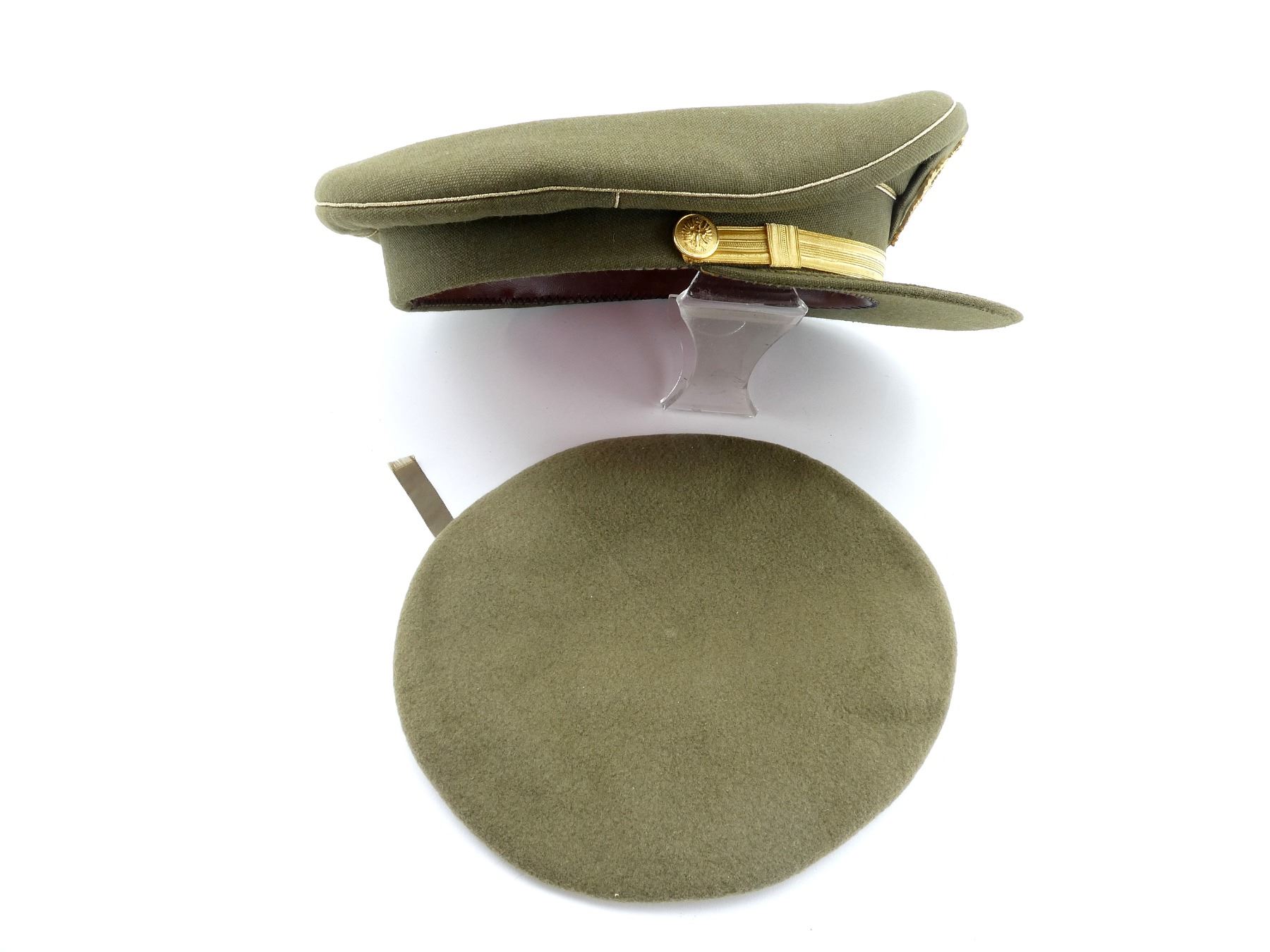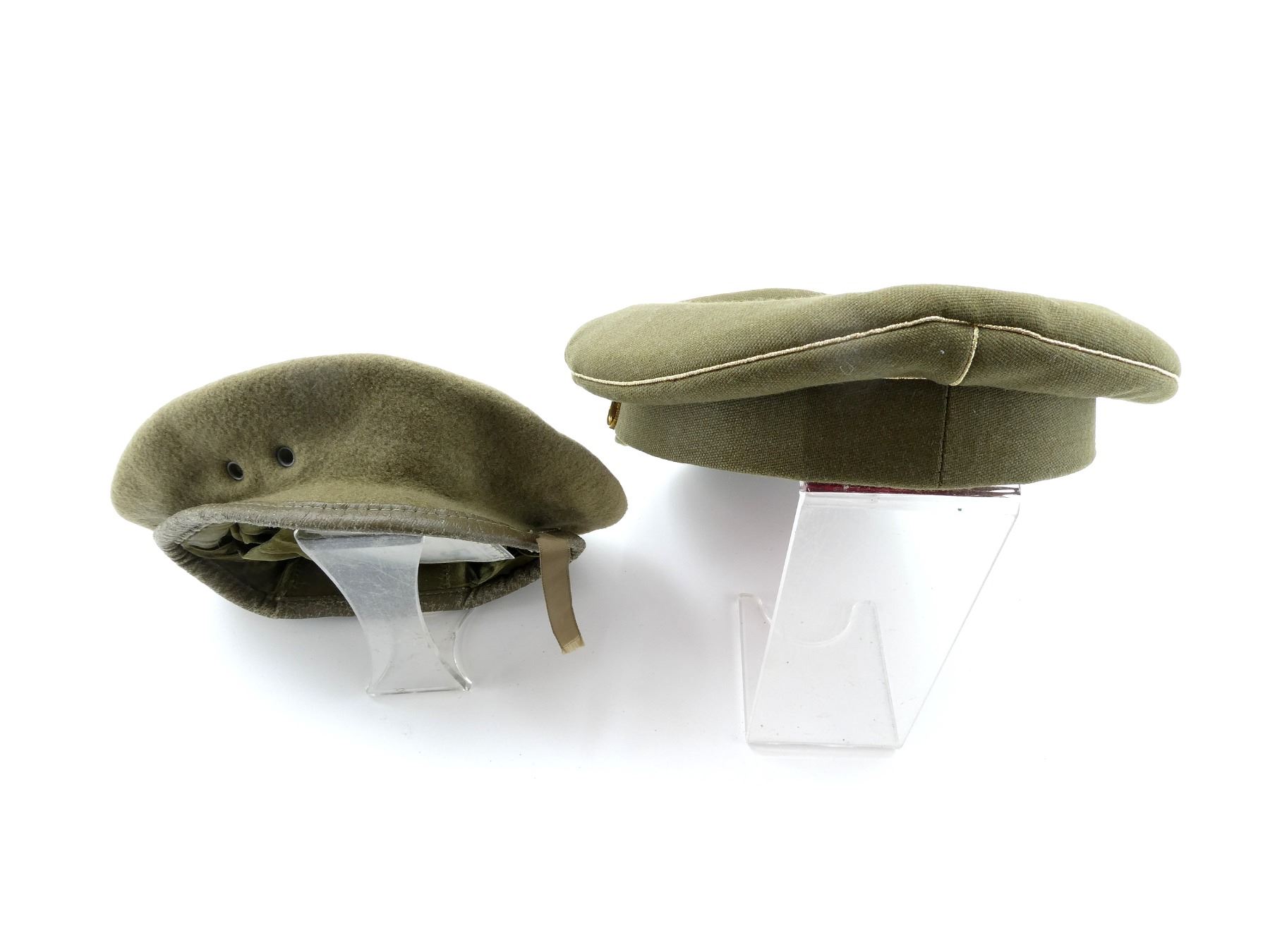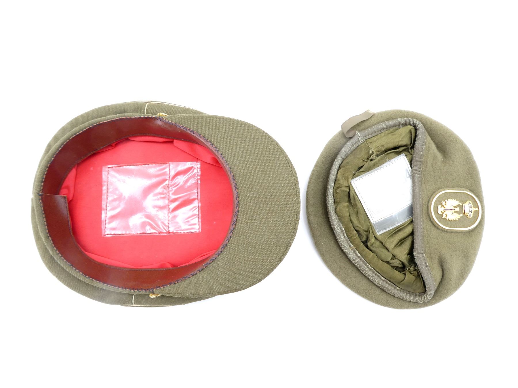 (1) GREEN OFFICER'S PEAKED CAP WITH BRASS / RED CROWN OVER BRASS EAGLE WITH RED CROSS OVER WREATH, GOLD COLOURED CHIN STRAP, GOLD COLOURED PLASTIC EAGLE BUTTONS, RED INTERIOR, LEATHER HEAD BAND, NO VISIBLE MARKINGS & (1) GREEN WOOL ENLISTED MAN'S BERET WITH BRASS / RED CROWN OVER BRASS EAGLE WITH RED CROSS IN AN OVULAR SHAPE, VARIOUS MARKINGS ON INNER LABEL, DATED 1986, SIZE 54, SHOWS AGE / WEAR. SEE PHOTOS.