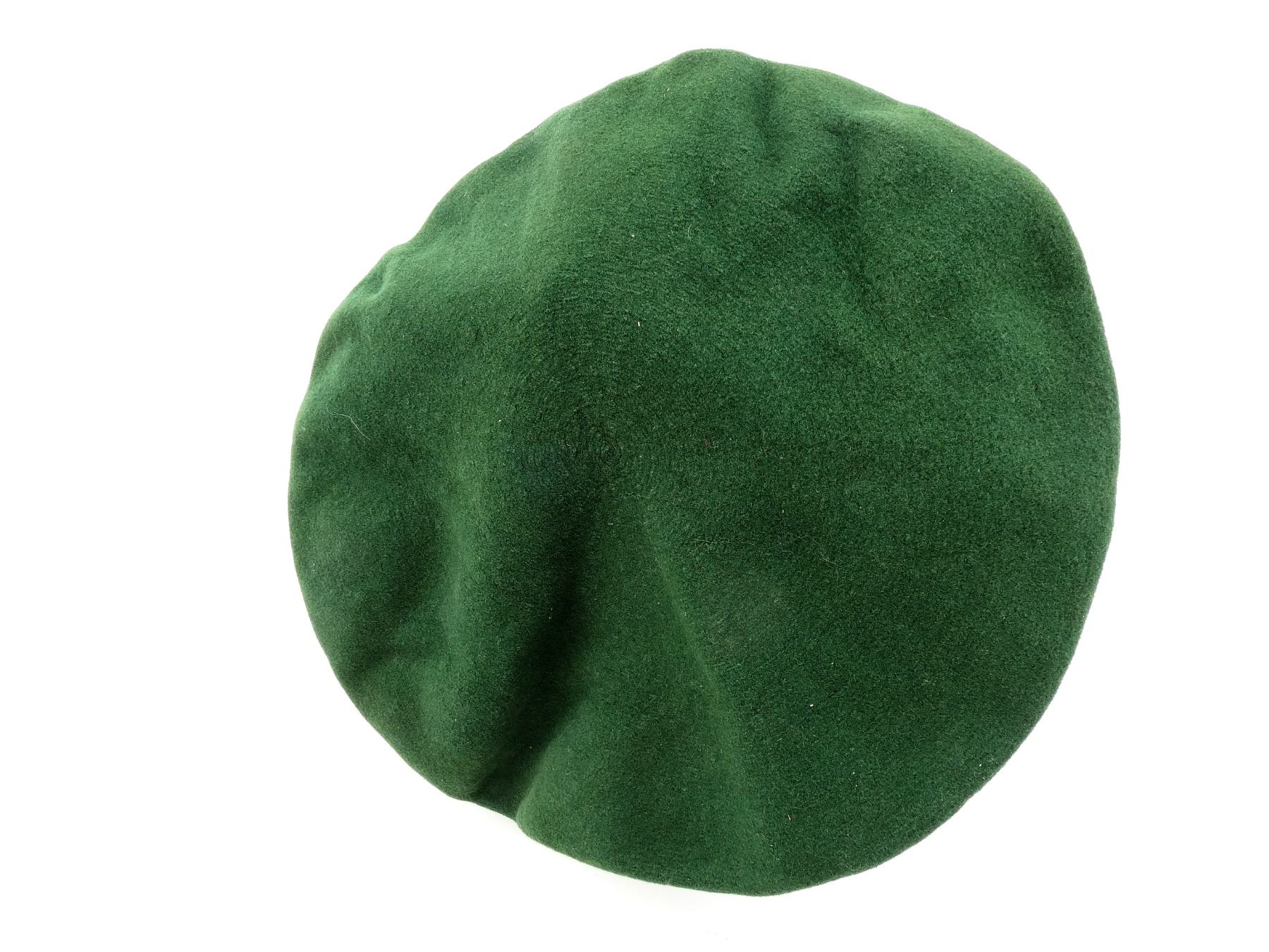 (1) GREEN WOOL BERET WITH SILVER WIRE BULLION, VARIOUS PARTIAL / FAINT MARKINGS ON INNER LABEL, STAMPED WITH AN "A" INSIDE OVER LABEL, SHOWS AGE / WEAR. SEE PHOTOS.