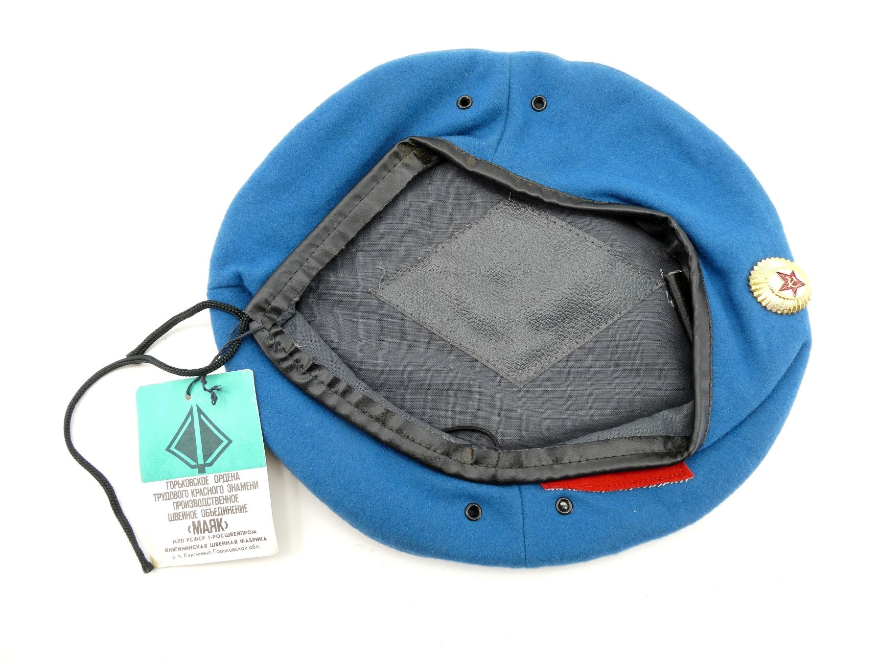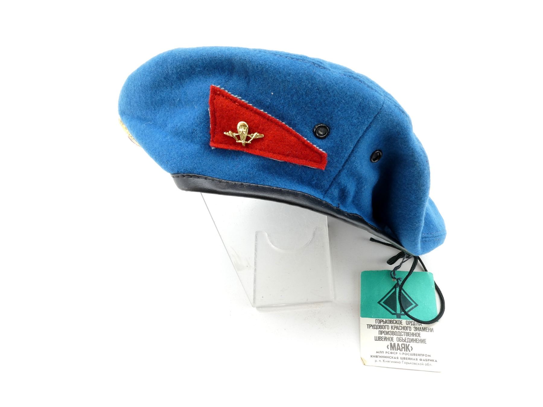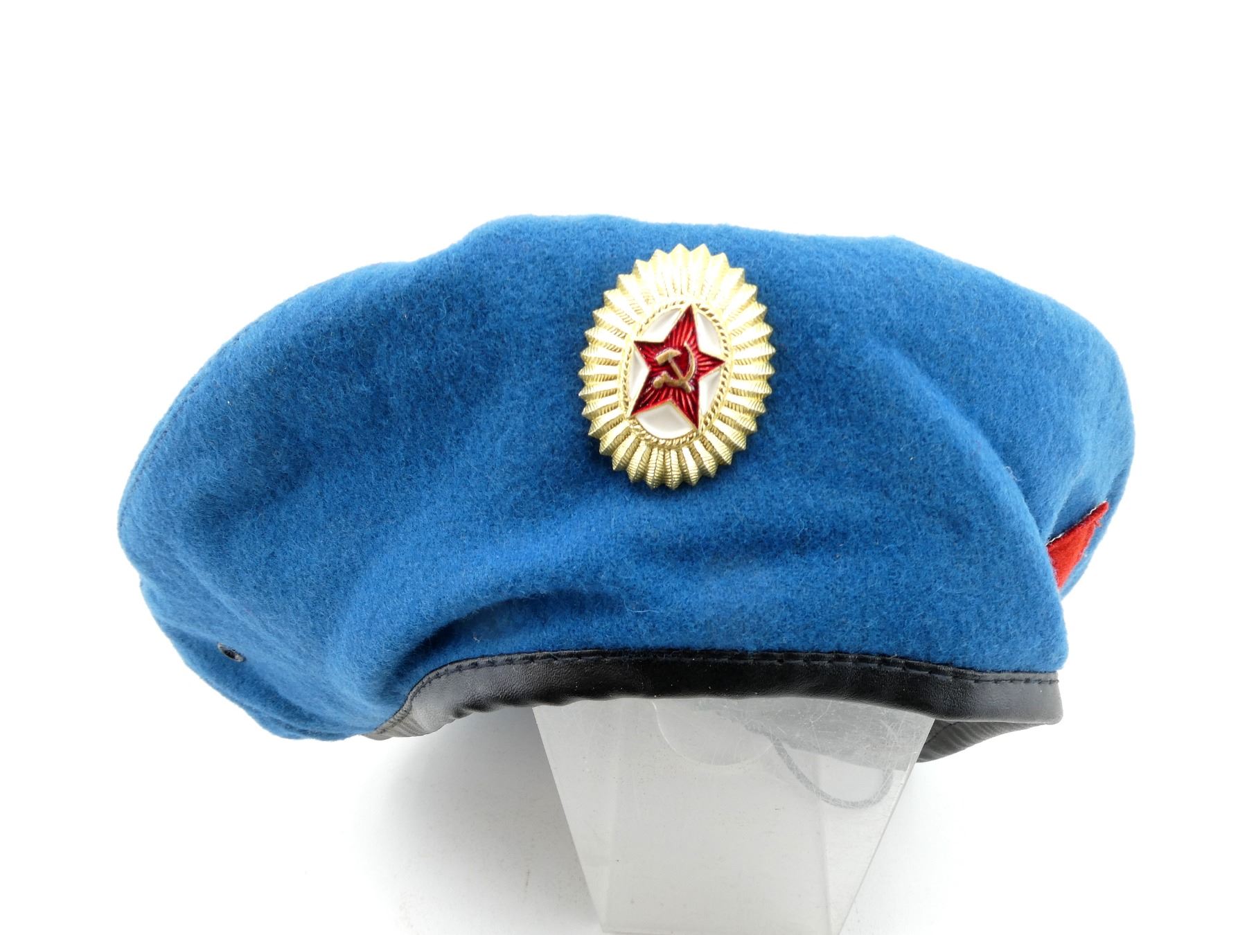 (1) BLUE WOOL BERET WITH HAMMER & SICKLE CAP BADGE, RED PATCH WITH PARATROOPER BADGE, SIZE 55, WITH ORIGINAL MAKER'S TAG STILL ATTACHED, VARIOUS MARKINGS ON TAG, UN-ISSUED, NEW OLD STOCK. SEE PHOTOS.