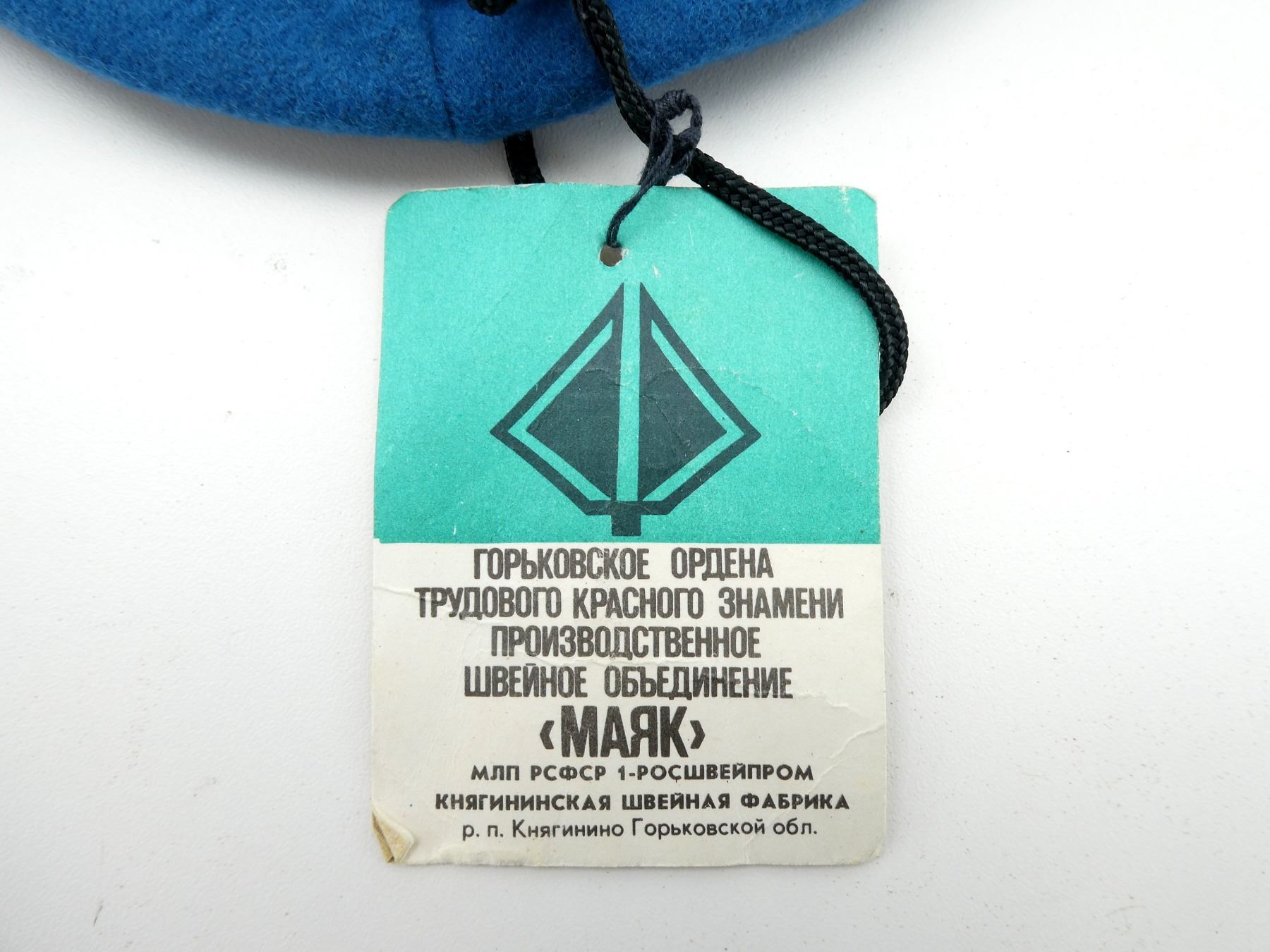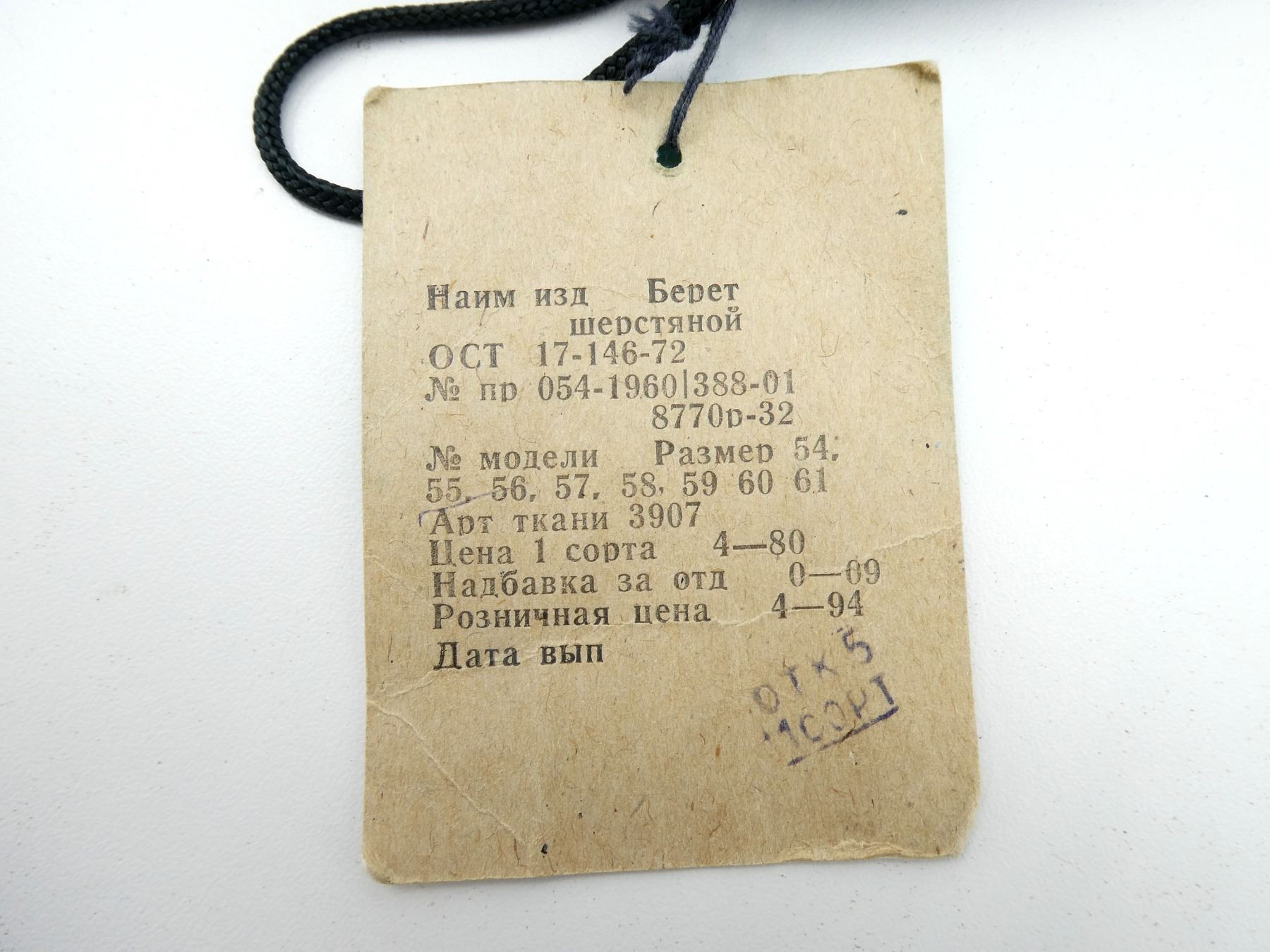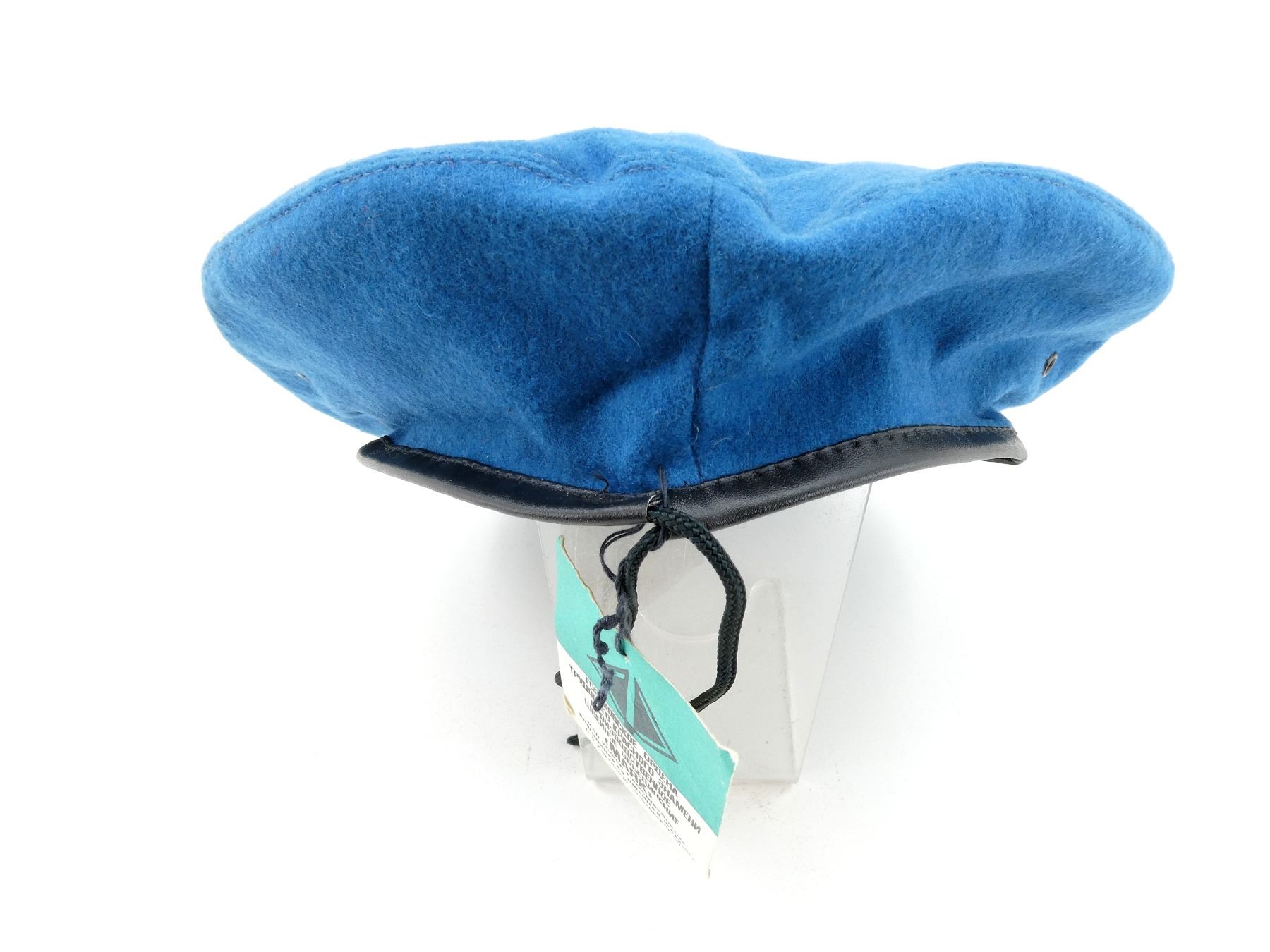 (1) BLUE WOOL BERET WITH HAMMER & SICKLE CAP BADGE, RED PATCH WITH PARATROOPER BADGE, SIZE 55, WITH ORIGINAL MAKER'S TAG STILL ATTACHED, VARIOUS MARKINGS ON TAG, UN-ISSUED, NEW OLD STOCK. SEE PHOTOS.