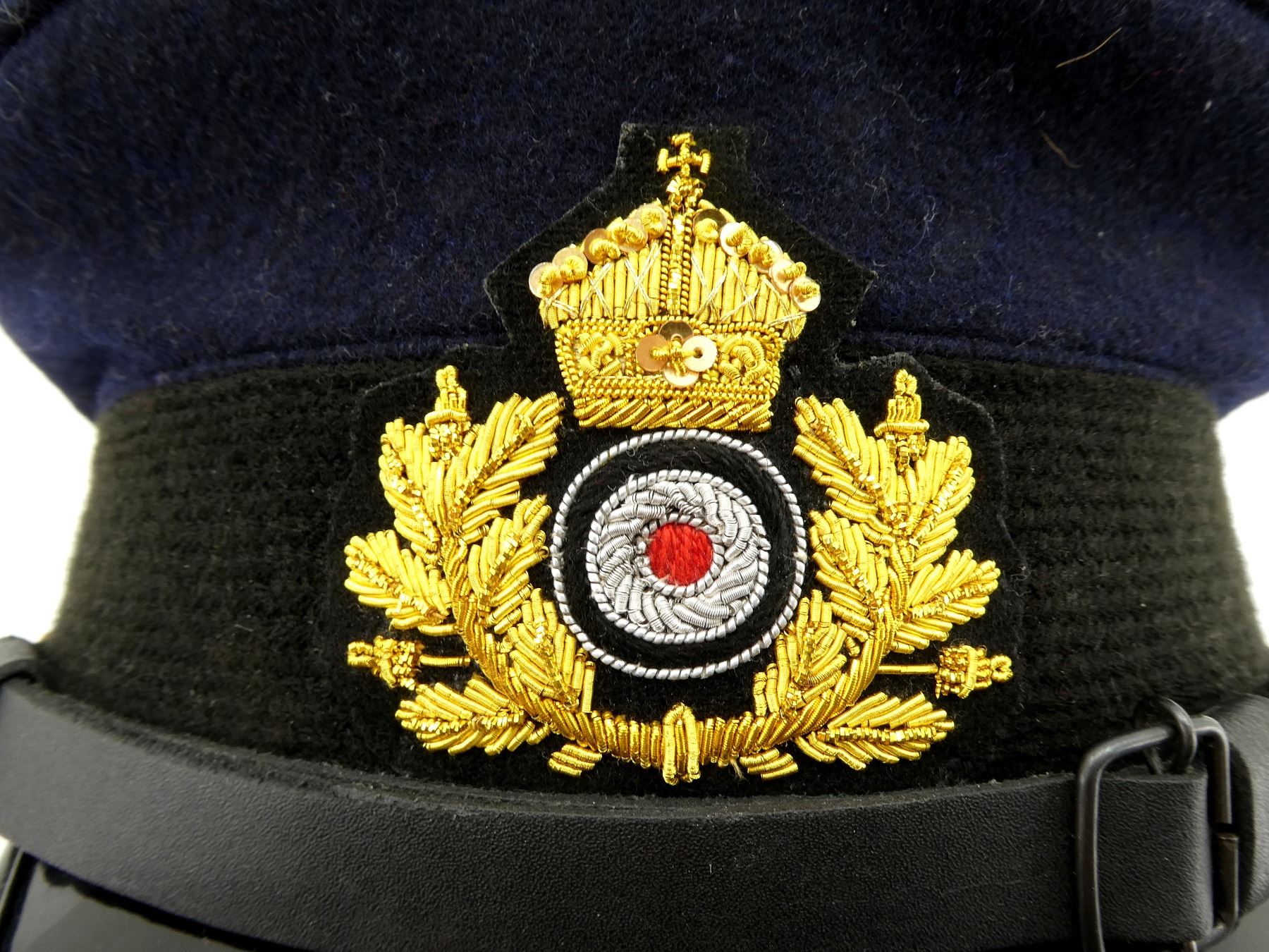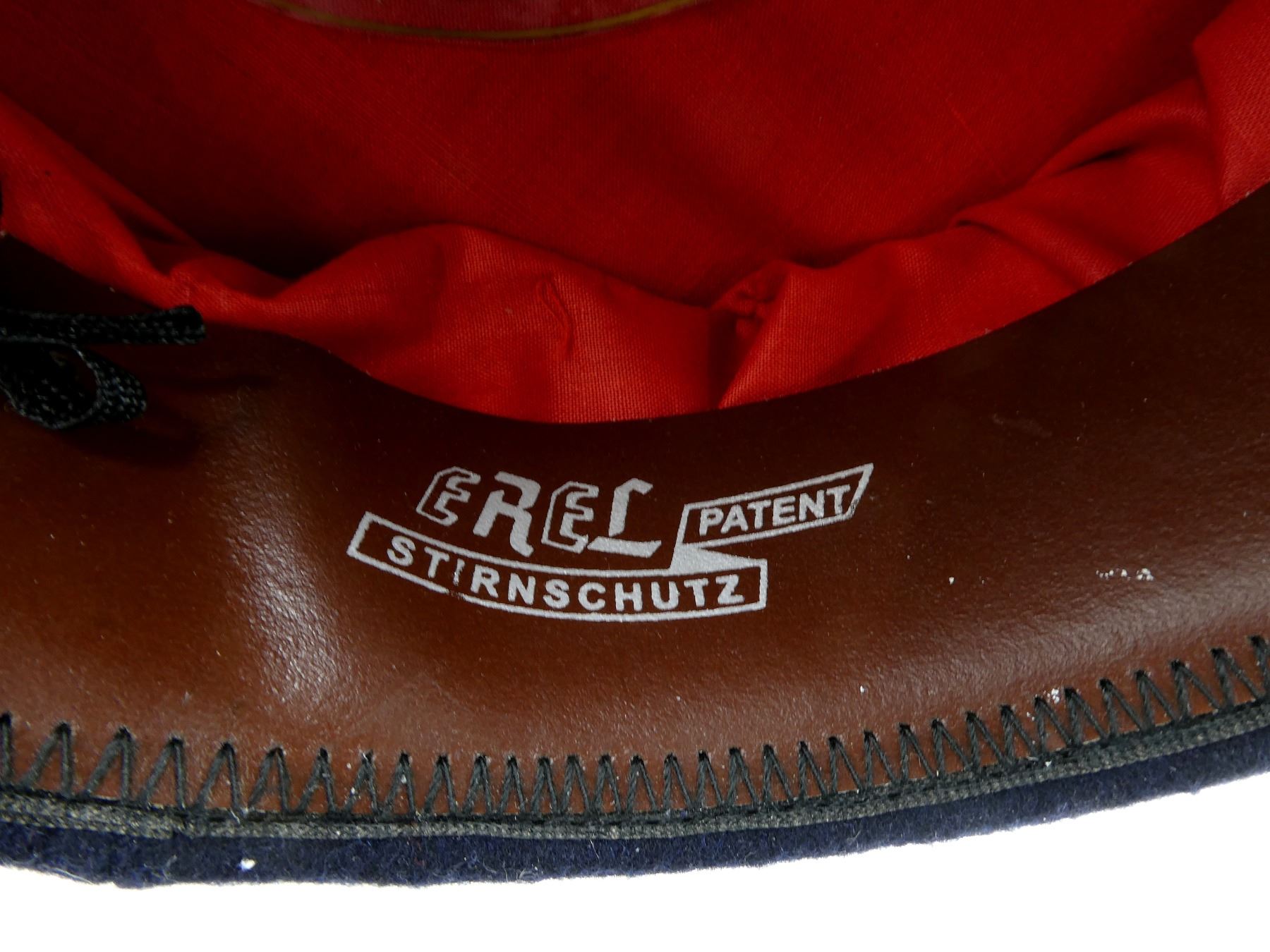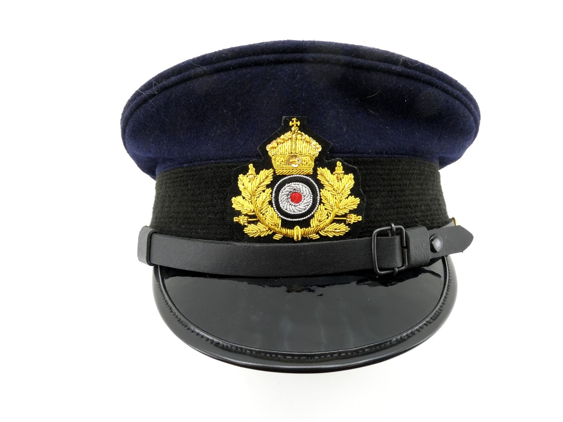 (1) REPRODUCTION NAVY BLUE WOOL PEAKED CAP, WIRE / BEADED CAP BADGE WITH COCKADE, BLACK LEATHER CHIN STRAP, BROWN LEATHER HEAD BAND MARKED: "EREL PATENT, STIRNSCHUTZ", INNER LABEL MARKED: "OFFIZIER, KLEIDERKASSE, BERLIN, GES GESCH, EREL, BERLIN, SONDERKLASSE, EXTRA". SEE PHOTOS.