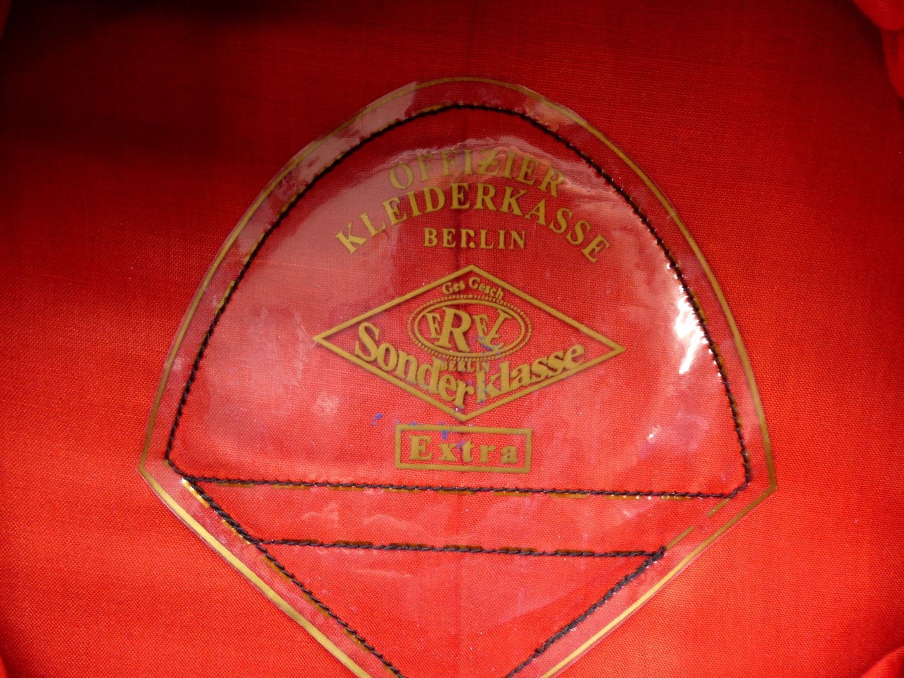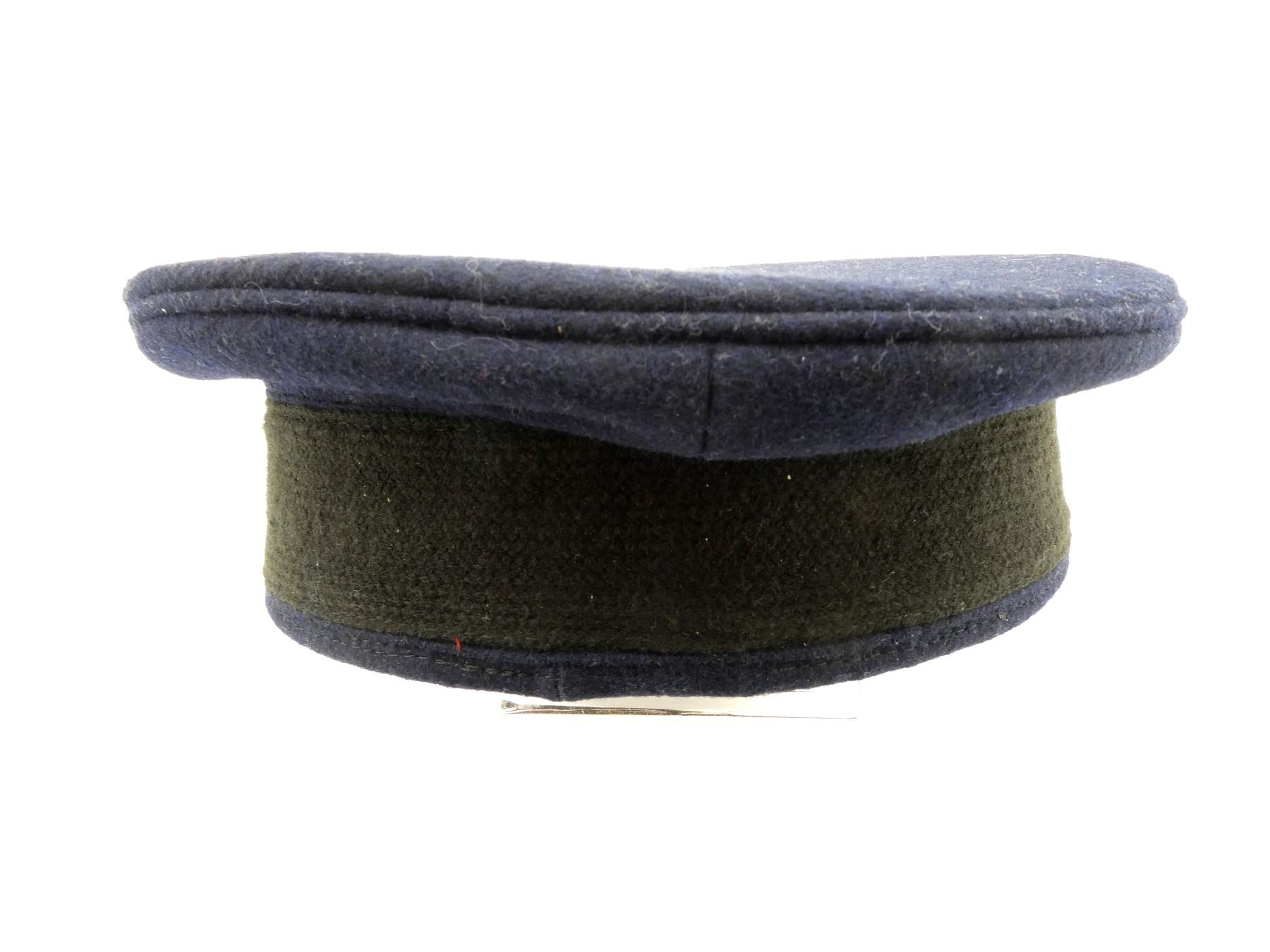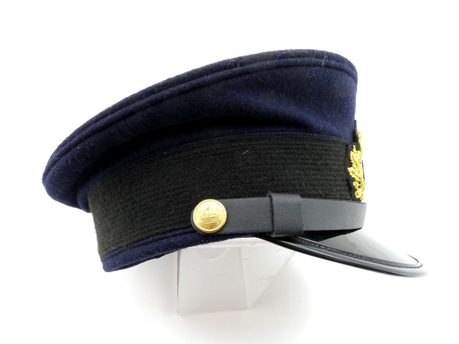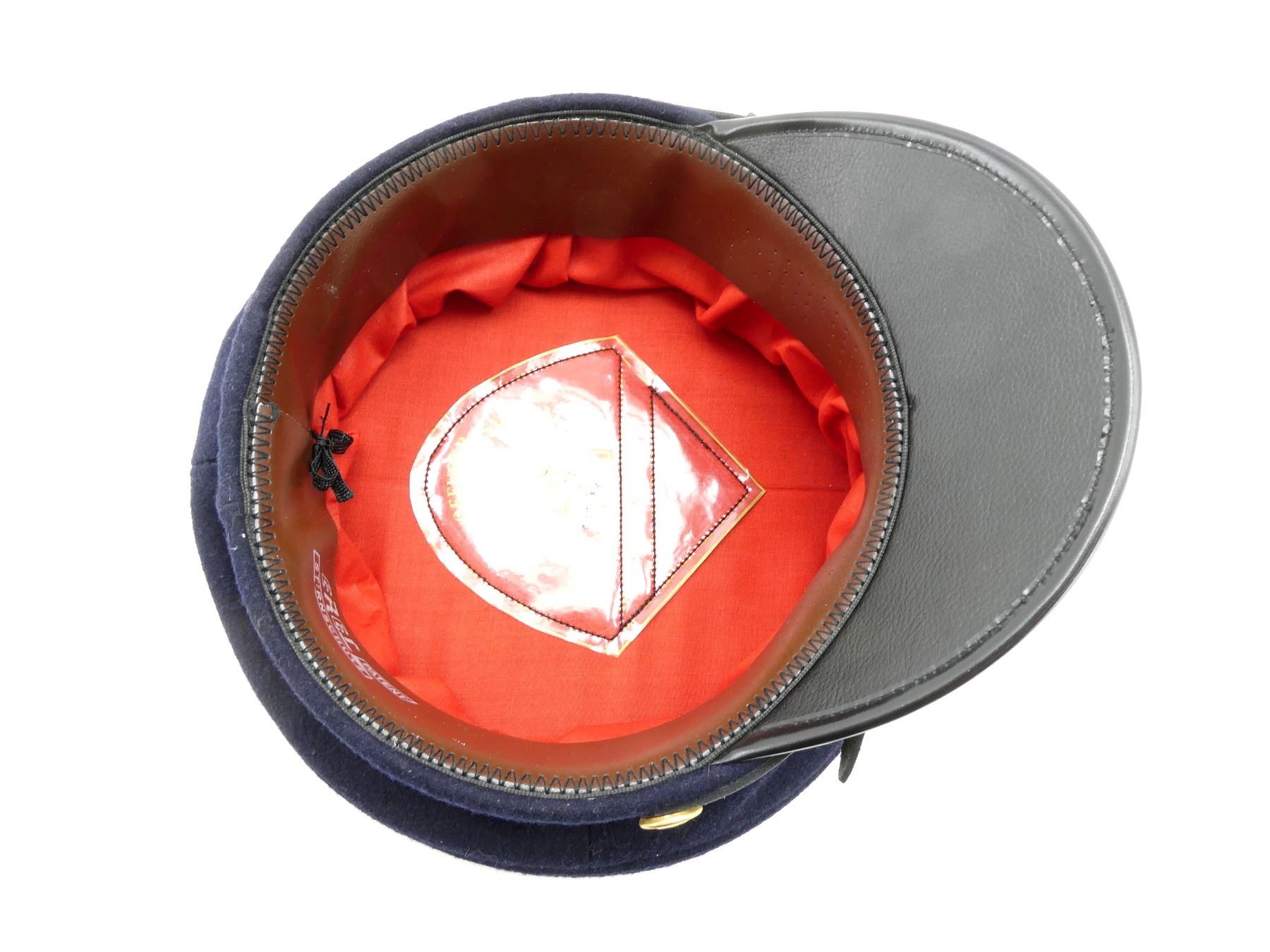 (1) REPRODUCTION NAVY BLUE WOOL PEAKED CAP, WIRE / BEADED CAP BADGE WITH COCKADE, BLACK LEATHER CHIN STRAP, BROWN LEATHER HEAD BAND MARKED: "EREL PATENT, STIRNSCHUTZ", INNER LABEL MARKED: "OFFIZIER, KLEIDERKASSE, BERLIN, GES GESCH, EREL, BERLIN, SONDERKLASSE, EXTRA". SEE PHOTOS.
