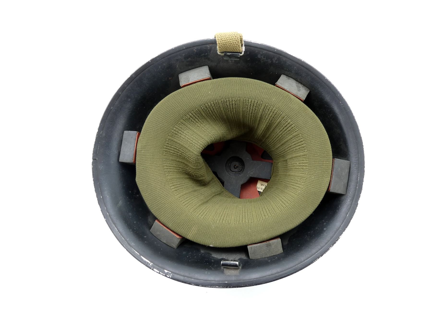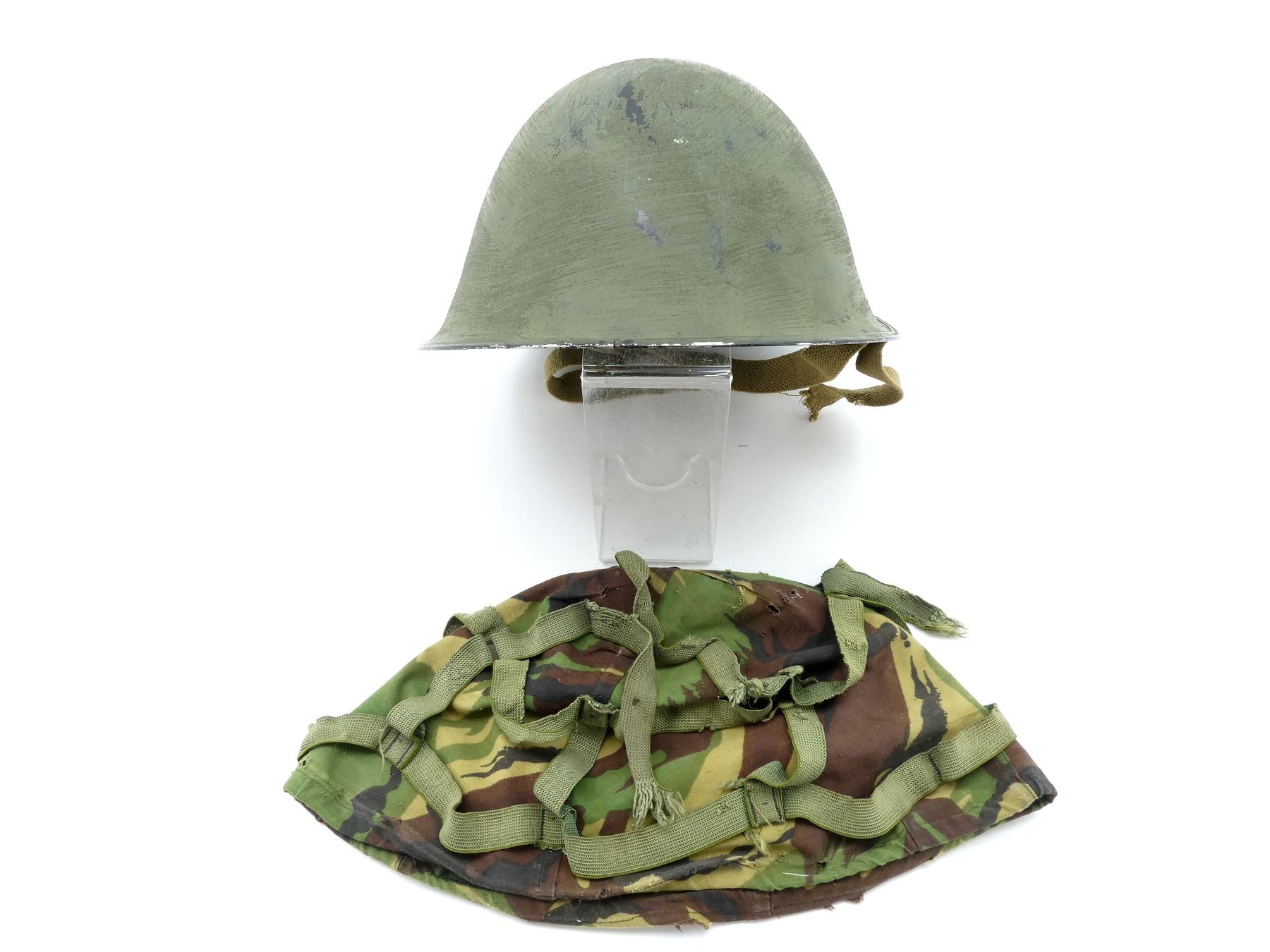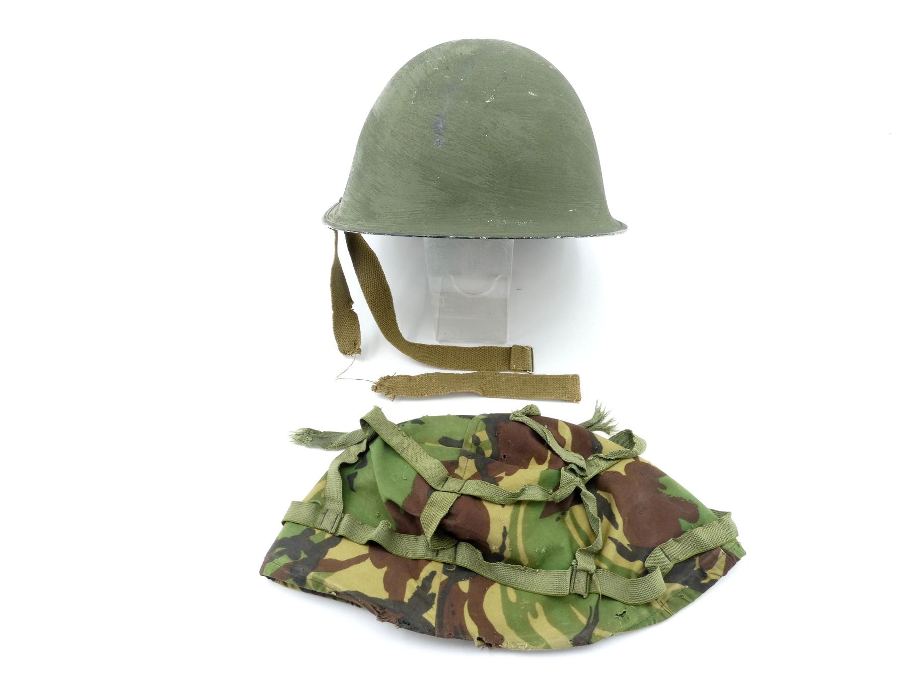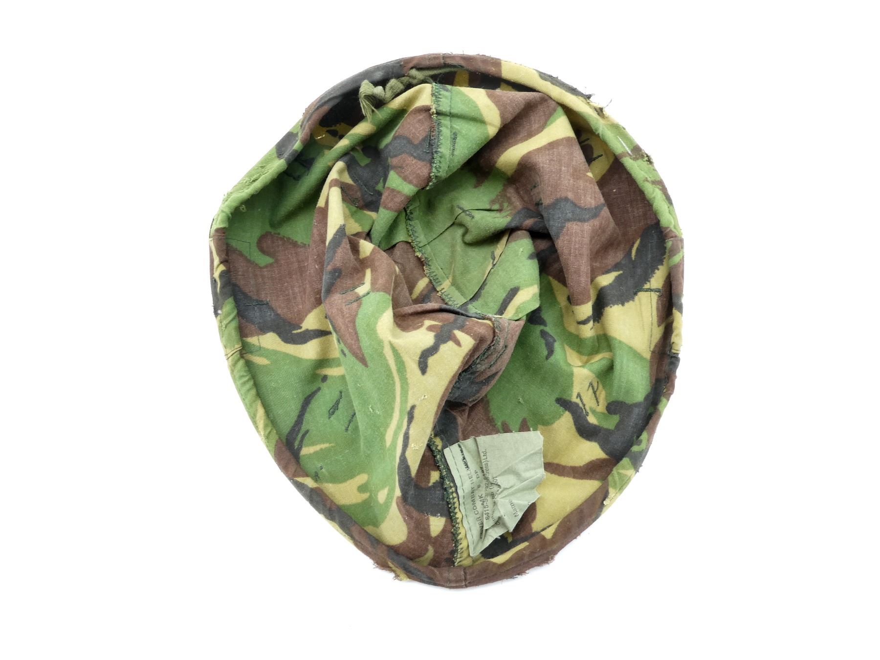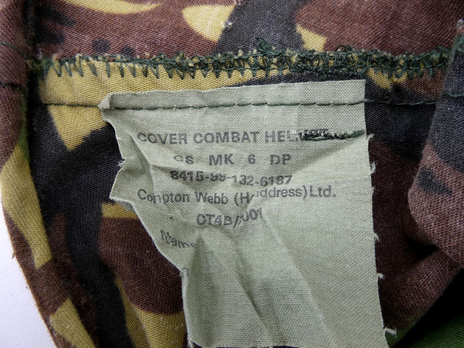 (1) GREEN PAINTED SHELL WITH BLACK PAINTED INTERIOR, KNITTED SOCK LINER WITH FOAM HEAD BAND, LIFT-THE-DOT PADDING / LINER, TAN CANVAS CHIN STRAP, CHIN STRAP SHOWS WEAR / TORN, WITH CAMO HELMET COVER, HEAD LINER MARKED: "GS1A/1394-REM-S/E" BROAD ARROW "80", "8415-99-973-6750", LABEL ON SOCK LINER MARKED: "CN 8415-99-973-6749, R.M. LTD.", BROAD ARROW OVER "1979", BACK OF SHELL MARKED: "ROC" OVER "MA", HELMET COVER MARKED: "COVER COMBAT HELMET, GS MK 6 DP, 8415-99-132-6187, COMPTON WEBB (HEADDRESS) LTD., CT4B/2001" ETC. SEE PHOTOS.