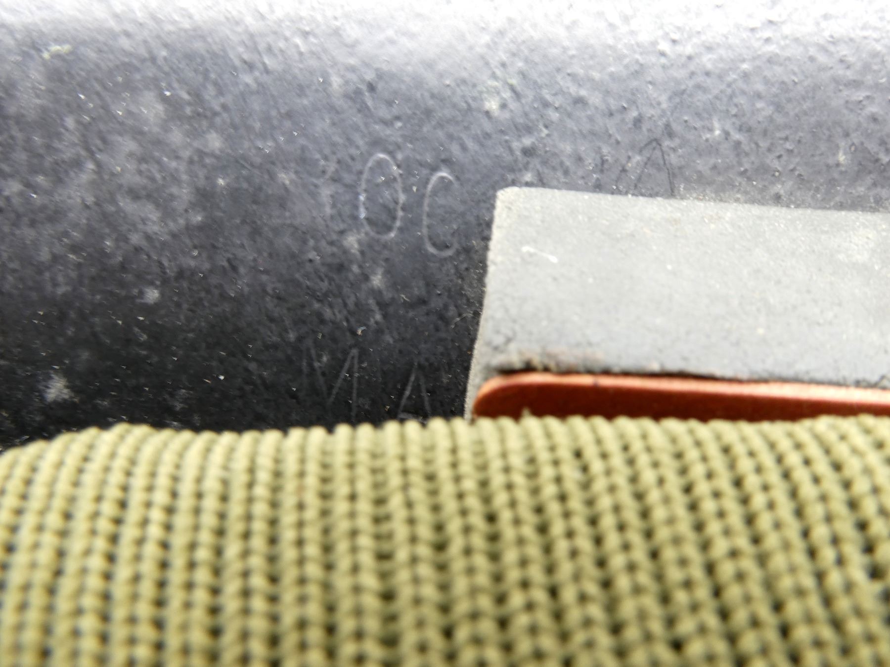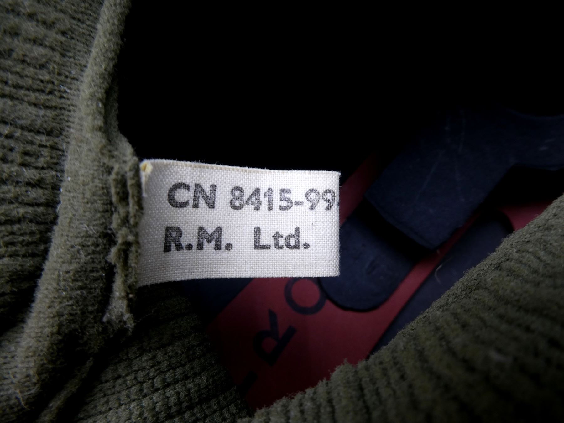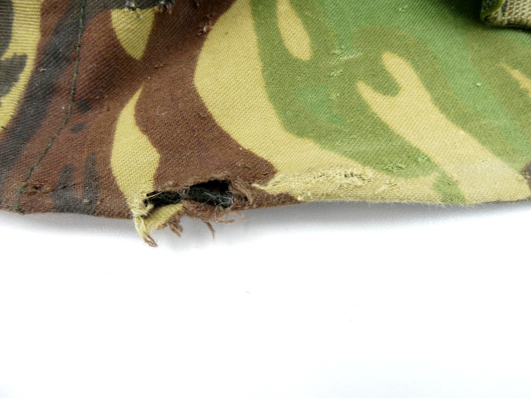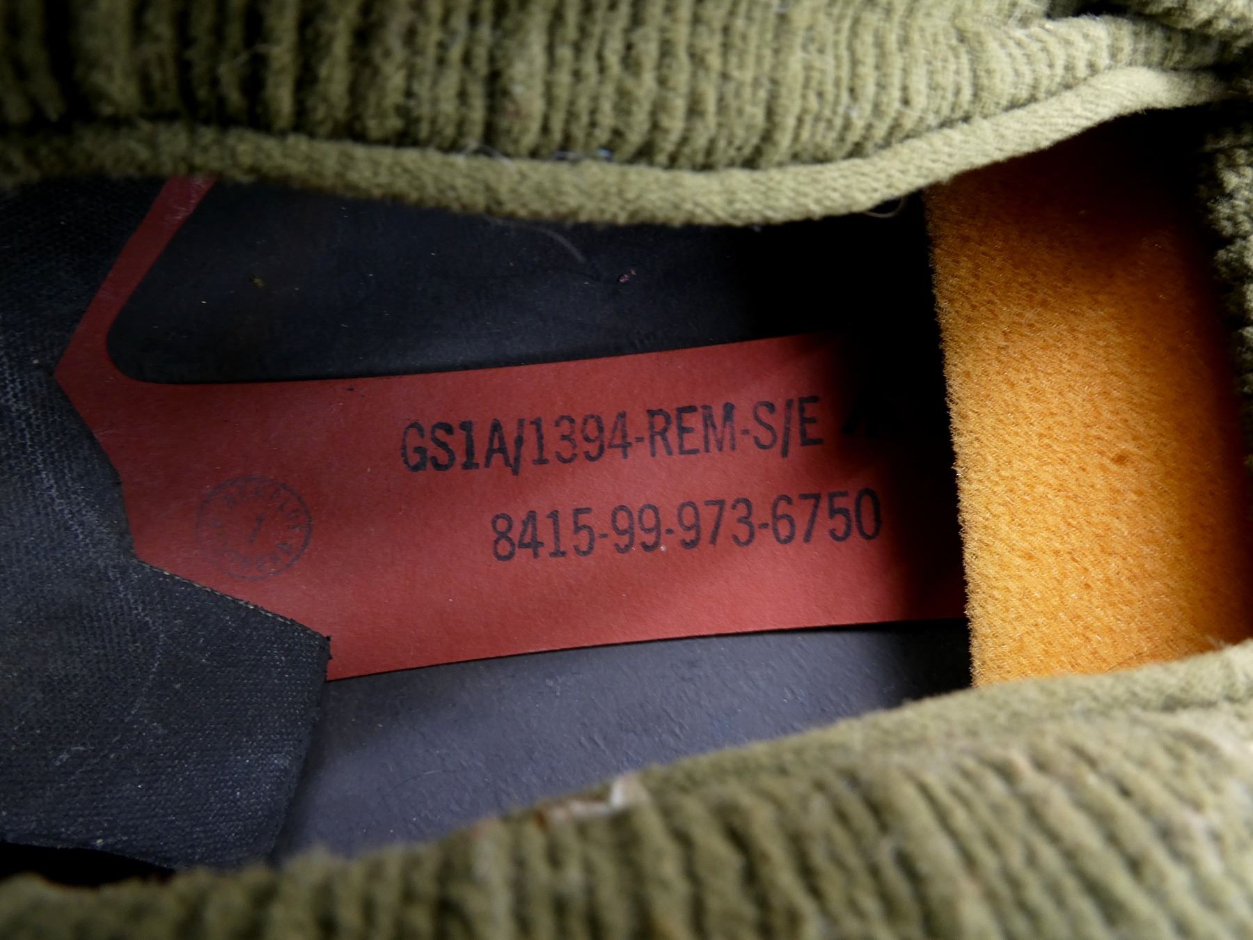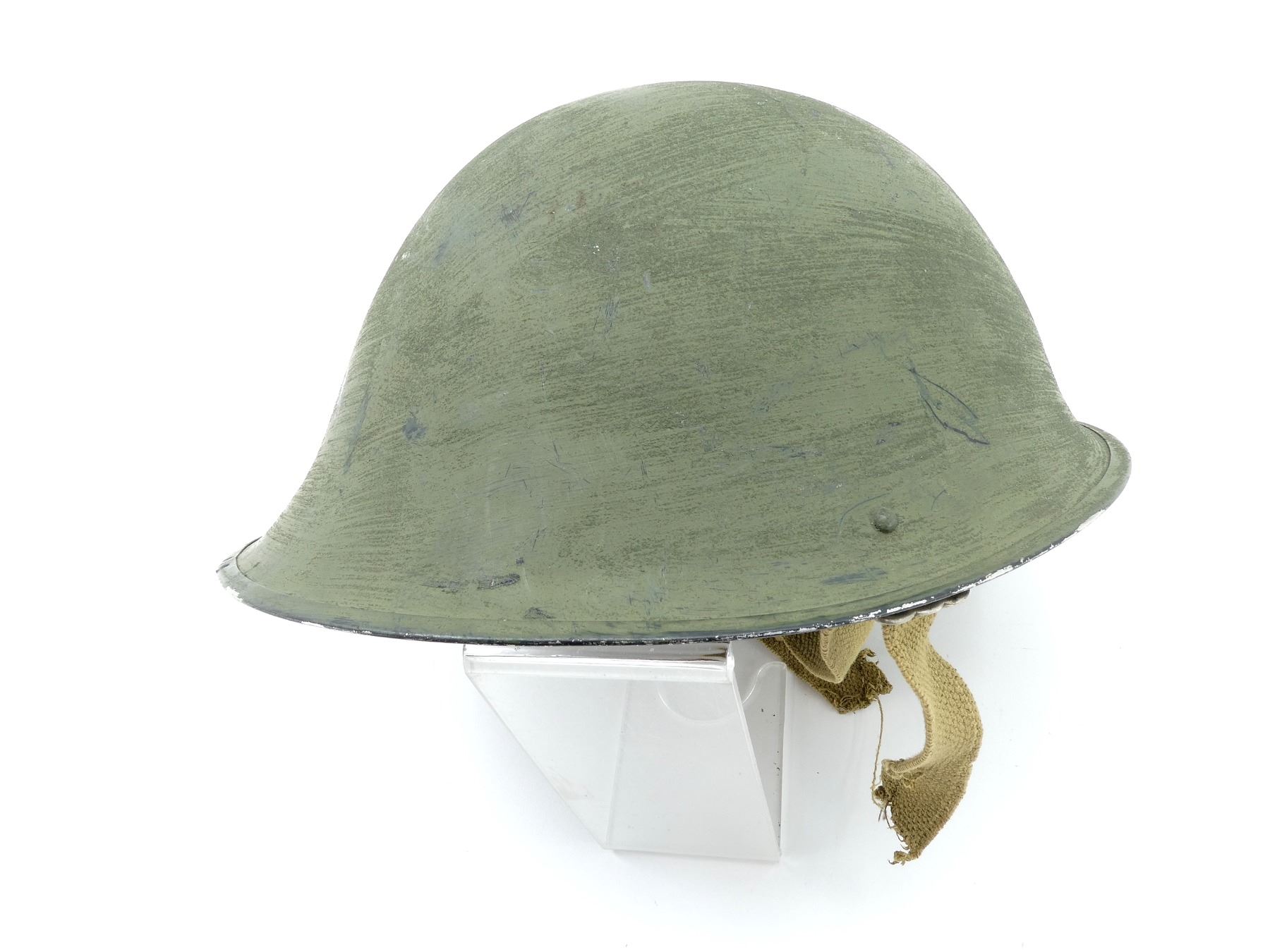 (1) GREEN PAINTED SHELL WITH BLACK PAINTED INTERIOR, KNITTED SOCK LINER WITH FOAM HEAD BAND, LIFT-THE-DOT PADDING / LINER, TAN CANVAS CHIN STRAP, CHIN STRAP SHOWS WEAR / TORN, WITH CAMO HELMET COVER, HEAD LINER MARKED: "GS1A/1394-REM-S/E" BROAD ARROW "80", "8415-99-973-6750", LABEL ON SOCK LINER MARKED: "CN 8415-99-973-6749, R.M. LTD.", BROAD ARROW OVER "1979", BACK OF SHELL MARKED: "ROC" OVER "MA", HELMET COVER MARKED: "COVER COMBAT HELMET, GS MK 6 DP, 8415-99-132-6187, COMPTON WEBB (HEADDRESS) LTD., CT4B/2001" ETC. SEE PHOTOS.