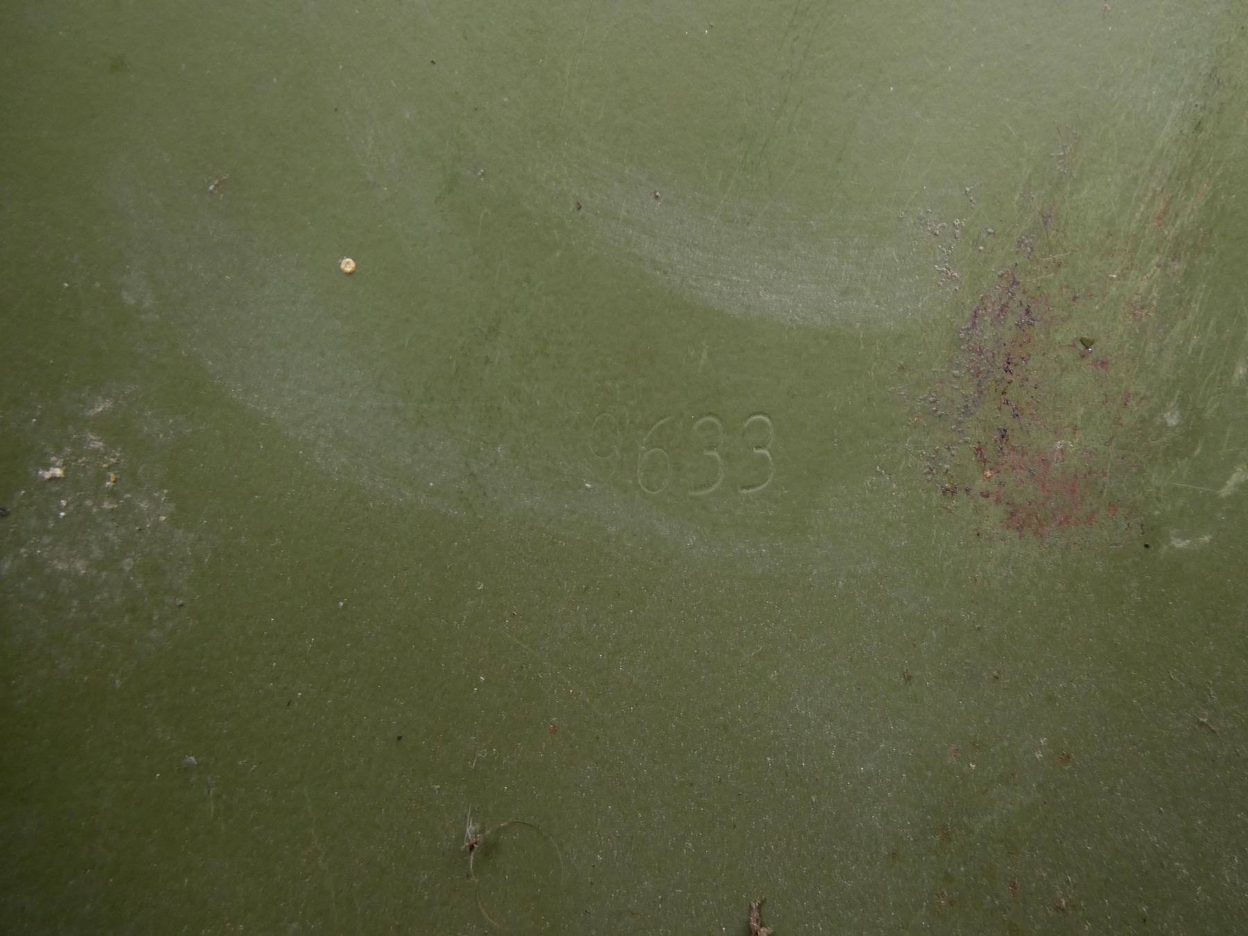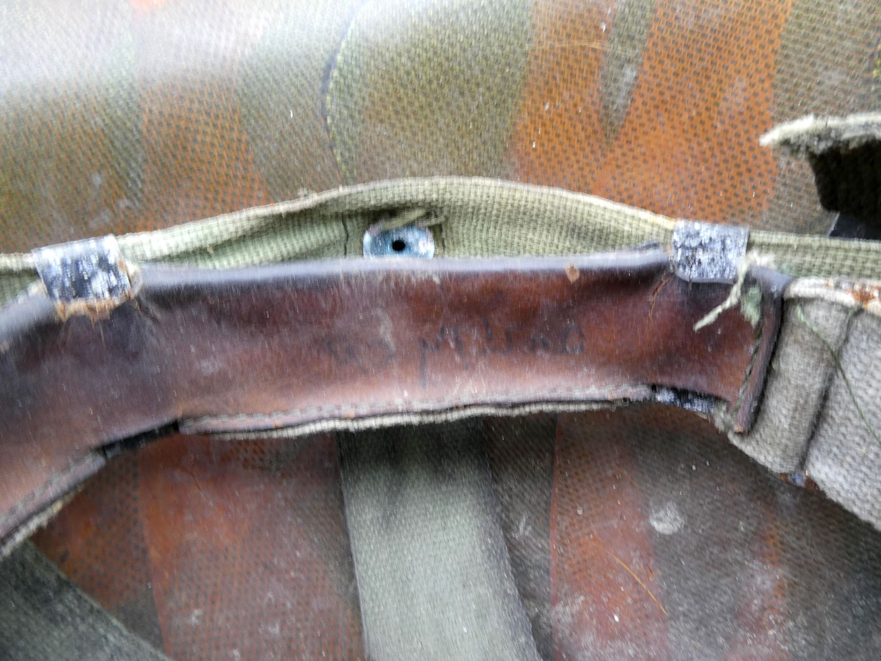 (1) GREEN PAINTED STEEL SHELL, SHELL MARKED: "9633" NEAR FRONT, FIBER HELMET LINER WITH GREEN CANVAS & BROWN LEATHER HEAD LINER, MISSING CHIN STRAP, GREEN CANVAS NECKBAND, VARIOUS FAINT / UN-CLEAR MARKINGS ON HEADBAND. SEE PHOTOS.