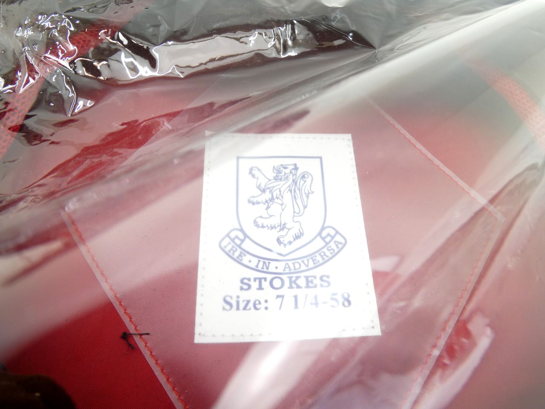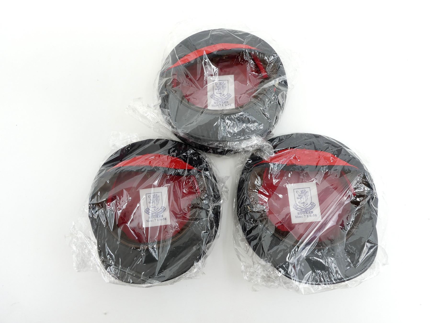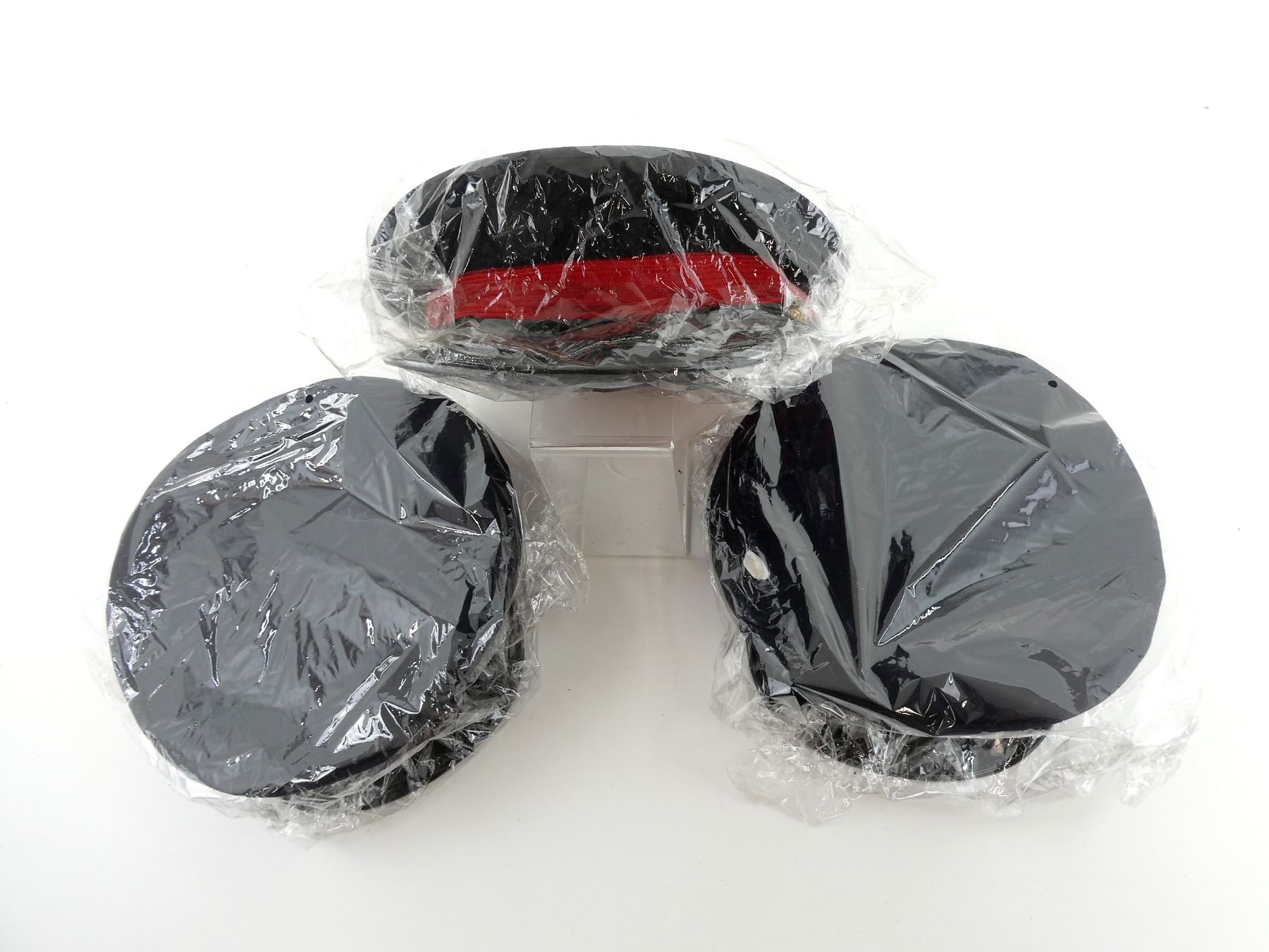 LOT INCLUDES; (3) NAVY BLUE WOOL PEAKED CAPS WITH RED BANDS, LABEL INSIDE MARKED: "STOKES, SIZE: 7 1/4-58" ETC., BRASS BUTTONS MARKED: "POLICE SERVICE" WITH QUEEN'S CROWN, APPEARS NEW OLD STOCK, IN PLASTIC PACKAGING. SEE PHOTOS.