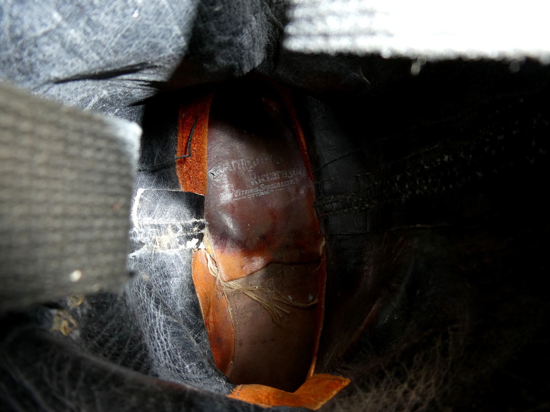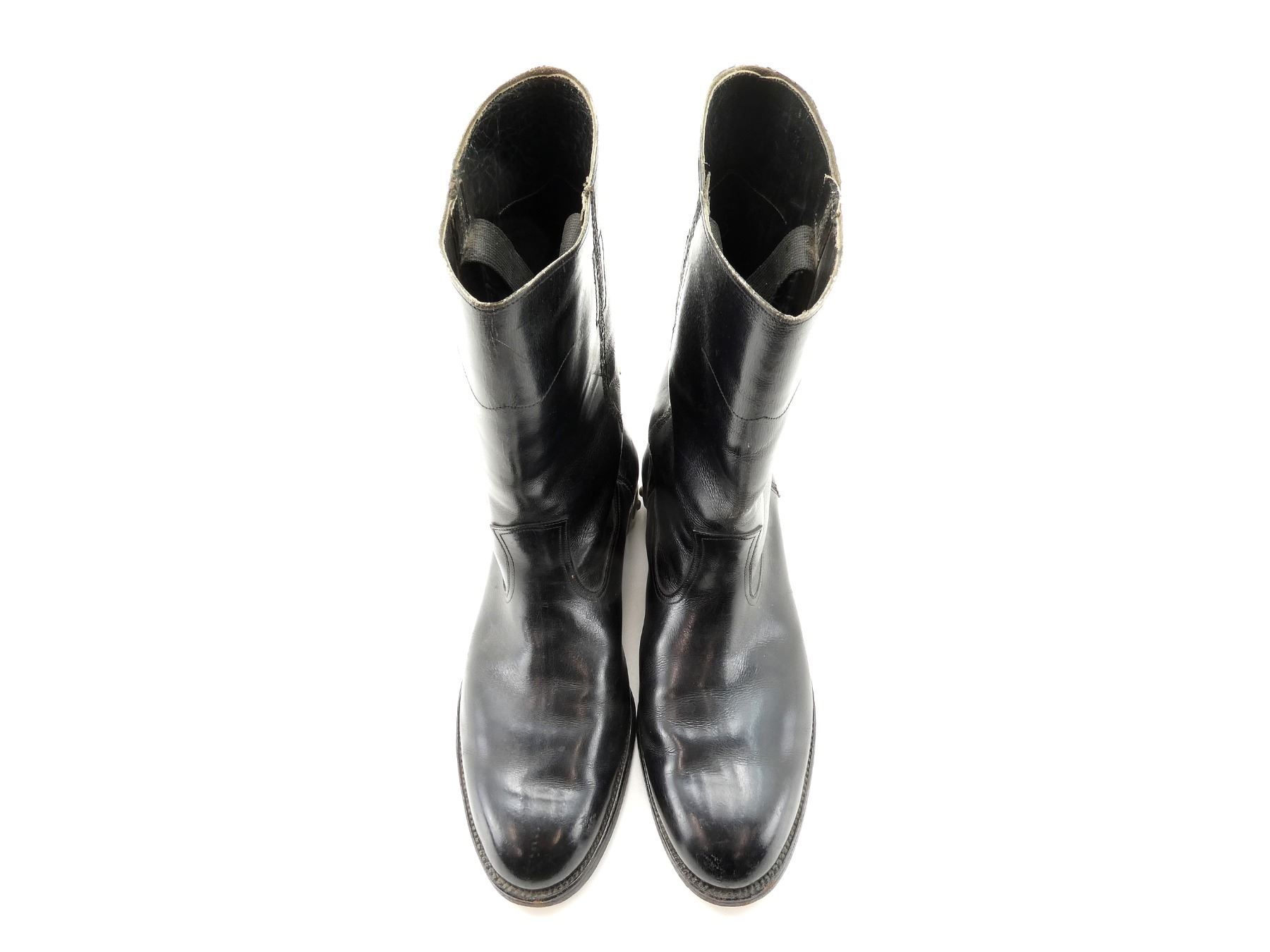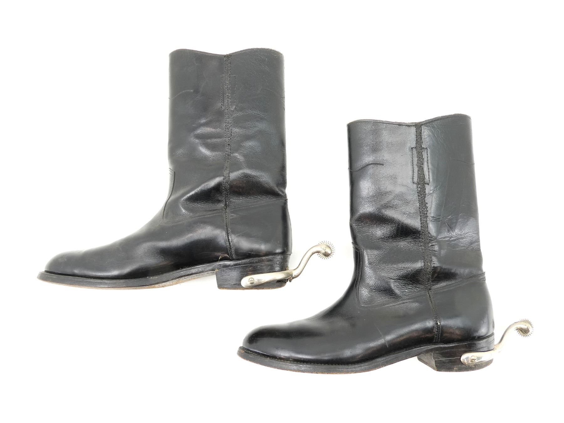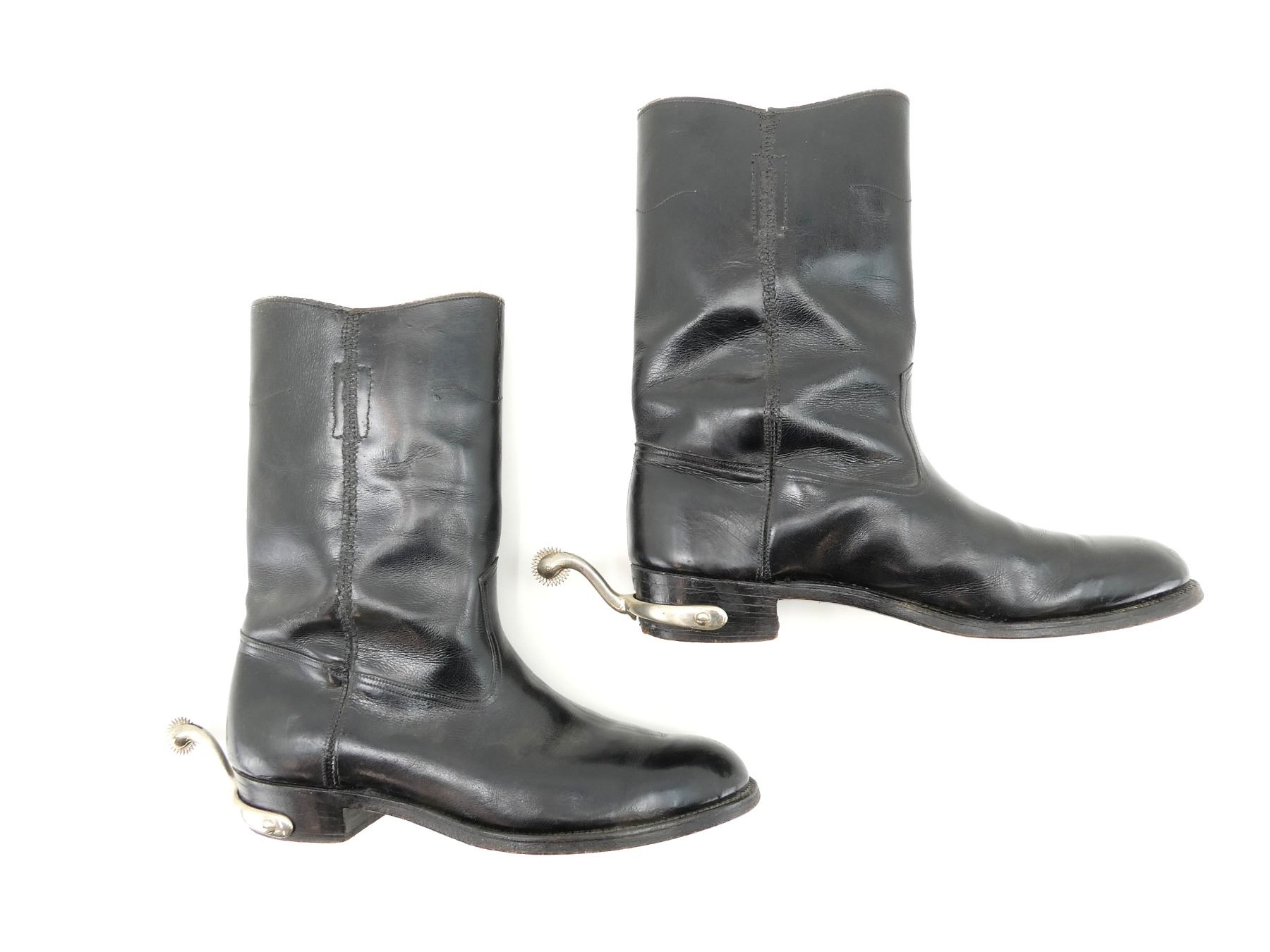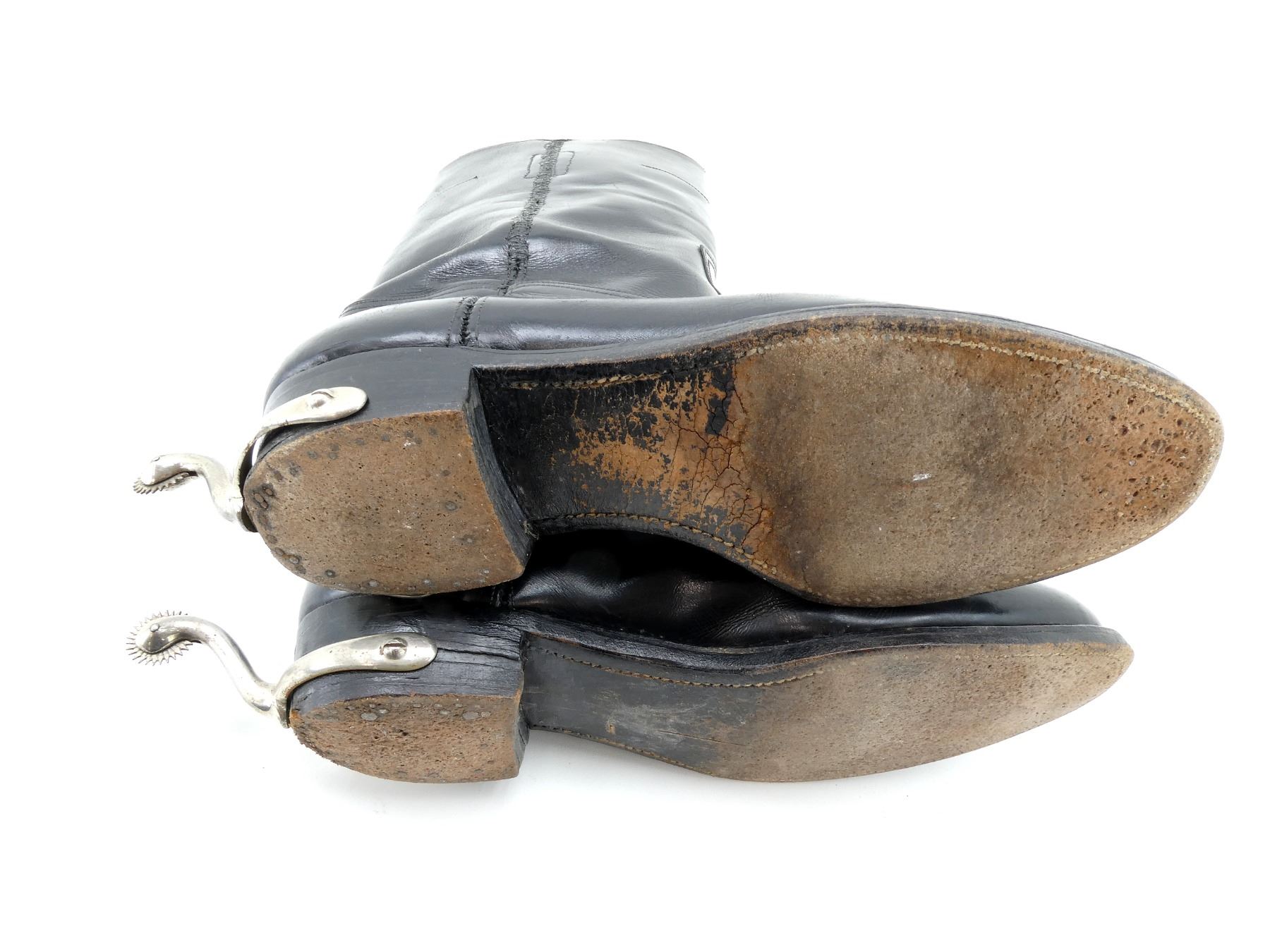 (1) PAIR OF BLACK LEATHER BOOTS WITH SPURS, NO VISIBLE MARKINGS ON SPURS, INSIDE OF BOOTS MARKED: "ARMSTRONG, RICHARDSON, SHOE FITTING SPECIALISTS, OTTAWA", SIZE UNKNOWN, SHOWS AGE / WEAR, WIDEST PART OF SOLE APPROX. 3 7/8" & OVERALL LENGTH APPROX. 11.25". SEE PHOTOS.