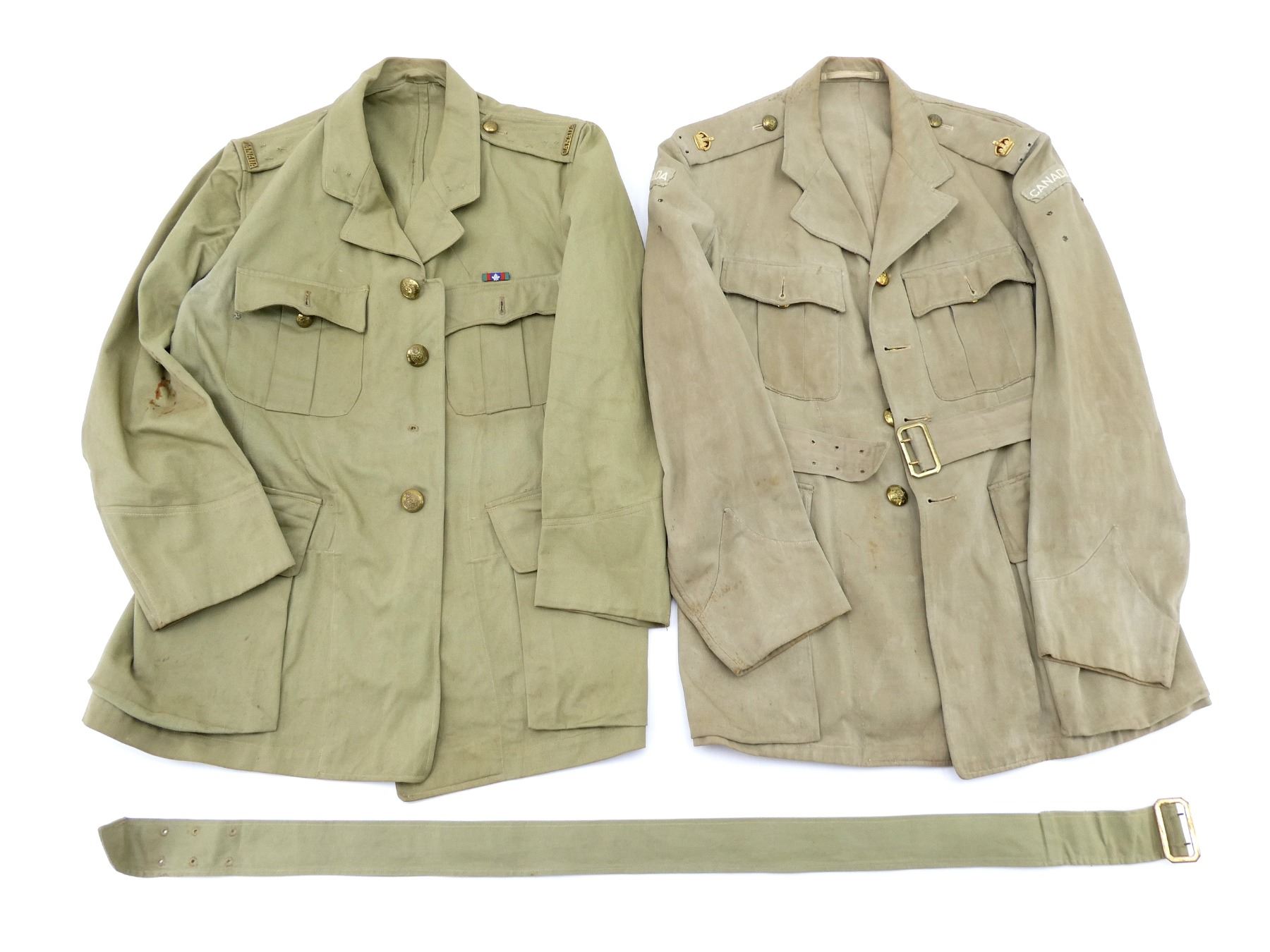 LOT INCLUDES; (1) ARTILLERY KHAKI DRILL TUNIC, VARIOUS FAINT / UN-CLEAR HAND-WRITTEN MARKINGS ON COLLAR, BRASS WITH RED FELT KING'S CROWN SHOULDER BADGES, BRASS KING'S CROWN ARTILLERY "CANADA" BUTTONS, OPEN COLLAR, BUTTON FRONT WITH WAIST BELT, SHOWS AGE / WEAR / TEAR, SHOULDER WIDTH APPROX. 17.5" & (1) ROYAL CANADIAN ARMY MEDICAL CORPS KHAKI DRILL TUNIC, NO VISIBLE MARKINGS, BRASS CANADA SHOULDER TITLE, BRASS KING'S CROWN "R.C.A.M.C." BUTTONS, CVSM RIBBON BAR WITH MAPLE LEAF, BUTTON FRONT (ONE BUTTON IS MISSING), WITH WAIST BELT, SHOWS AGE / WEAR / TEAR, SHOULDER WIDTH APPROX. 17.5". SEE PHOTOS.