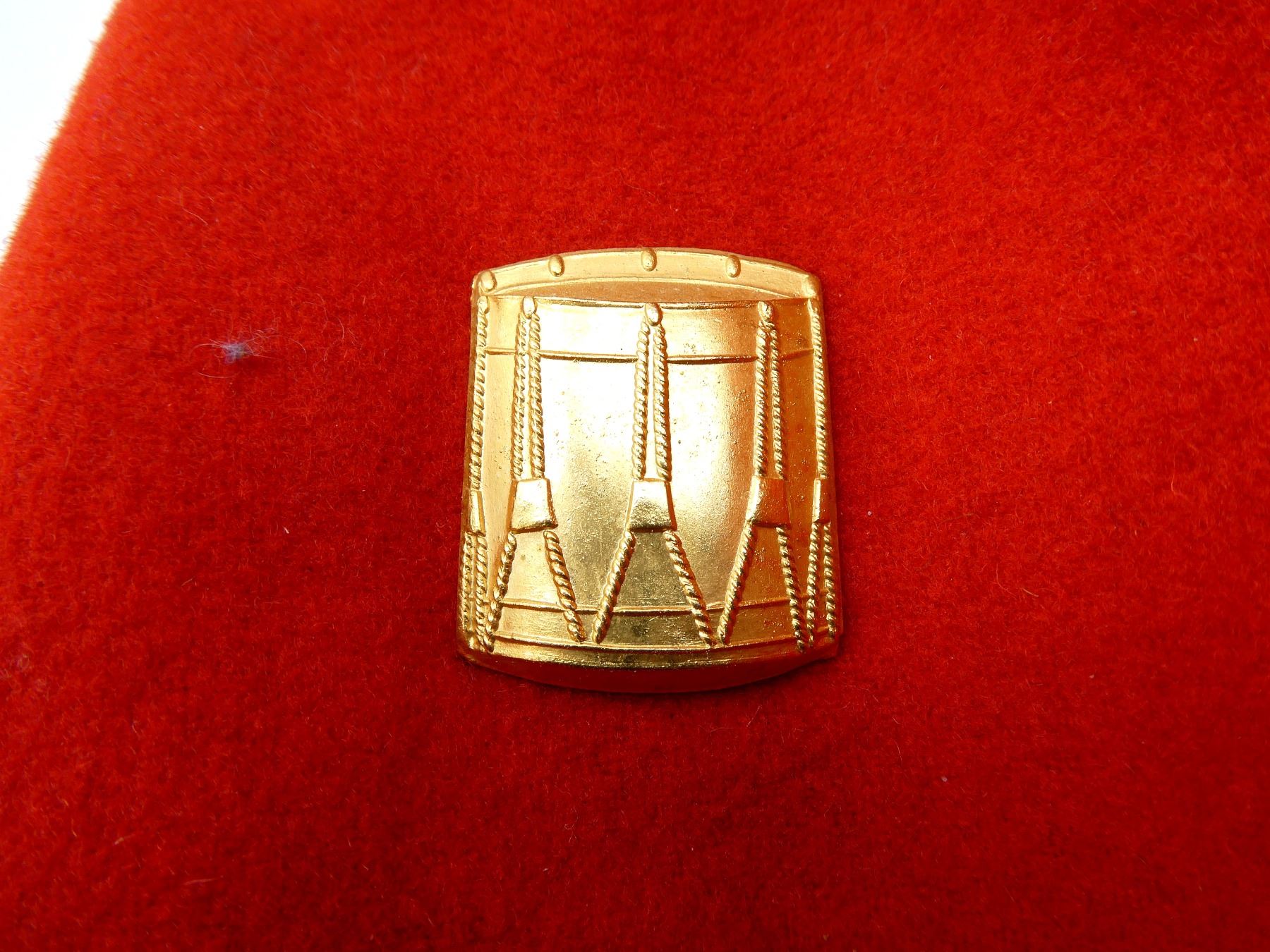 (1) SCARLET RED WOOL TUNIC, SILVER COLOURED BUTTONS WITH MILK THISTLE DESIGNS, BRASS DRUM BADGE ON SHOULDER, NO VISIBLE MARKINGS, BURLAP ON COLLAR IN-BETWEEN LAYERS, CLOSED COLLAR, BUTTON FRONT, SHOWS AGE / WEAR / TEAR, SHOULDER WIDTH APPROX. 17". SEE PHOTOS.