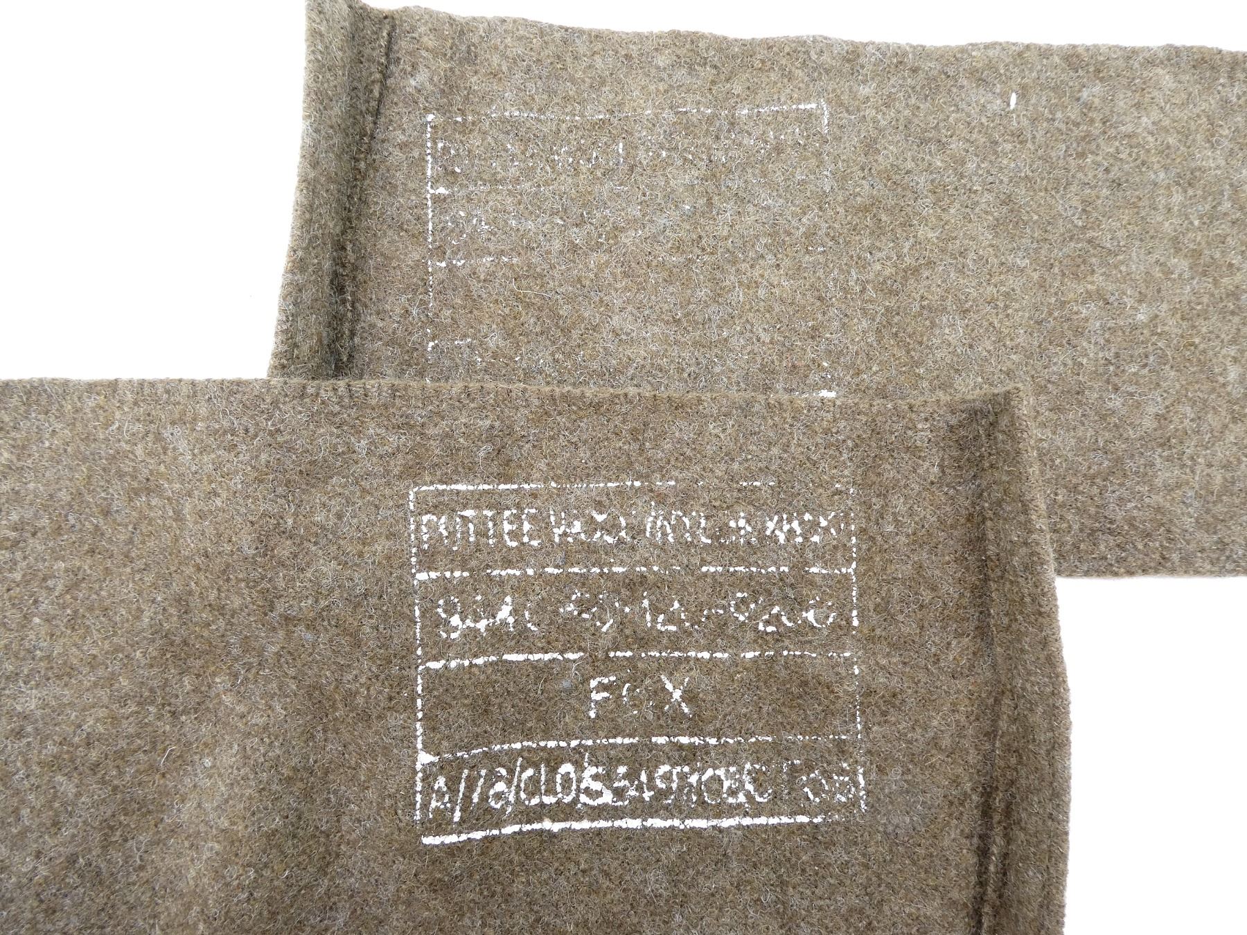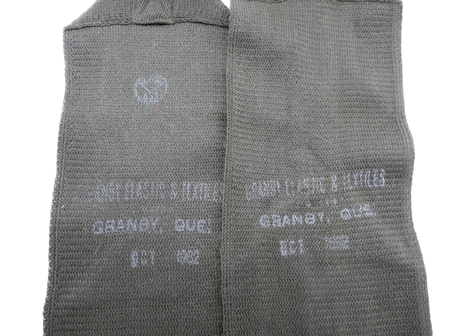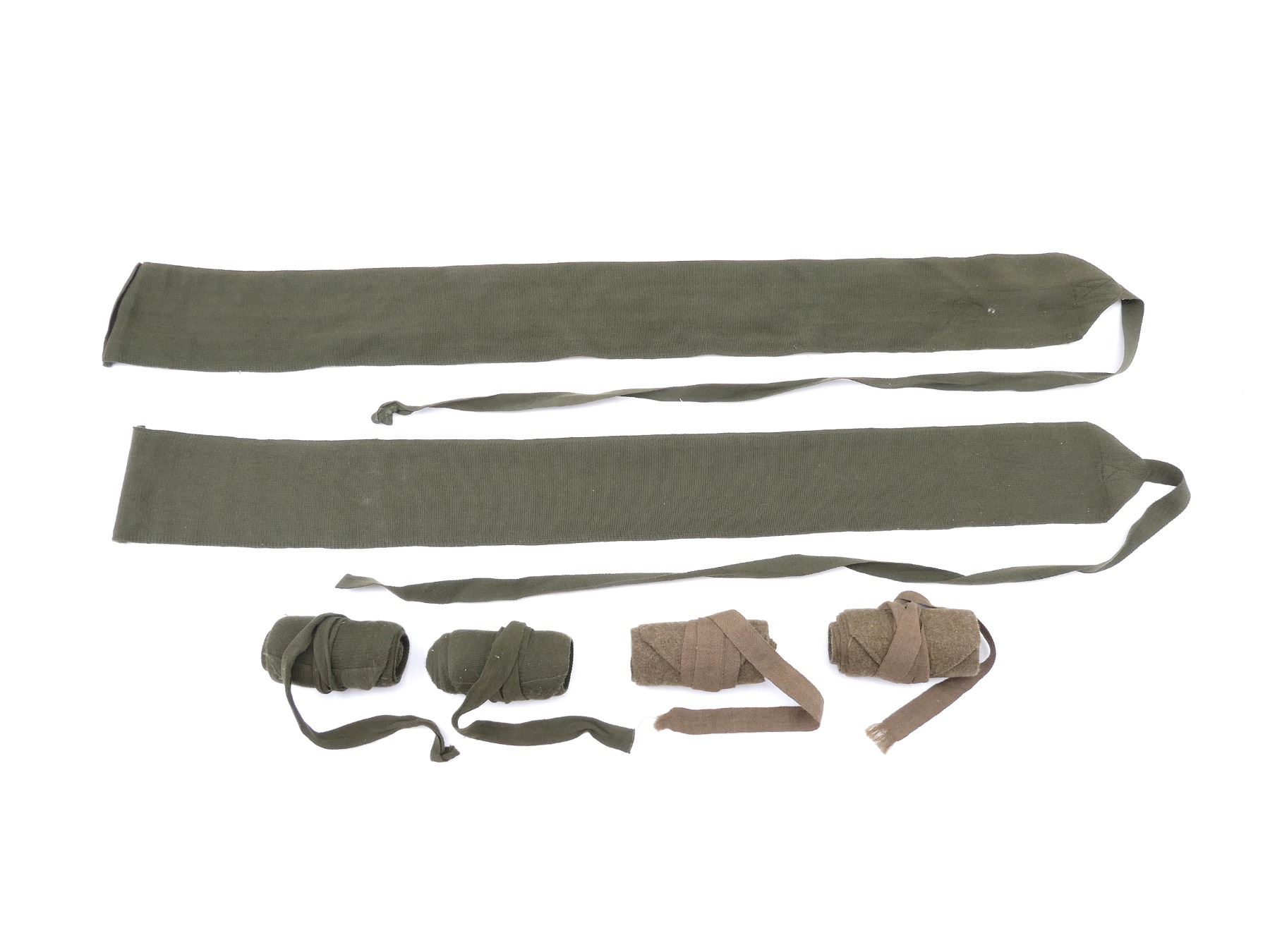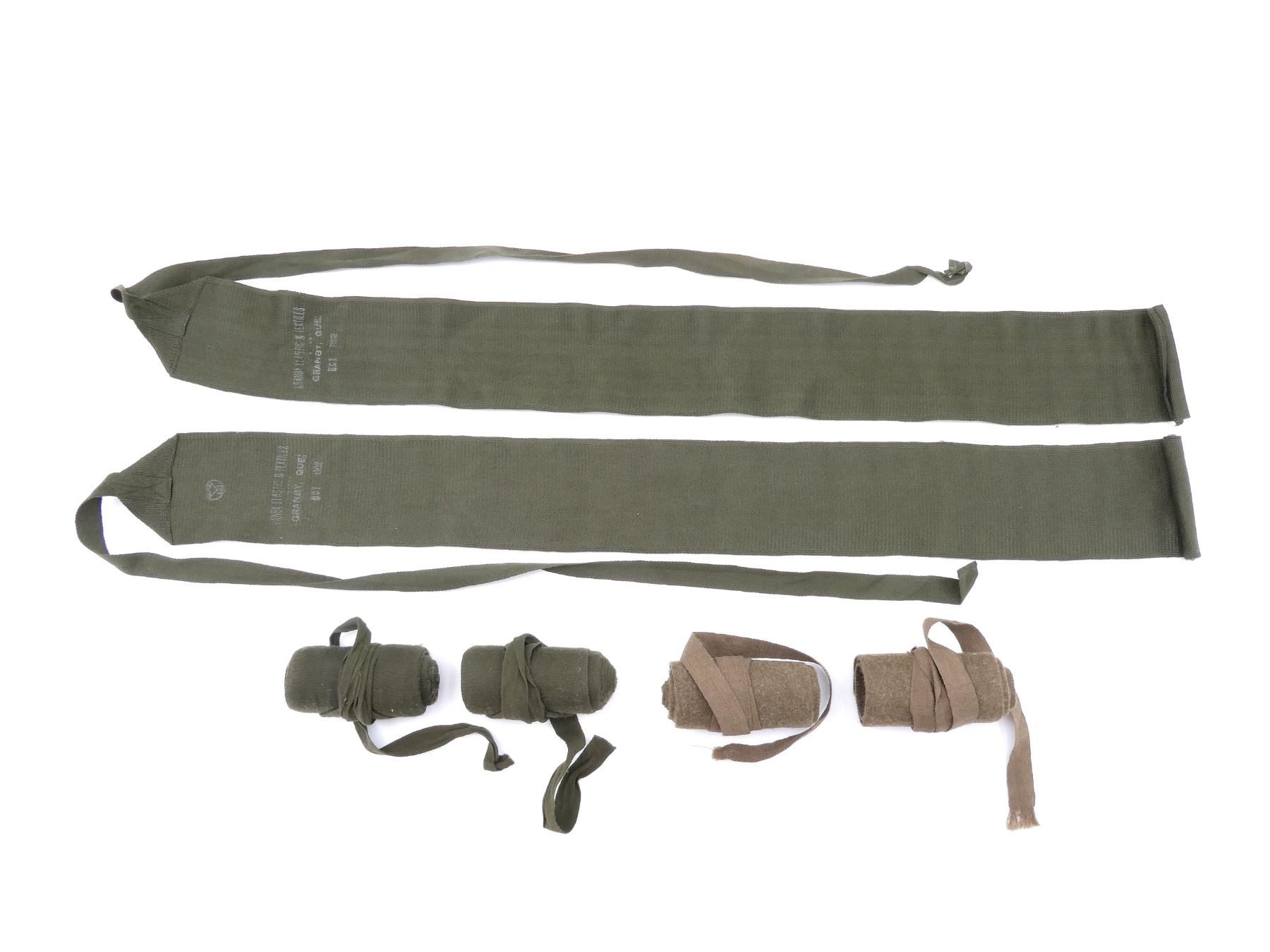 LOT INCLUDES; (2) 1950'S CANADIAN MILITARY PAIRS OF GREEN CLOTH PUTTEES, ONE SET MARKED: "GRANBY ELASTIC & TEXTILES, ????, GRANBY, QUE., OCT 1952" WITH MAPLE LEAF PROOF MARK, APPROX. 4 1/8" WIDE, OTHER SET MARKED: "??? 1952" WITH MAPLE LEAF PROOF MARK, APPROX. 4.25" WIDE & (1) BRITISH MILITARY PAIR OF TAN WOOL PUTTEES, FAINTLY MARKED: "PUTTEE WOOL/ NYLON ???, 8440-?9-120-?200, FOX" ETC., APPROX. 4.5" WIDE. SEE PHOTOS.