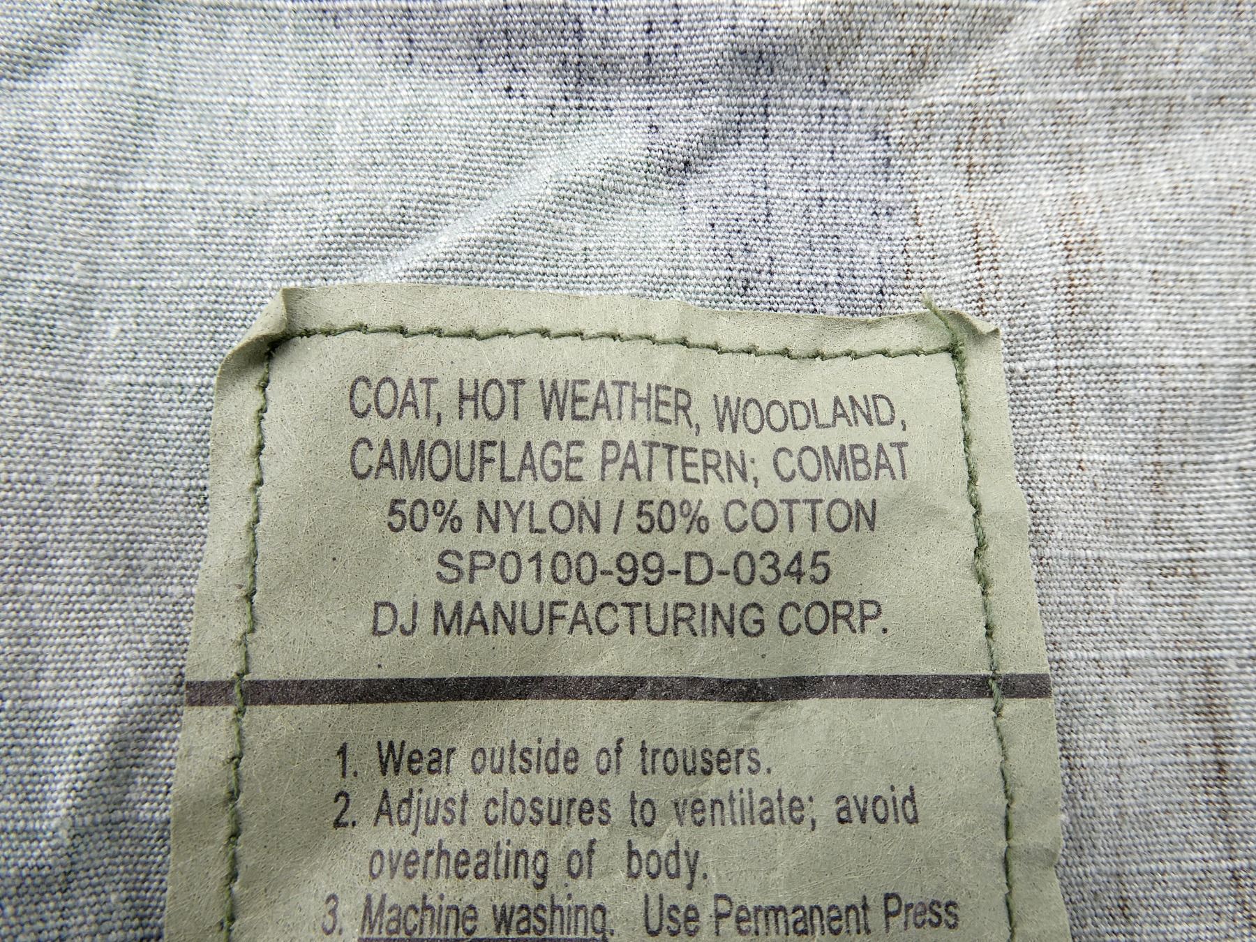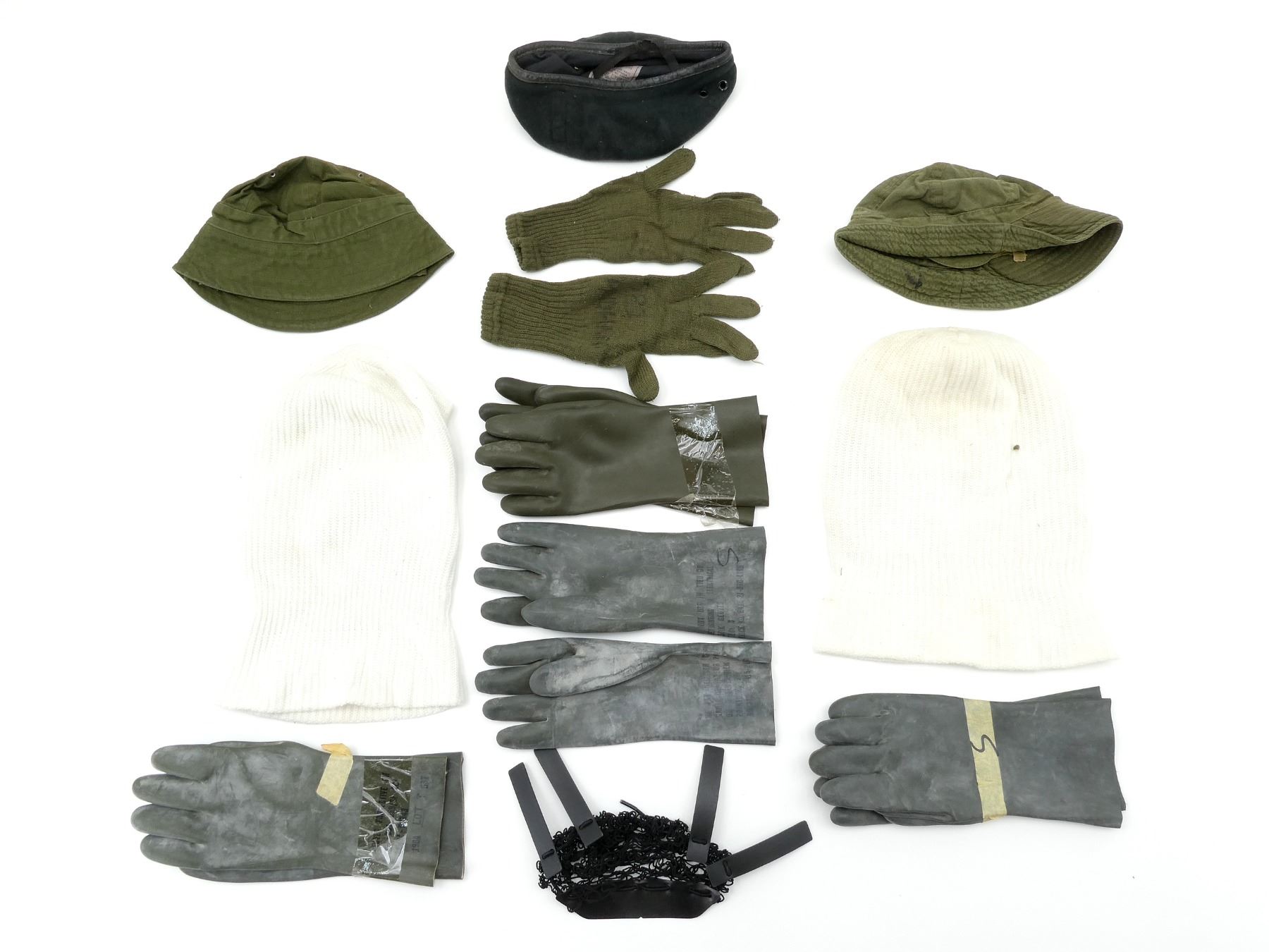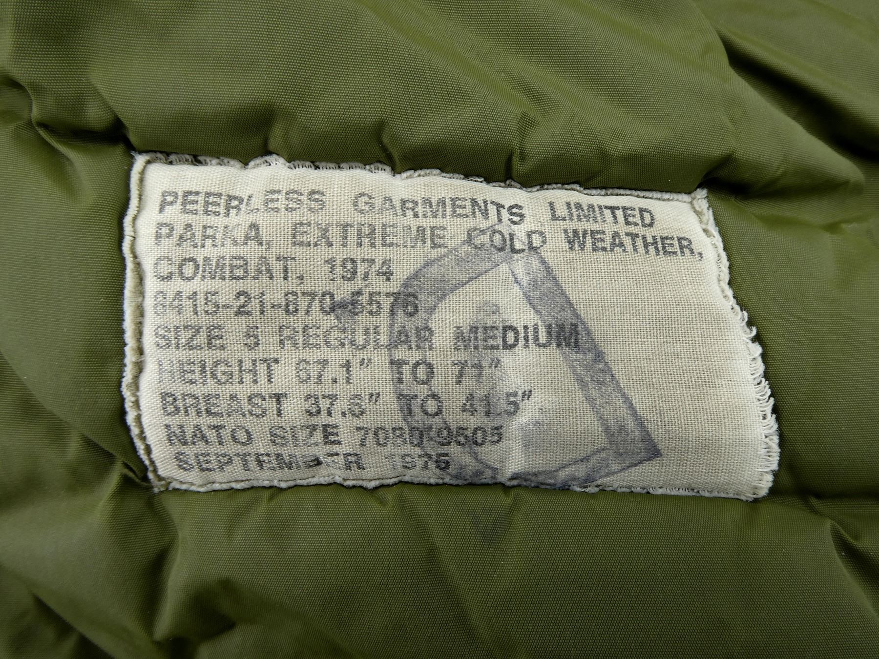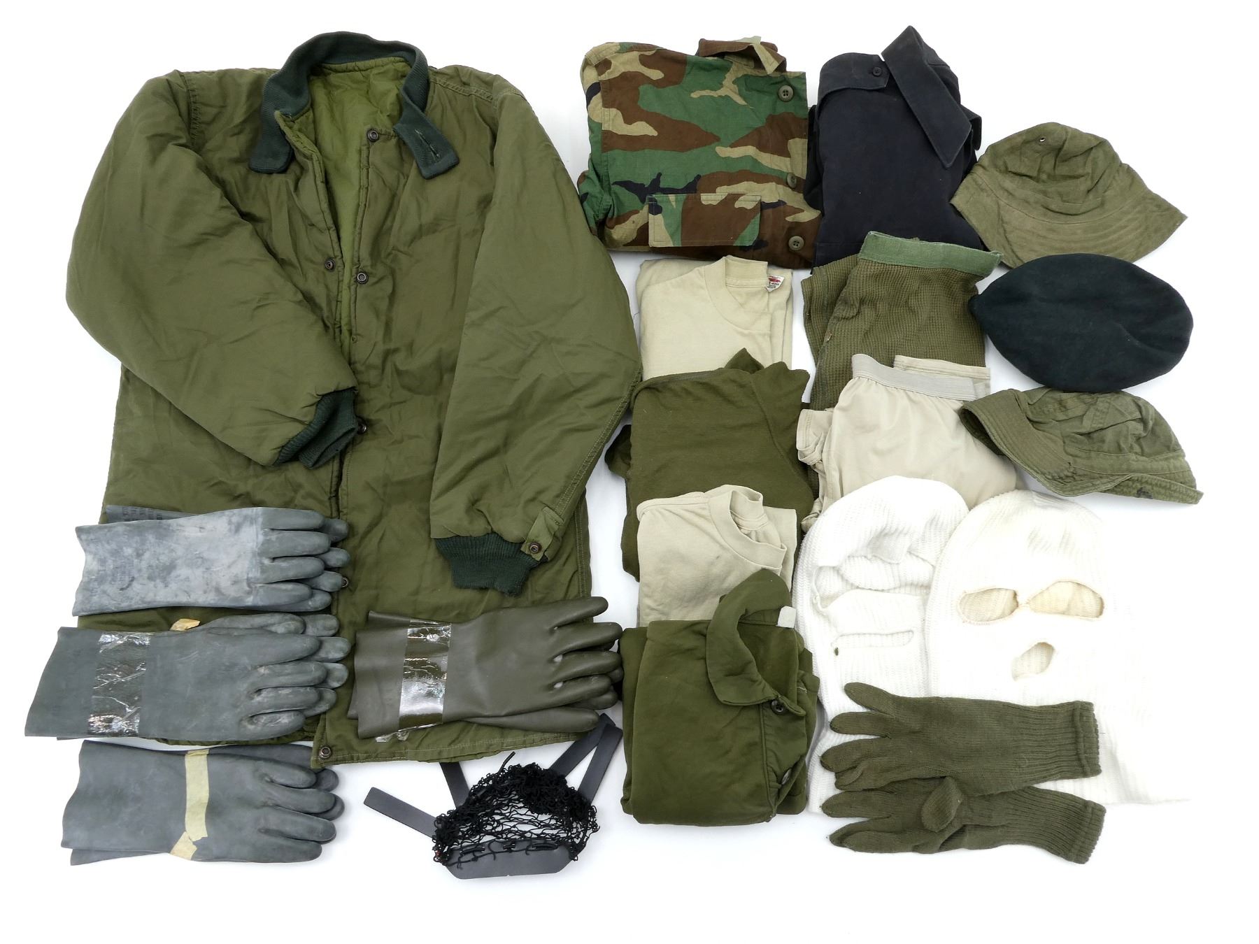 LOT INCLUDES; (1) CANADIAN MILITARY GREEN NYLON EXTREME COLD WEATHER COMBAT PARKA, SIZE 5 REGULAR-MEDIUM, VARIOUS LABELS / MARKINGS, SNAP CLOSURE, SHOWS AGE / WEAR / TEAR, (1) U.S. MILITARY WOODLAND CAMO HOT WEATHER COMBAT SHIRT, SIZE MEDIUM-LONG, VARIOUS LABELS / MARKINGS, BUTTON FRONT, SHOWS WEAR, (4) CANADIAN MILITARY PAIRS OF RUBBER PROTECTIVE GLOVES, ALL SIZE SMALL, VARIOUS INK STAMP MARKINGS, SHOWS WEAR, (1) CANADIAN MILITARY BLUE SHORT-SLEEVED SHIRT, BUTTON-FRONT, VARIOUS LABELS / MARKINGS, SHOWS WEAR, SHOULDER WIDTH APPROX. 17.5", (2) U.S. MILITARY T-SHIRTS, SIZE MEDIUM (38-40), VARIOUS LABELS / MARKINGS ON ONE, SHOWS WEAR, ETC. SEE PHOTOS.