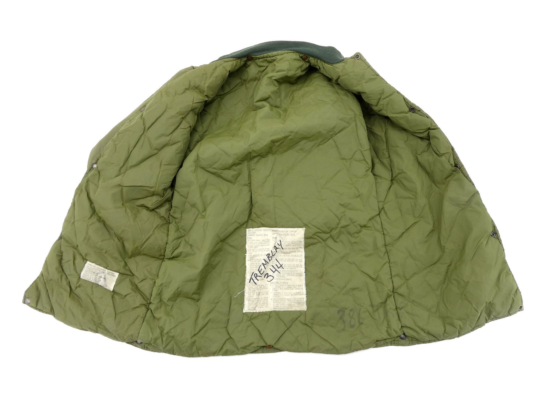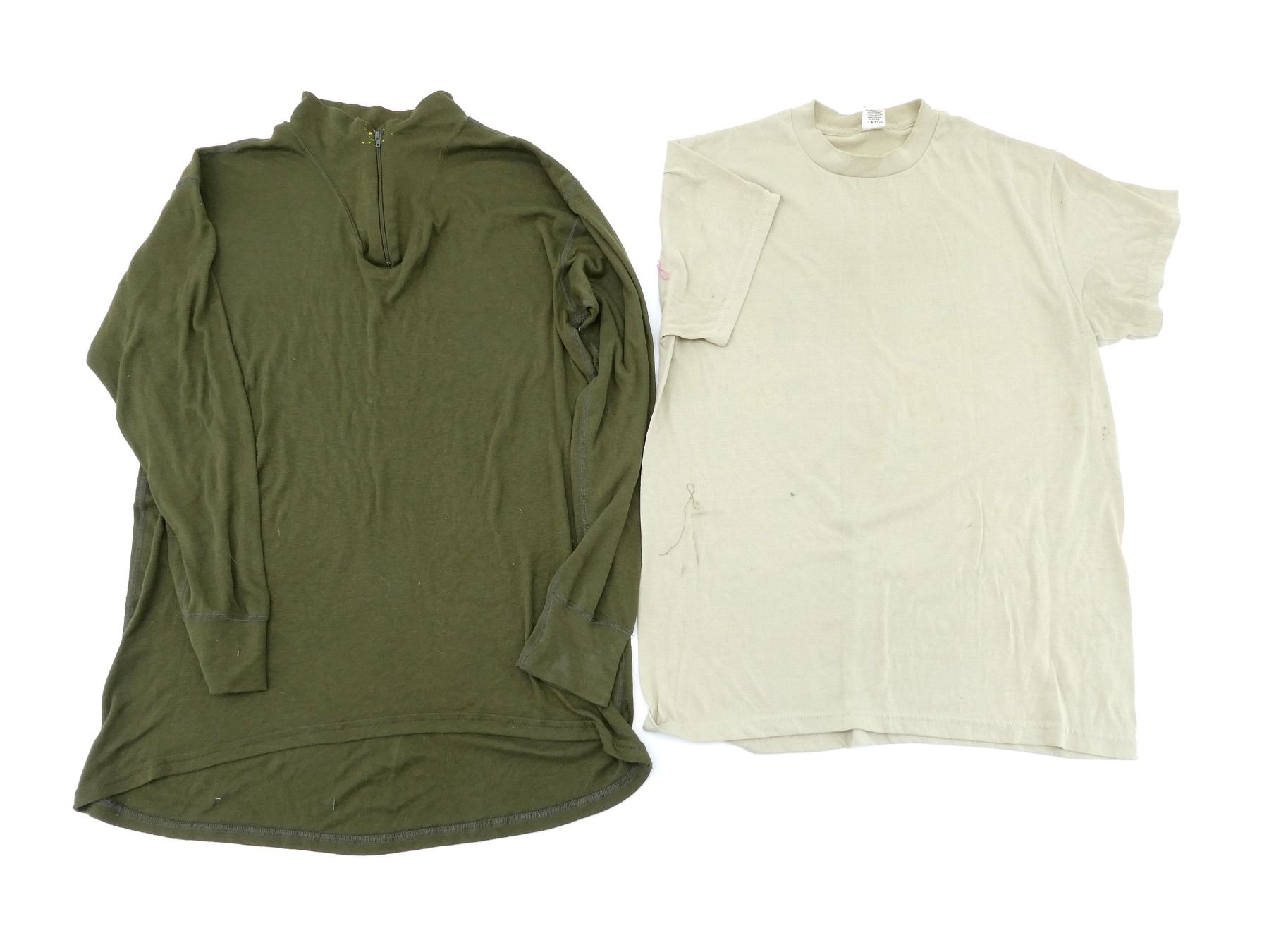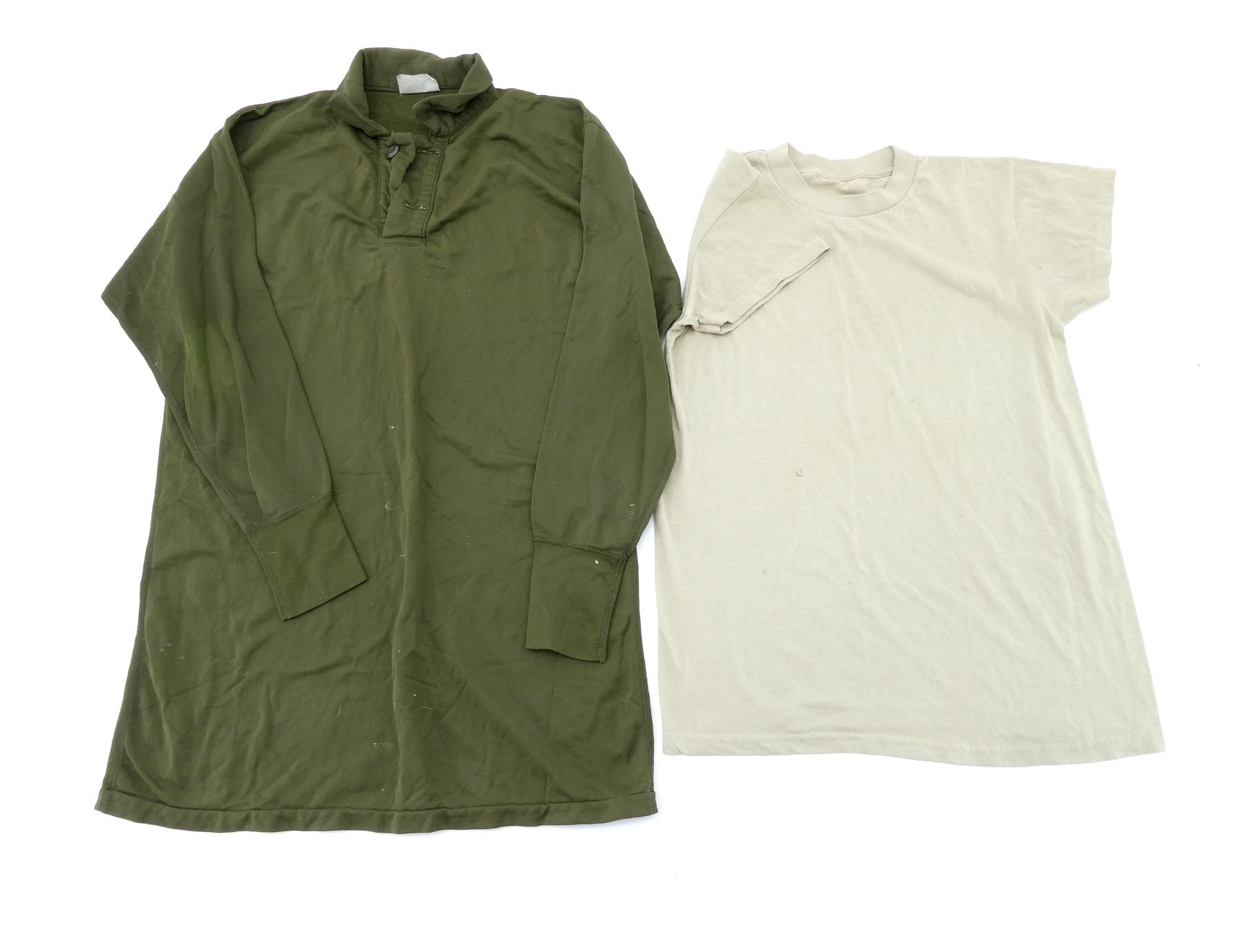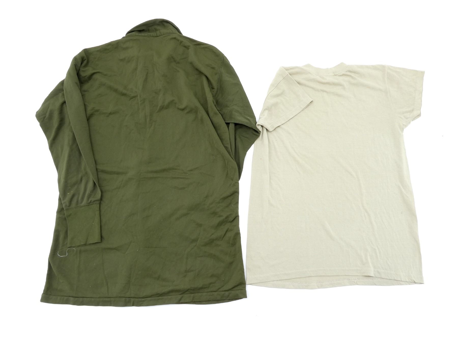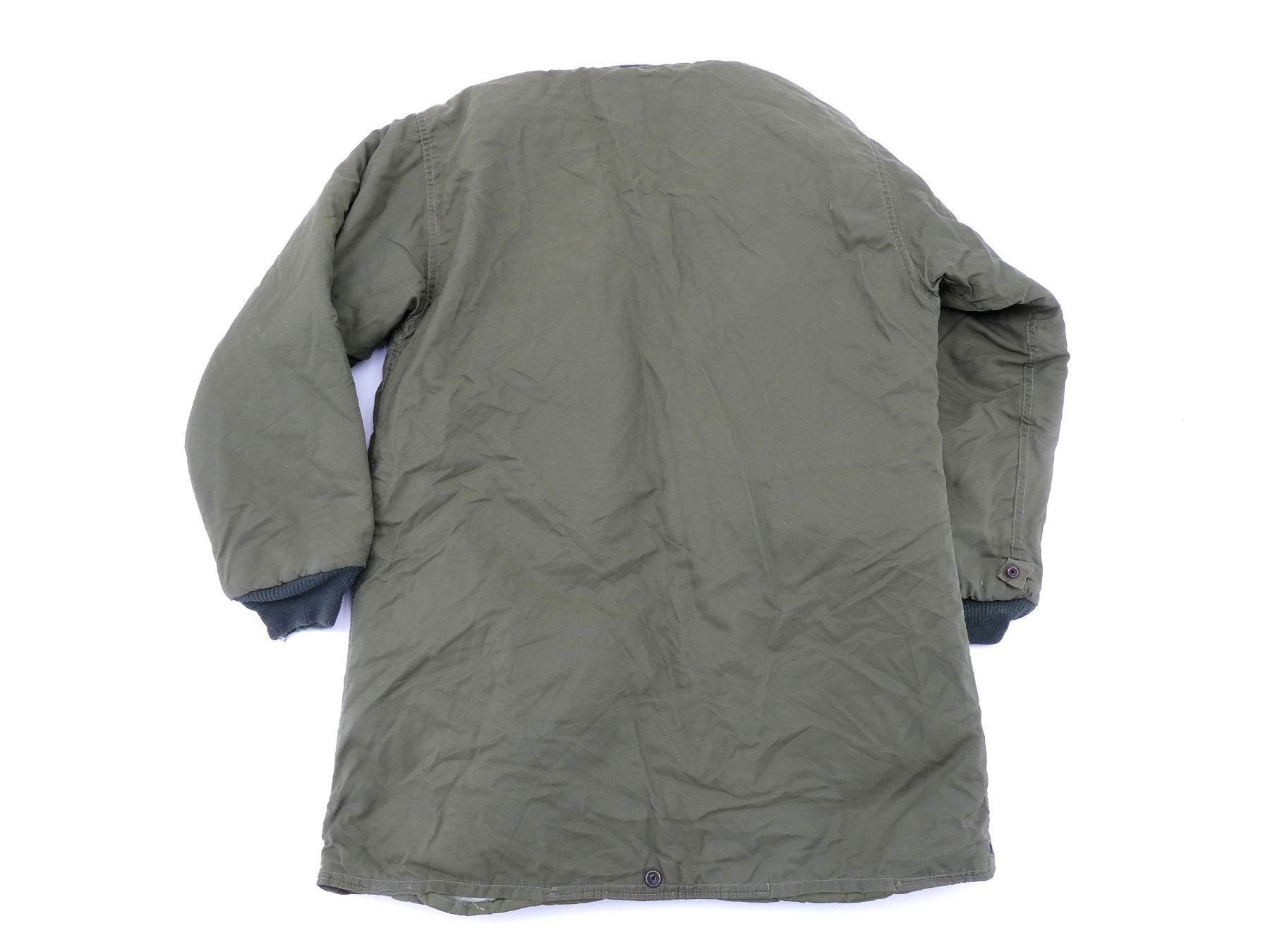 LOT INCLUDES; (1) CANADIAN MILITARY GREEN NYLON EXTREME COLD WEATHER COMBAT PARKA, SIZE 5 REGULAR-MEDIUM, VARIOUS LABELS / MARKINGS, SNAP CLOSURE, SHOWS AGE / WEAR / TEAR, (1) U.S. MILITARY WOODLAND CAMO HOT WEATHER COMBAT SHIRT, SIZE MEDIUM-LONG, VARIOUS LABELS / MARKINGS, BUTTON FRONT, SHOWS WEAR, (4) CANADIAN MILITARY PAIRS OF RUBBER PROTECTIVE GLOVES, ALL SIZE SMALL, VARIOUS INK STAMP MARKINGS, SHOWS WEAR, (1) CANADIAN MILITARY BLUE SHORT-SLEEVED SHIRT, BUTTON-FRONT, VARIOUS LABELS / MARKINGS, SHOWS WEAR, SHOULDER WIDTH APPROX. 17.5", (2) U.S. MILITARY T-SHIRTS, SIZE MEDIUM (38-40), VARIOUS LABELS / MARKINGS ON ONE, SHOWS WEAR, ETC. SEE PHOTOS.
