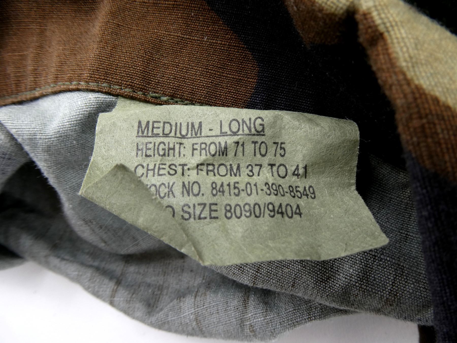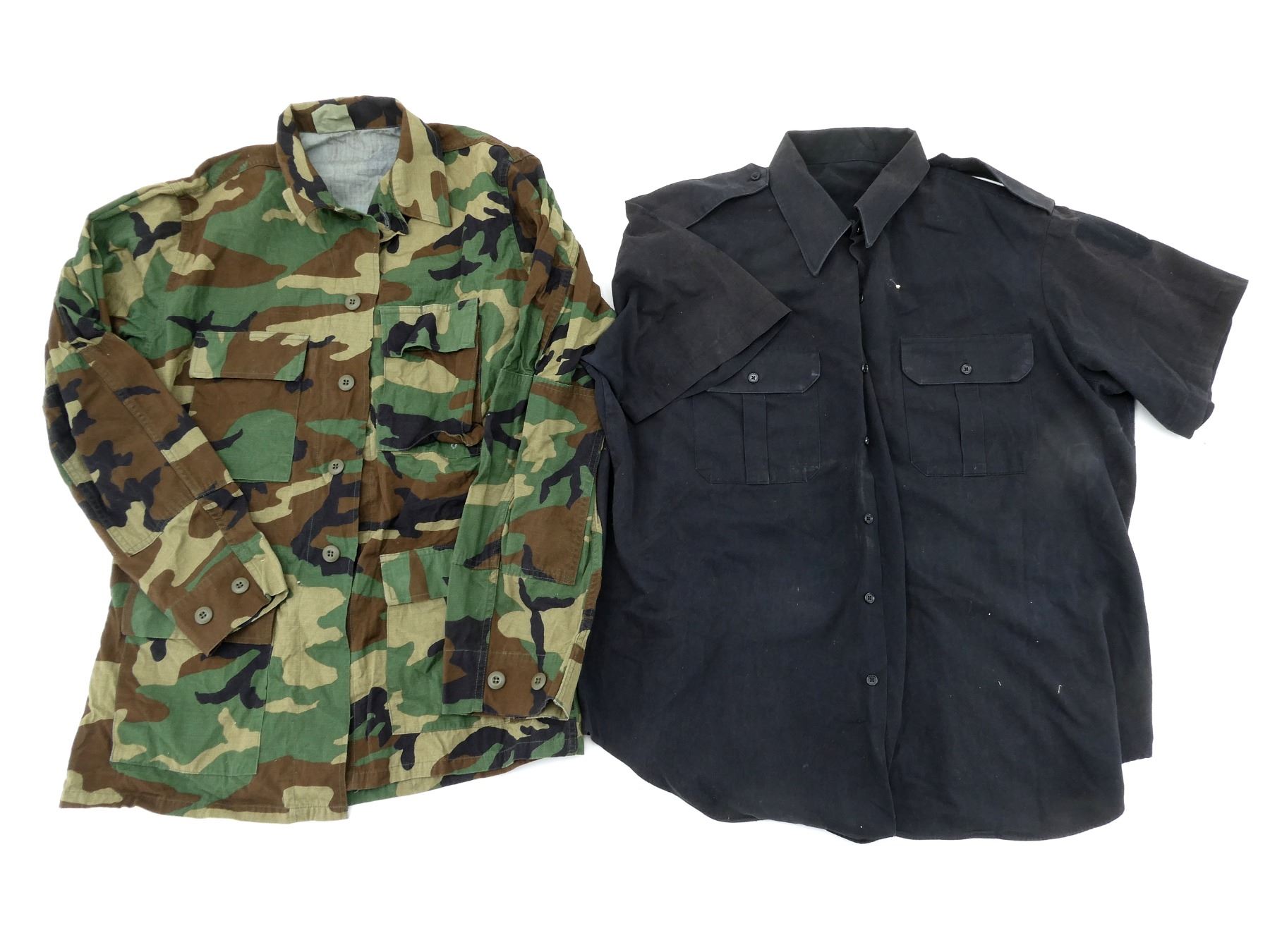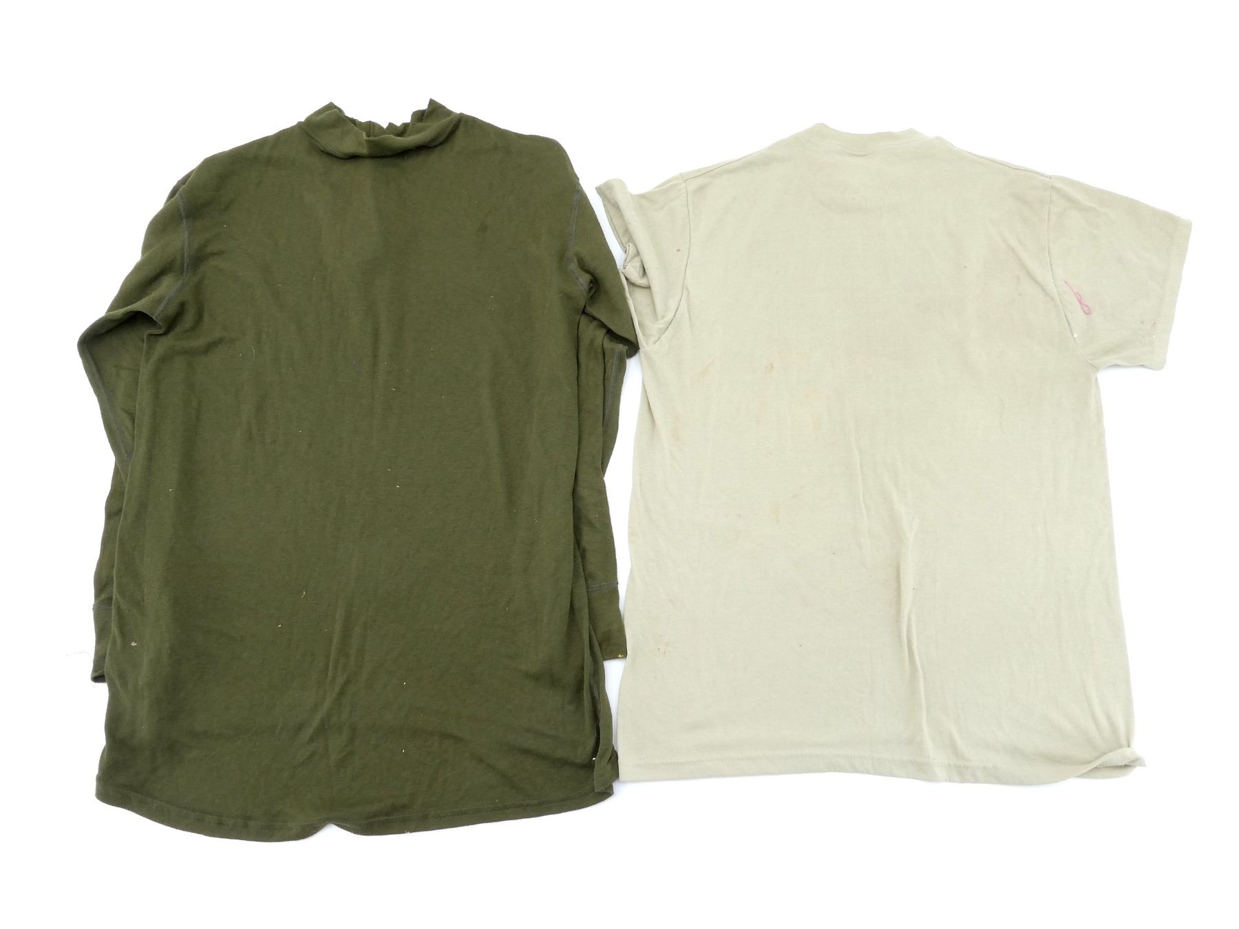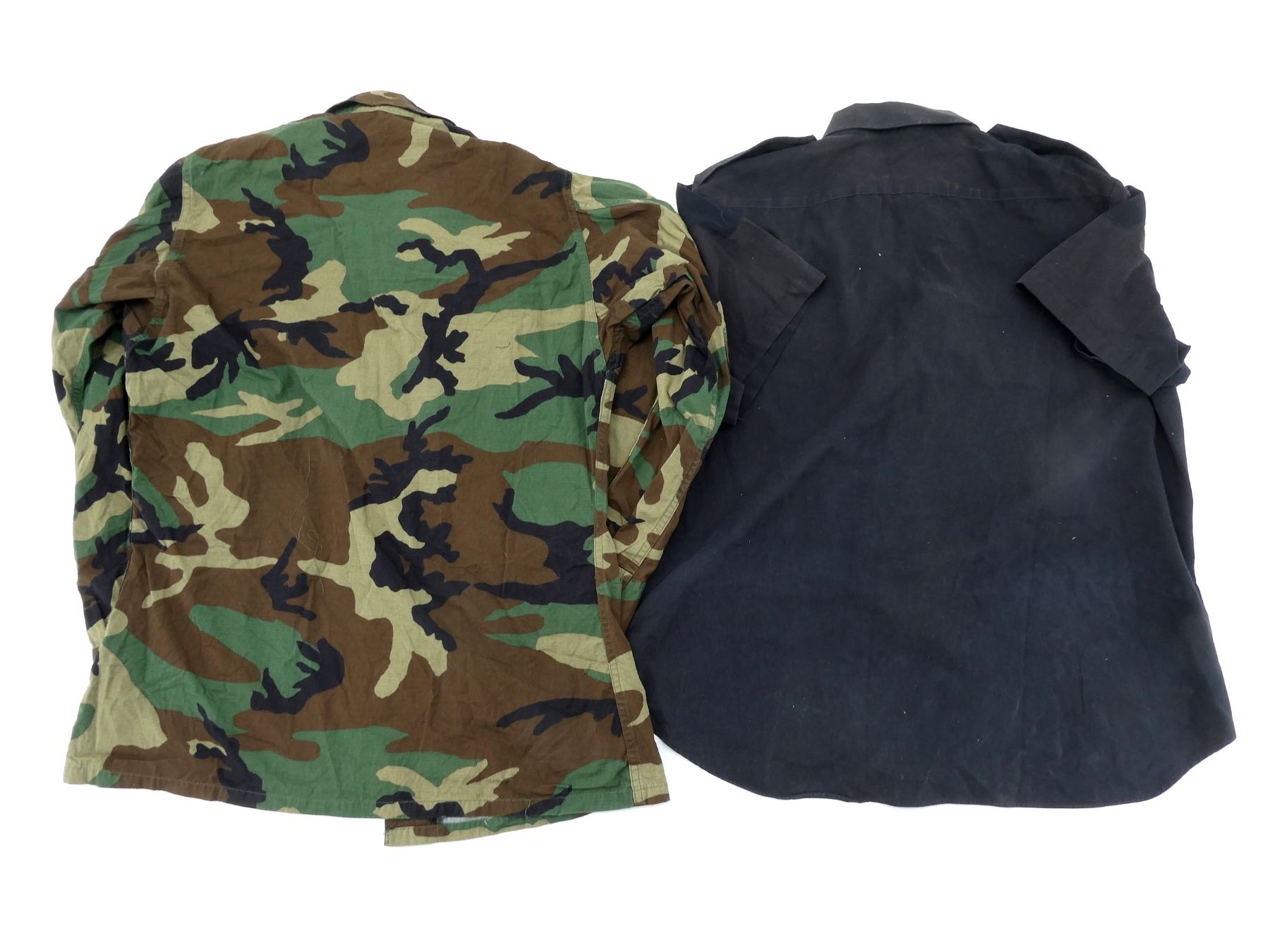 LOT INCLUDES; (1) CANADIAN MILITARY GREEN NYLON EXTREME COLD WEATHER COMBAT PARKA, SIZE 5 REGULAR-MEDIUM, VARIOUS LABELS / MARKINGS, SNAP CLOSURE, SHOWS AGE / WEAR / TEAR, (1) U.S. MILITARY WOODLAND CAMO HOT WEATHER COMBAT SHIRT, SIZE MEDIUM-LONG, VARIOUS LABELS / MARKINGS, BUTTON FRONT, SHOWS WEAR, (4) CANADIAN MILITARY PAIRS OF RUBBER PROTECTIVE GLOVES, ALL SIZE SMALL, VARIOUS INK STAMP MARKINGS, SHOWS WEAR, (1) CANADIAN MILITARY BLUE SHORT-SLEEVED SHIRT, BUTTON-FRONT, VARIOUS LABELS / MARKINGS, SHOWS WEAR, SHOULDER WIDTH APPROX. 17.5", (2) U.S. MILITARY T-SHIRTS, SIZE MEDIUM (38-40), VARIOUS LABELS / MARKINGS ON ONE, SHOWS WEAR, ETC. SEE PHOTOS.