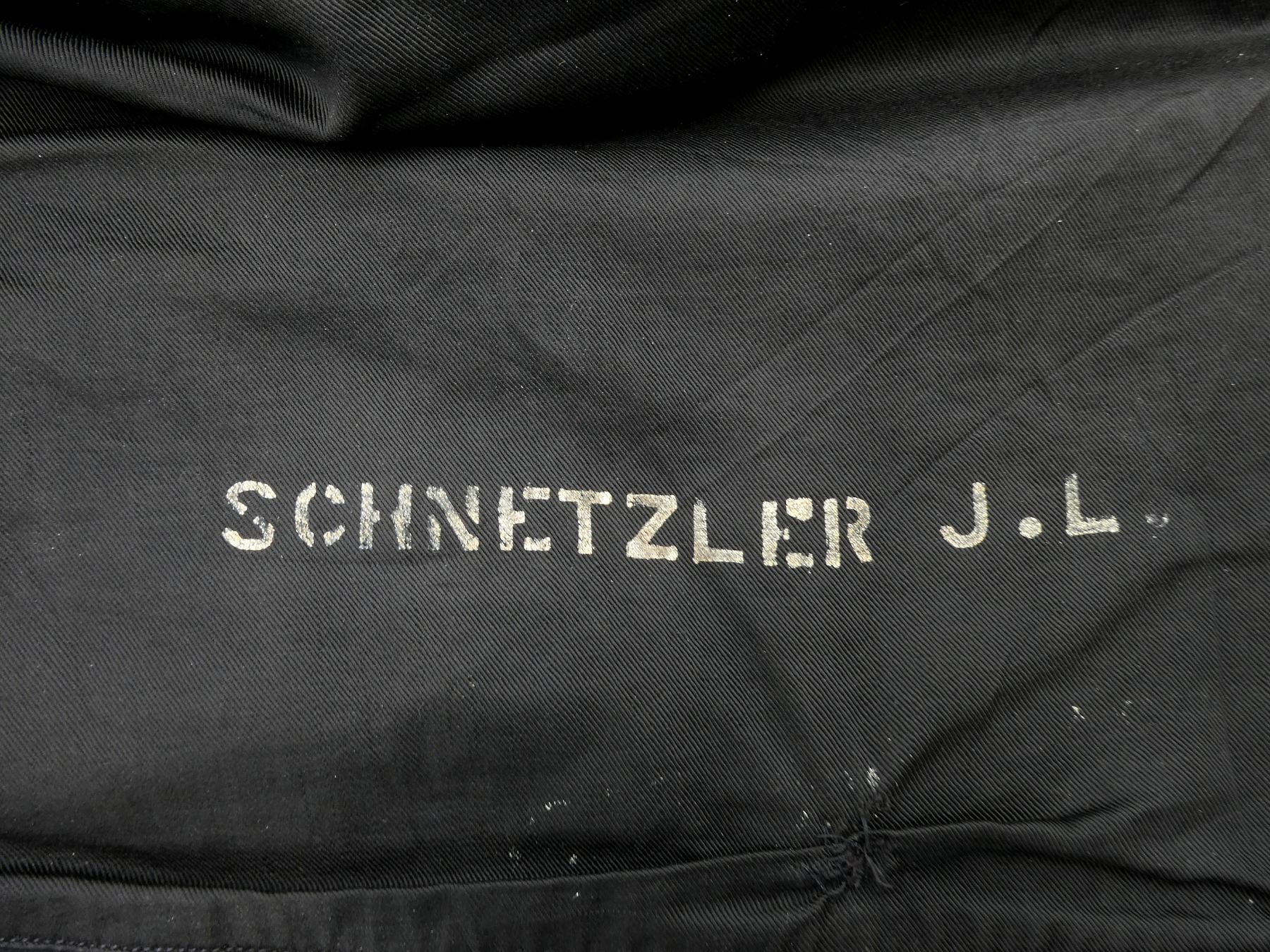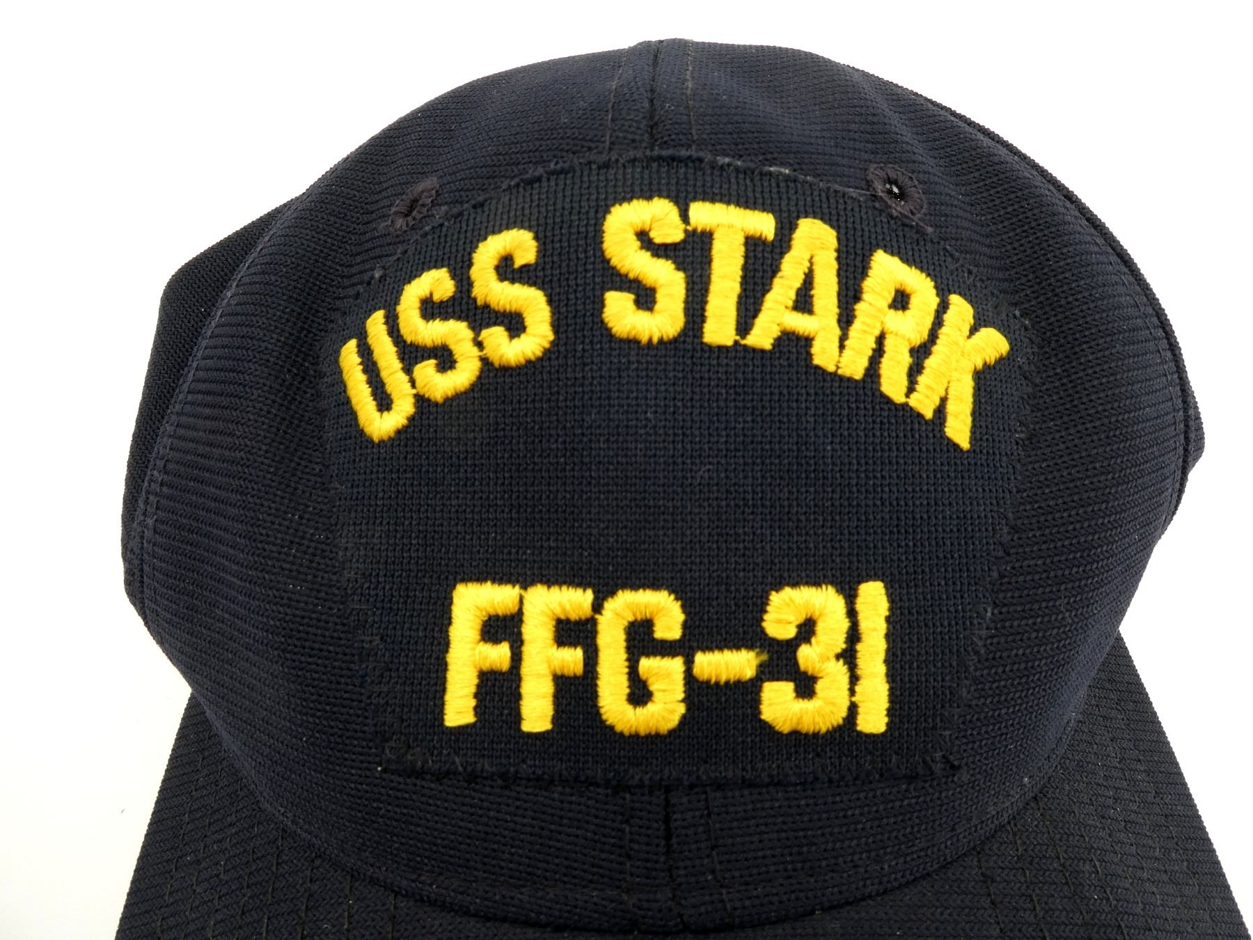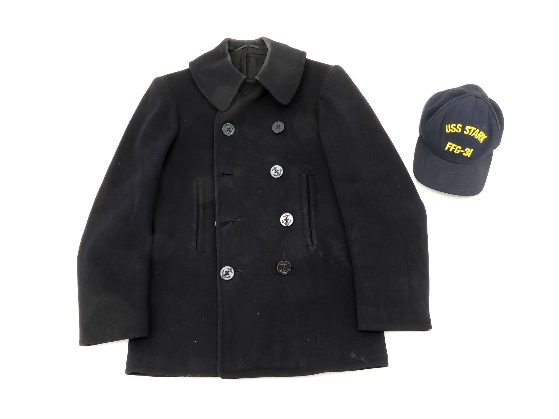 LOT INCLUDES; (1) NAVY BLUE WOOL PEACOAT, INK STAMPED: "SCHNETZLER J.L.", "J.L.S.", EMBROIDERED LABEL MARKED: "MANUFACTURED BY, NAVAL CLOTHING FACTORY, NAME, RATE", DOUBLE-BREASTED BUTTON FRONT, BLACK PLASTIC ANCHOR BUTTONS, SHOWS AGE / WEAR / TEAR, SHOULDER WIDTH APPROX. 17.5" & (1) BASEBALL CAP MARKED: "USS STARK, FFG-31" WITH ADJUSTABLE BACK STRAP, VARIOUS MARKINGS ON LABEL, SHOWS AGE. SEE PHOTOS.