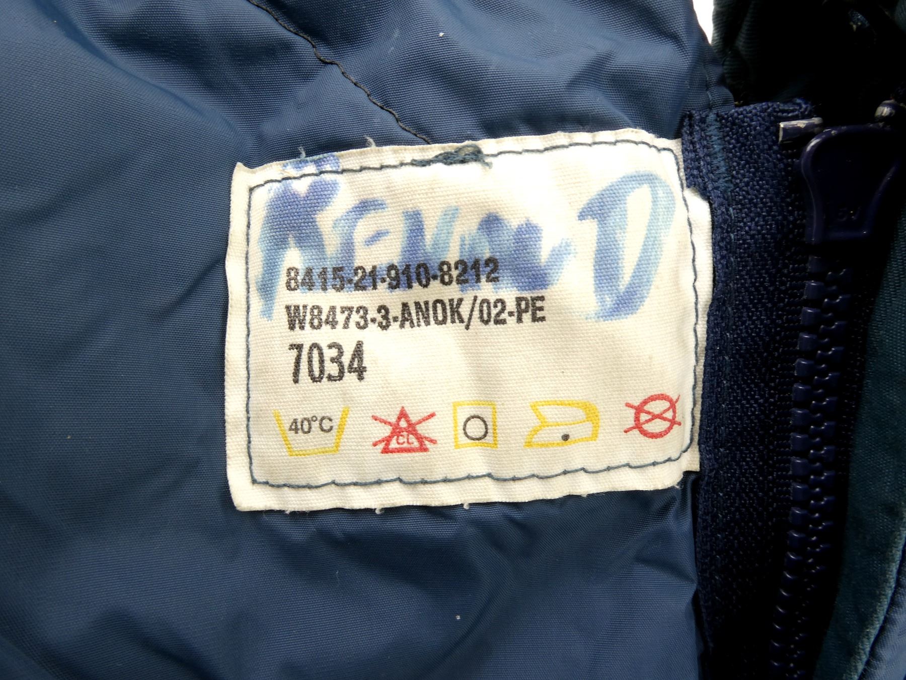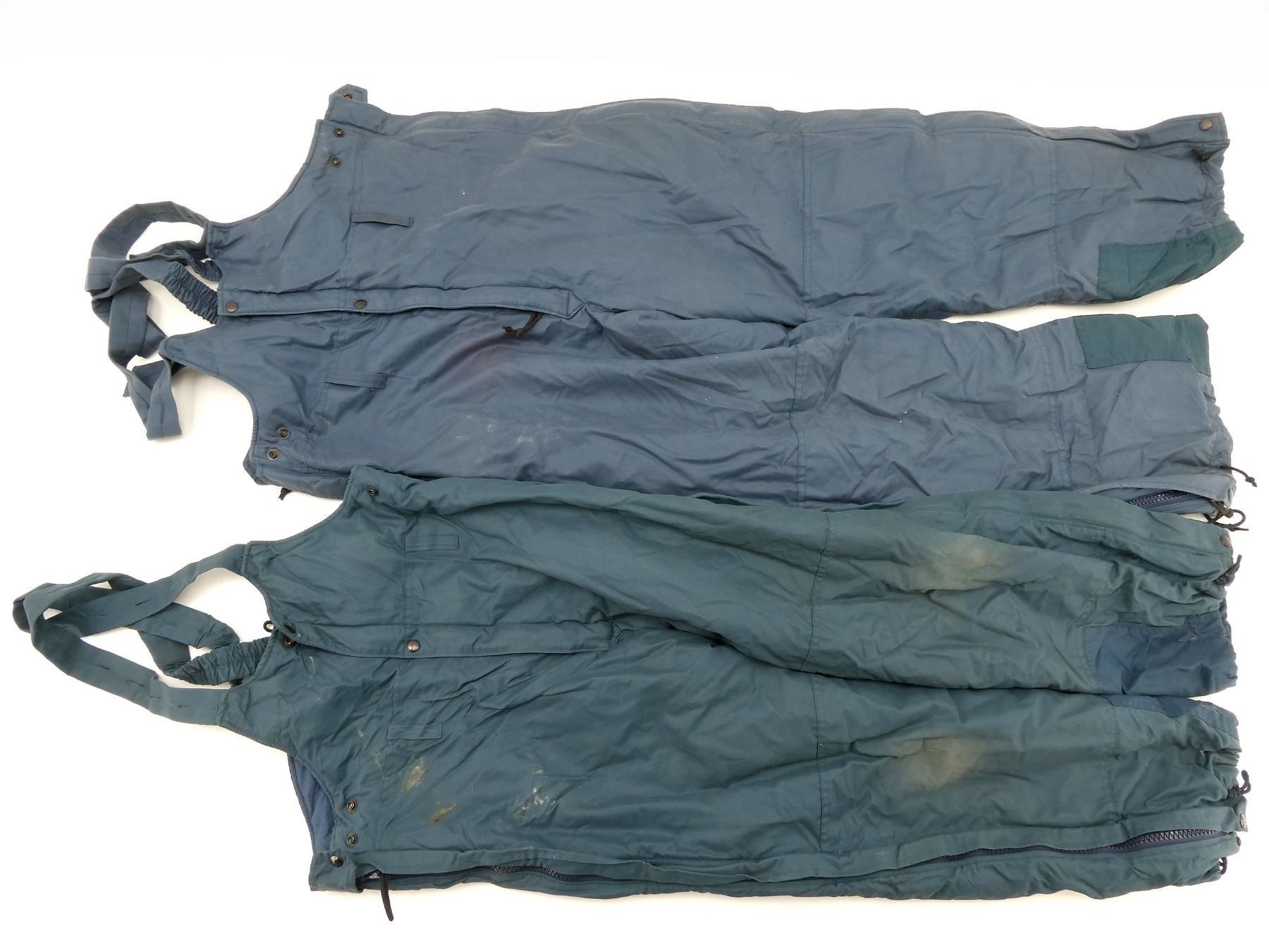LOT INCLUDES; (2) BLUE NYLON COLD WEATHER OVERALLS, SIZES 7034 (MEDIUM-REGULAR) / 7634 (6'3" HEIGHT, 34" WAIST), VARIOUS MARKINGS / LABELS, REMOVEABLE SUSPENDERS, ZIPPERED-FRONT (WORKS), ZIPPERED LEGS (WORKS), SHOWS AGE / WEAR / TEAR. SEE PHOTOS.
