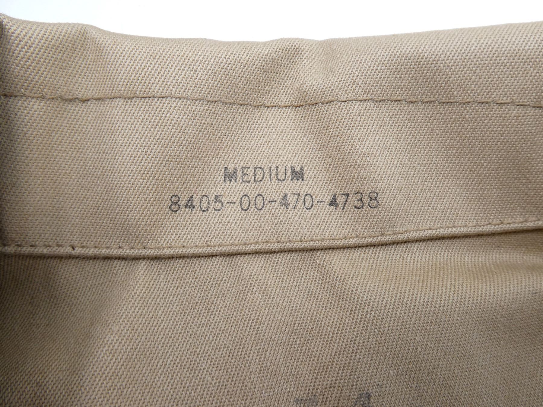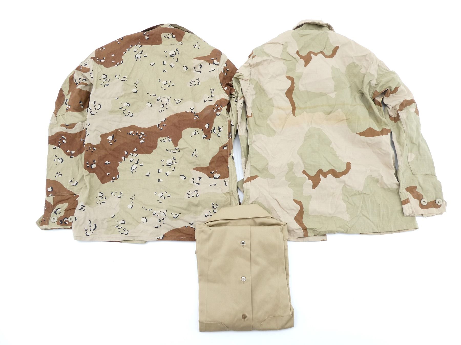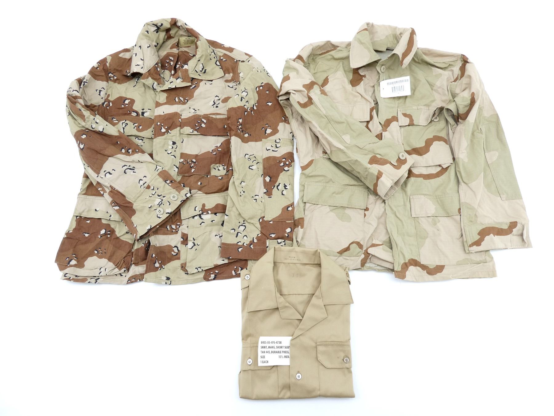 LOT INCLUDES; (2) DESERT CAMO PATTERN COMBAT SHIRTS, LONG-SLEEVED, SIZE XS-SHORT, VARIOUS LABELS & MARKINGS, BUTTON-FRONTS, SHOWS SLIGHT WEAR & (1) TAN SHORT-SLEEVED SHIRT, SIZE MEDIUM, VARIOUS LABELS & MARKINGS, BUTTON-FRONT. SEE PHOTOS.