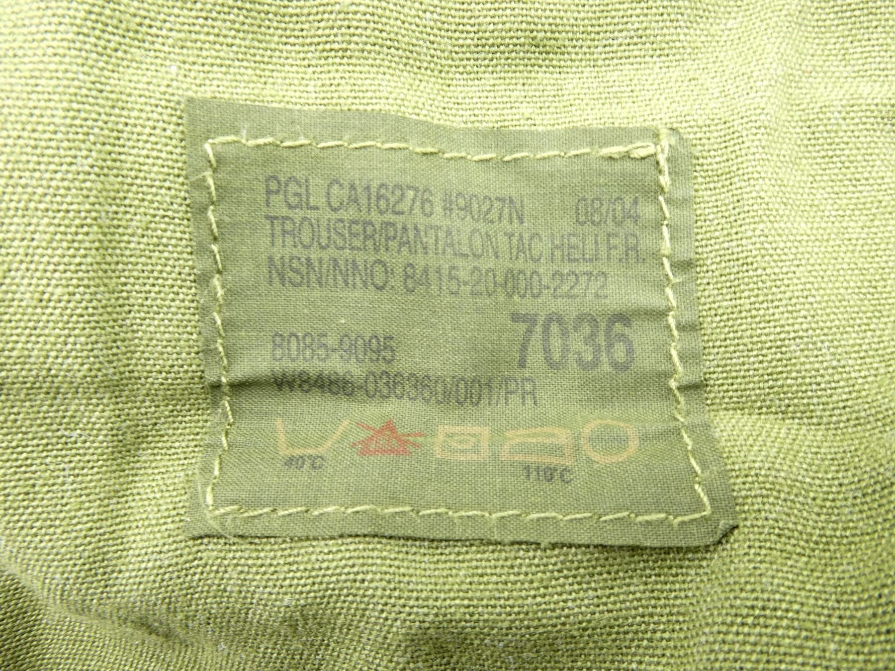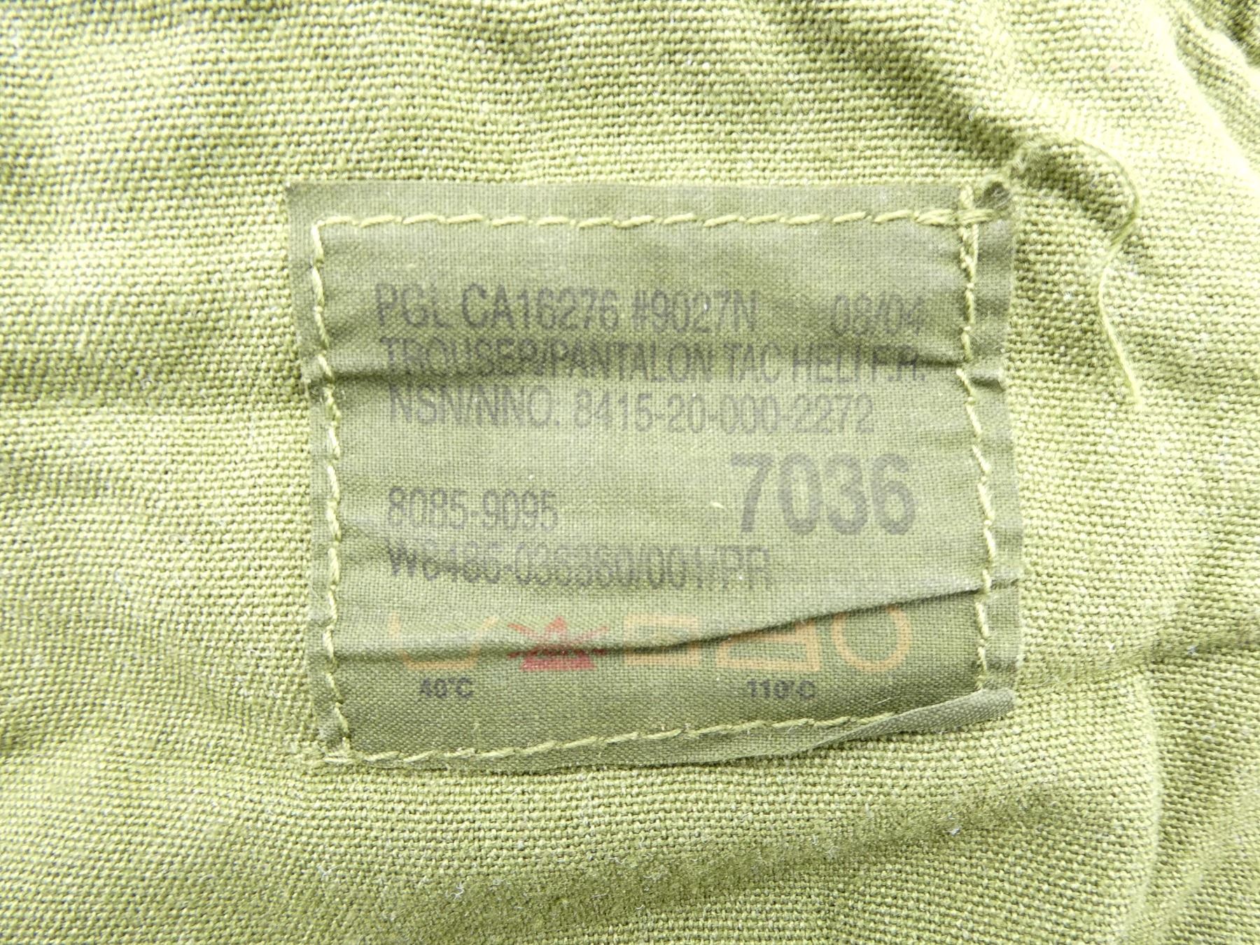LOT INCLUDES; (2) PAIRS GREEN TACTICAL HELICOPTER PANTS, MARKED: "TROUSER/PANTALON TAC HELI F.R., NSN: 8415-20-000-2272" ETC., SIZE 7036 (LARGE-REGULAR), SOME CORROSION ON ZIPPERS OF ONE PAIR MOSTLY IN WORKING ORDER, ZIPPERED-FLY (WORKS), SHOWS AGE / WEAR. SEE PHOTOS.