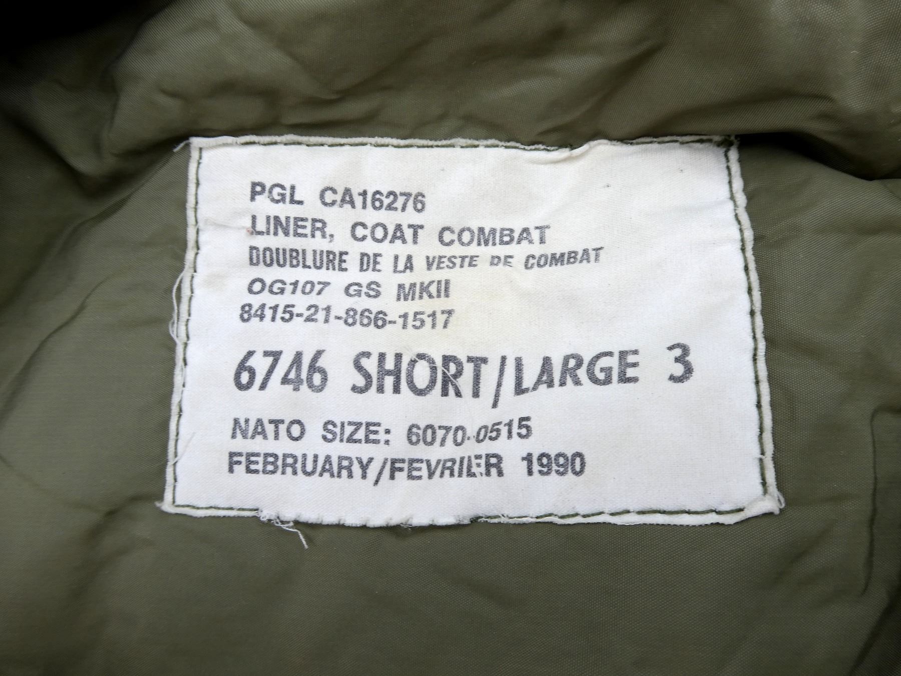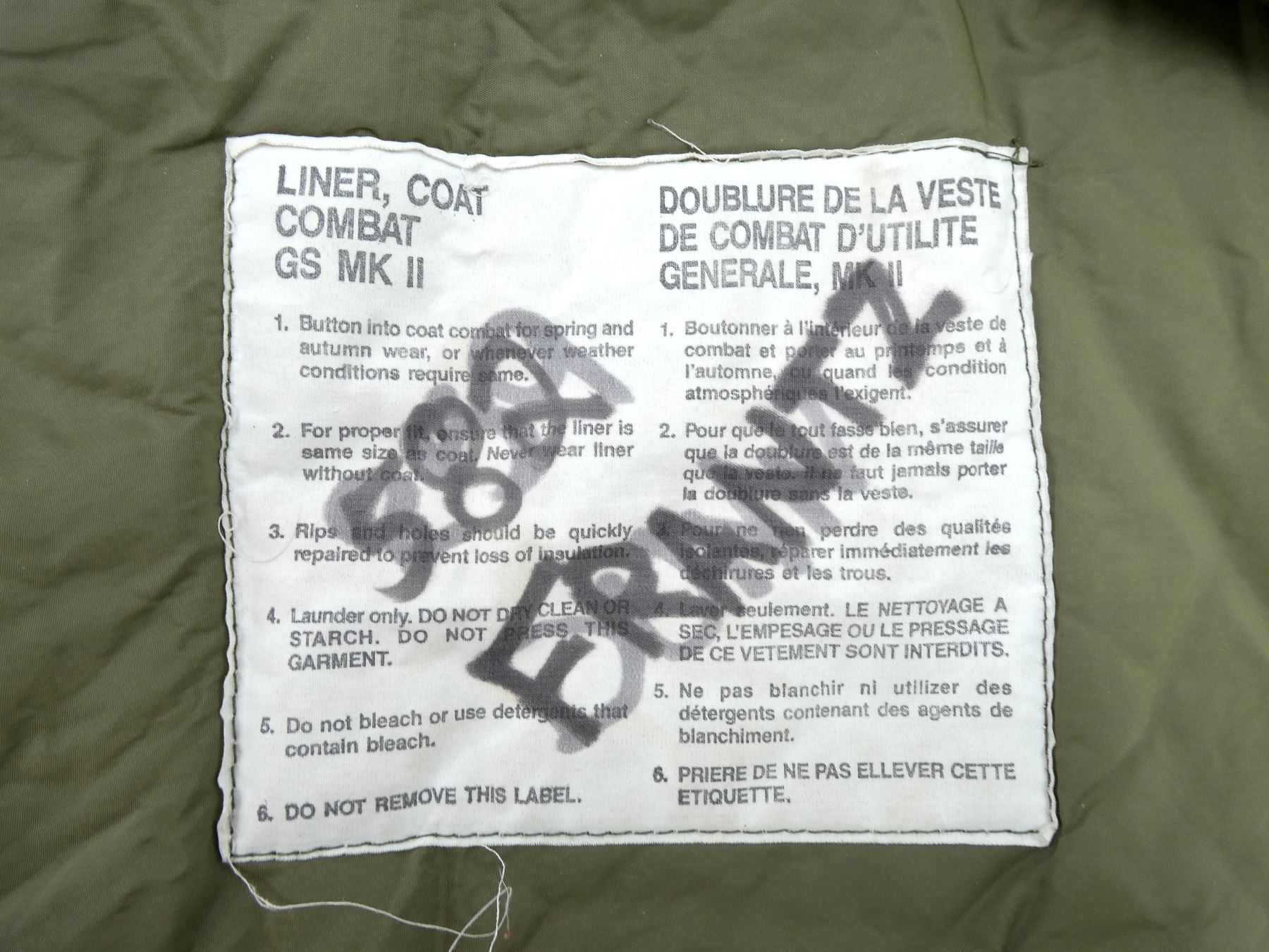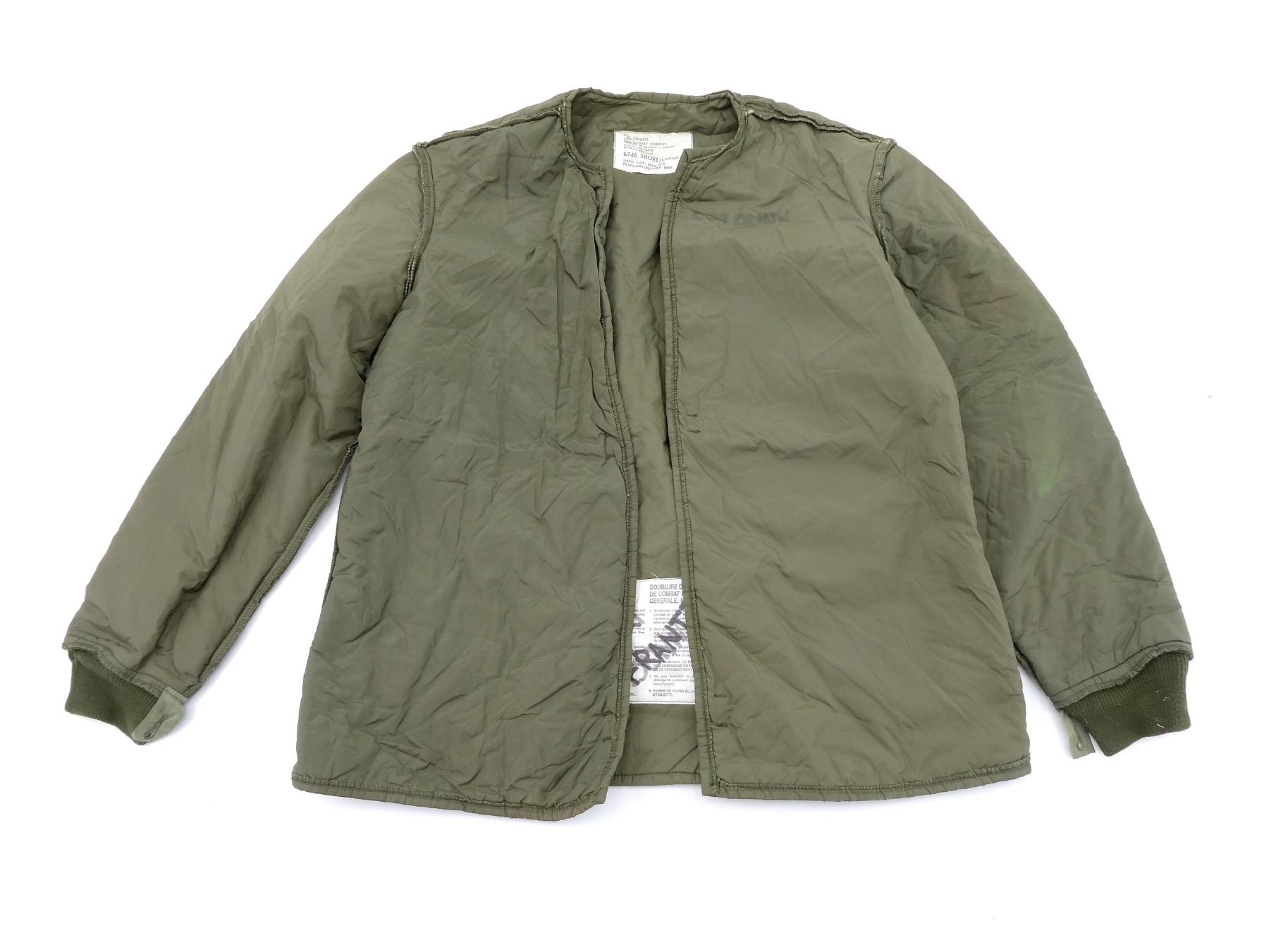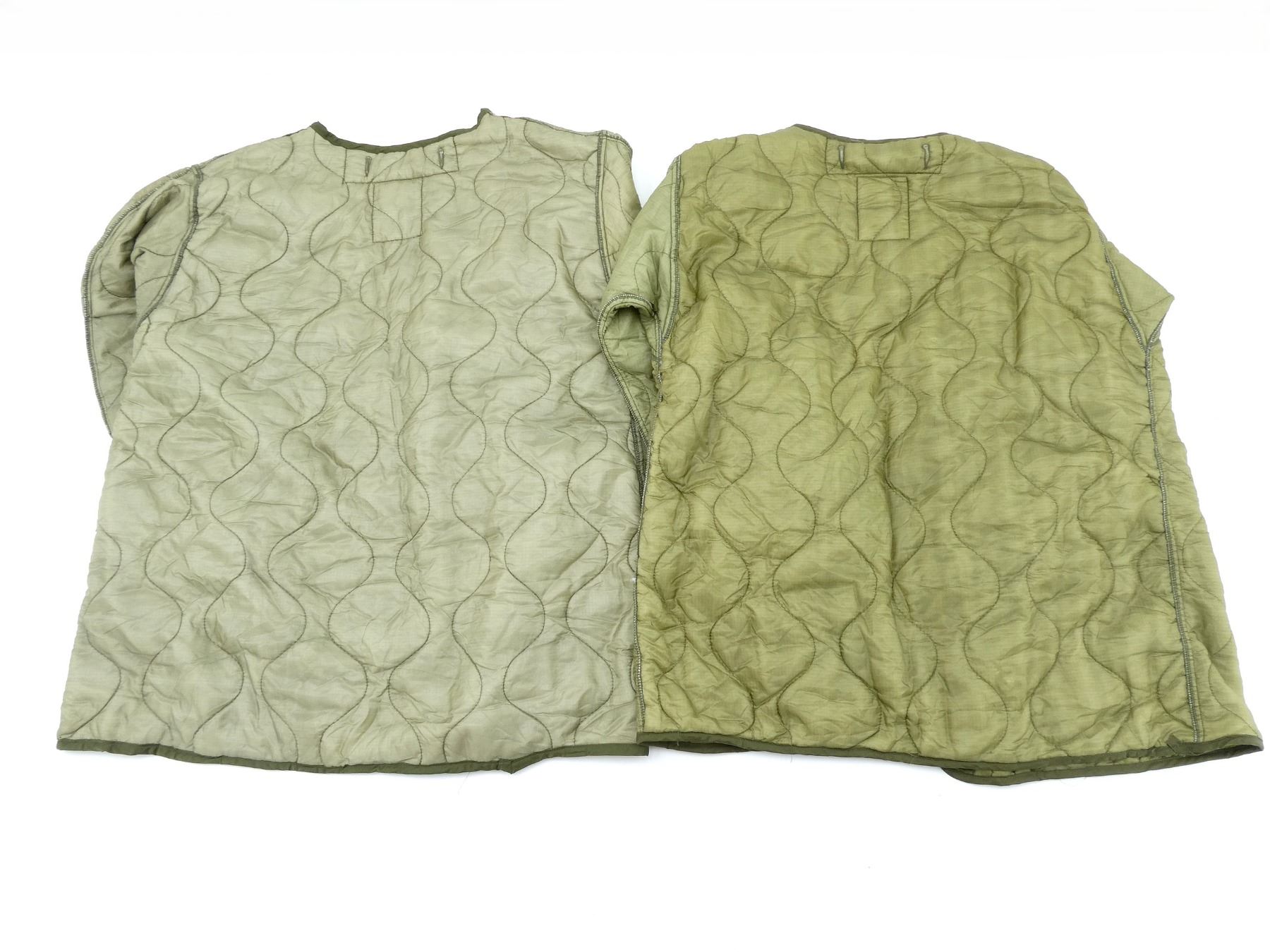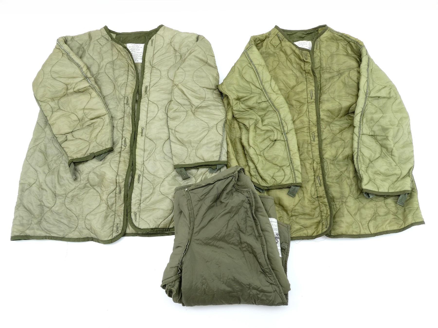 LOT INCLUDES; (2) U.S. MILITARY GREEN NYLON EXTREME COLD WEATHER PARKA LINERS, SIZE SMALL, 33" TO 37" CHEST, VARIOUS LABELS / MARKINGS, SHOWS SLIGHT WEAR & (1) CANADIAN MILITARY GREEN NYLON GS MK II COMBAT COAT LINER, SIZE 6746 (SHORT/LG 3), VARIOUS LABELS / MARKINGS, BUTTONS TO ATTACH, SHOWS WEAR. SEE PHOTOS.