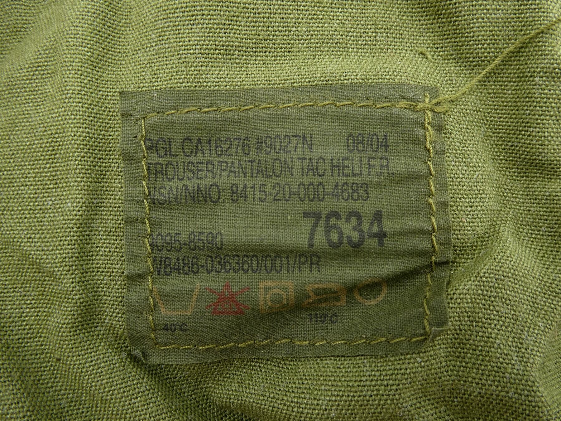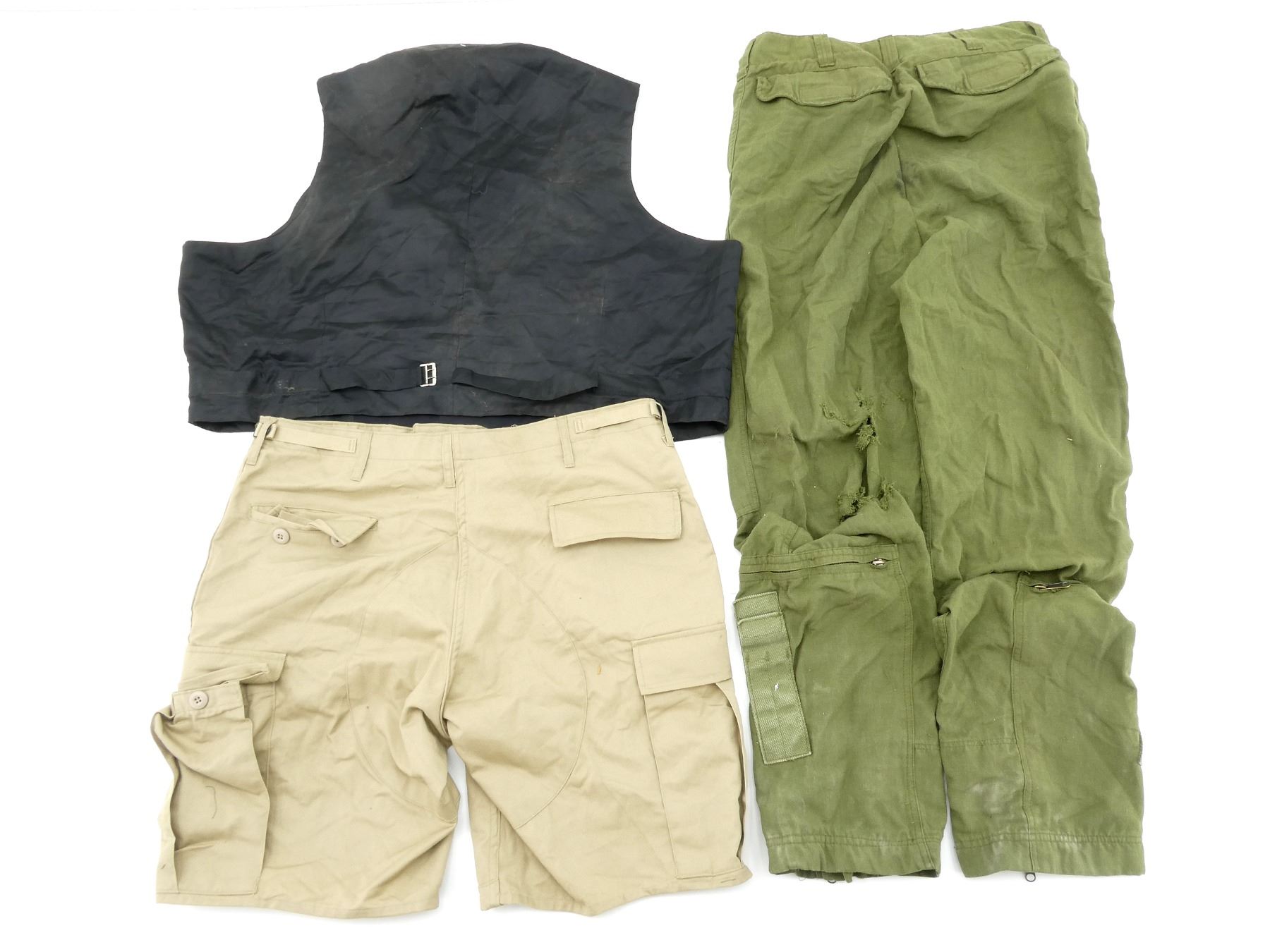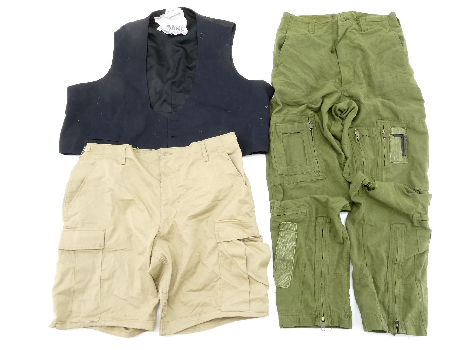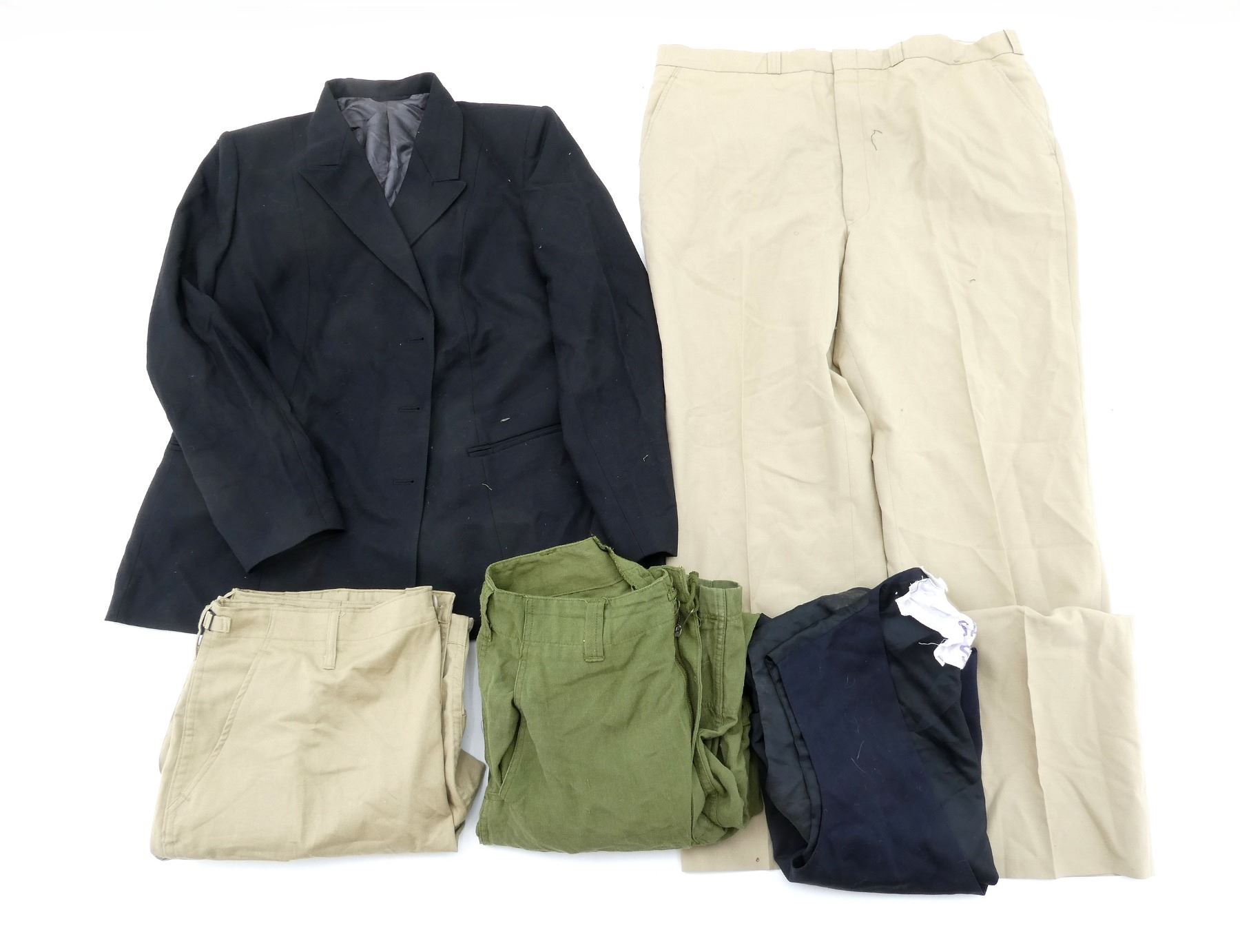 LOT INCLUDES; (1) CANADIAN MILITARY BLACK TUNIC, SIZE 7045 (70" HEIGHT, 45" CHEST), VARIOUS LABELS / MARKINGS, BUTTON-FRONT (MISSING BUTTONS), SHOWS AGE / WEAR, (1) MILITARY STYLE NAVY BLUE VEST, MARKED: "46-42, SAMPLE", VARIOUS OTHER MARKINGS, BUTTON-FRONT (MISSING BUTTONS), SHOWS AGE / WEAR, SHOULDER WIDTH APPROX. 16.5", (1) MILITARY STYLE TAN COMBAT SHORTS, SIZE L-R (WAIST 35"-39"), MARKED: "GENUINE GEAR", VARIOUS OTHER LABELS / MARKINGS, ZIPPERED-FLY (WORKS), SHOWS SLIGHT WEAR, (1) CANADIAN MILITARY TAN LIGHTWEIGHT LAND PANTS, SIZE 7643 (6'4" HEIGHT, 43" WAIST), VARIOUS LABELS / MARKINGS, ZIPPERED-FRONT (WORKS), SHOWS SLIGHT WEAR & (1) RCAF GREEN FLIGHT / TACTICAL HELICOPTER PANTS, MARKED: "TROUSER/PANTALON TAC HELI F.R., NSN: 8415-20-000-4683" ETC., SIZE 7634 (6'4" HEIGHT, 34" WAIST), VARIOUS LABELS / MARKINGS, ZIPPERED-FLY (WORKS), ALL OTHER ZIPPERS APPEAR TO WORK, ONE WITH BROKEN PULL TAB, SHOWS AGE / WEAR / TEAR. SEE PHOTOS.