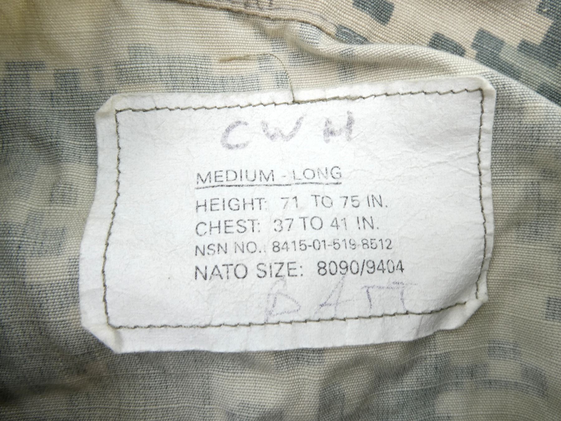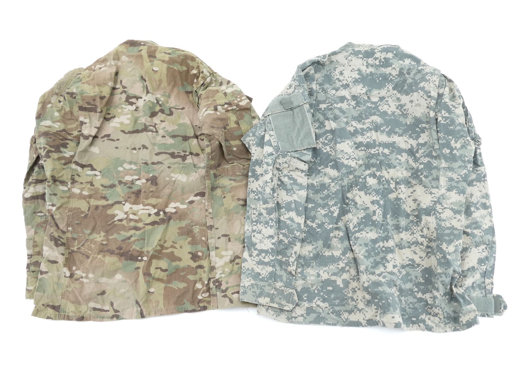 LOT INCLUDES; (2) DIGITAL CAMO COMBAT SHIRTS, LONG-SLEEVED, SIZE MED-LONG, VARIOUS LABELS / MARKINGS, VELCRO / ZIPPERED-FRONTS (WORKS), SHOWS AGE / WEAR & (3) TAN CAMO COMBAT SHIRTS, LONG-SLEEVED, SIZE MED-LONG, VARIOUS LABELS / MARKINGS, U.S. ARMY TAGS, VELCRO / ZIPPERED-FRONTS (WORKS), SHOWS AGE / WEAR. SEE PHOTOS.