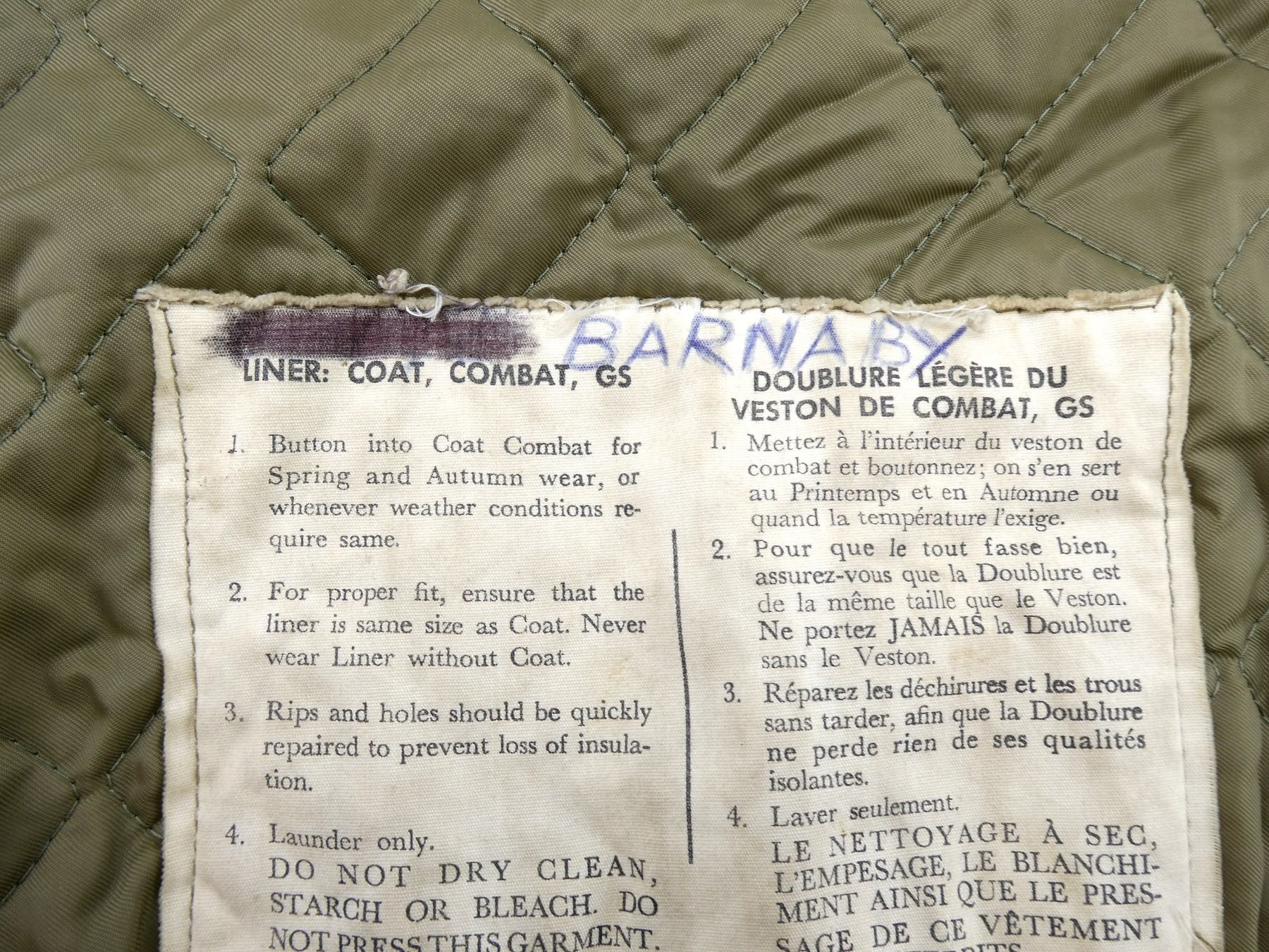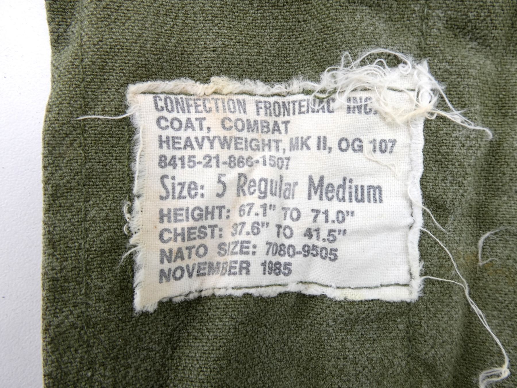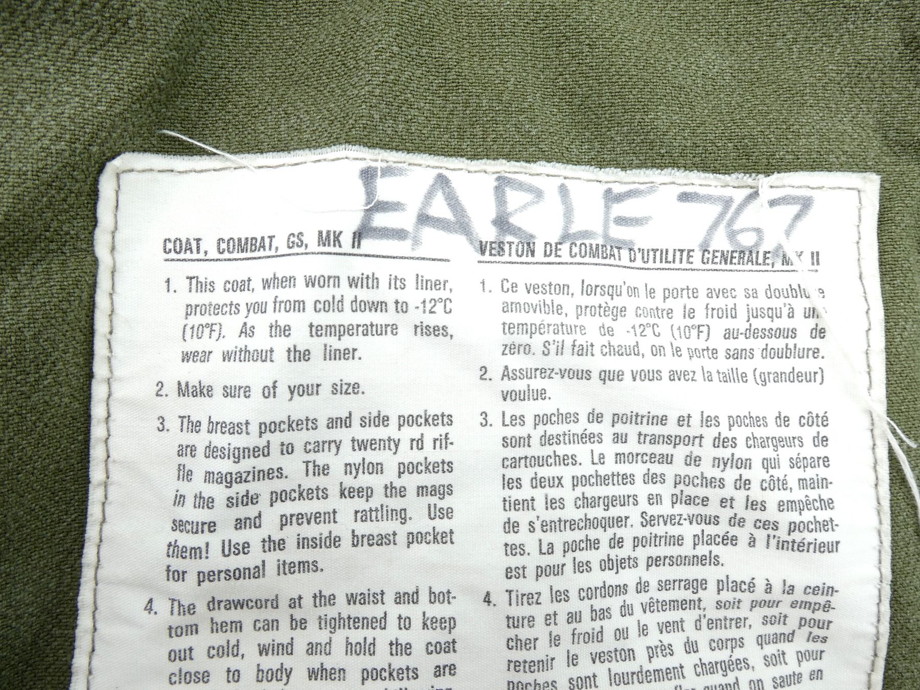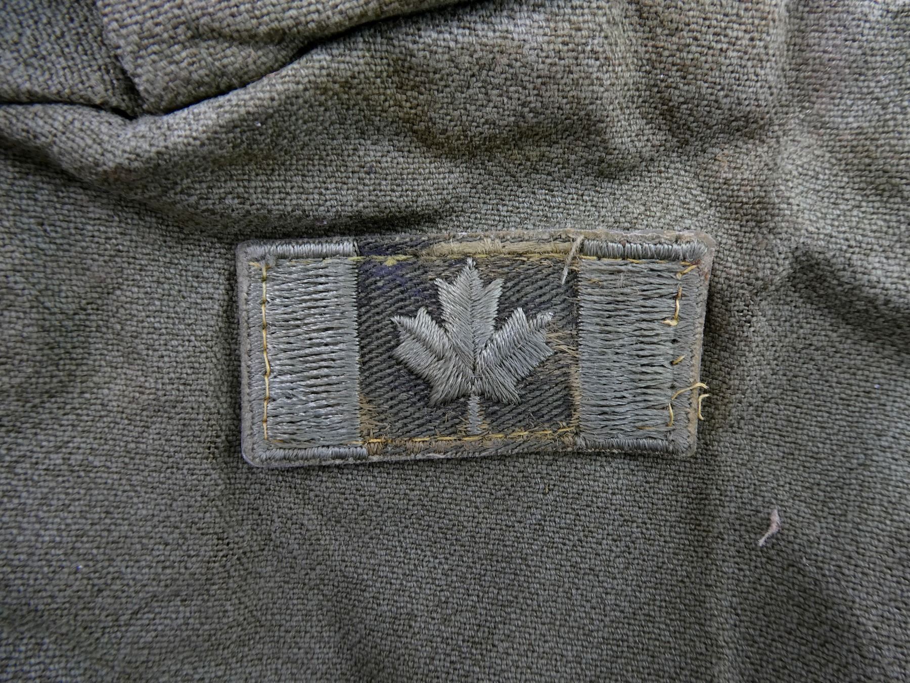 LOT INCLUDES; (3) GREEN CANVAS GS MKII COMBAT COATS, SIZE 5 REG-MED / SIZE 8 TALL-MED, VARIOUS LABELS / MARKINGS, SOME WITH CANADIAN FLAG SHOULDER BADGES / RANK CHEVRONS / NAME TAGS, BUTTON / ZIPPERED-FRONTS (WORKS), SHOWS AGE / WEAR / TEAR & (1) GREEN GS COMBAT COAT LINER, SIZE 6 REG-LRG, VARIOUS LABELS / MARKINGS, BUTTONS TO ATTACHED, SHOWS AGE / WEAR / TEAR. SEE PHOTOS.