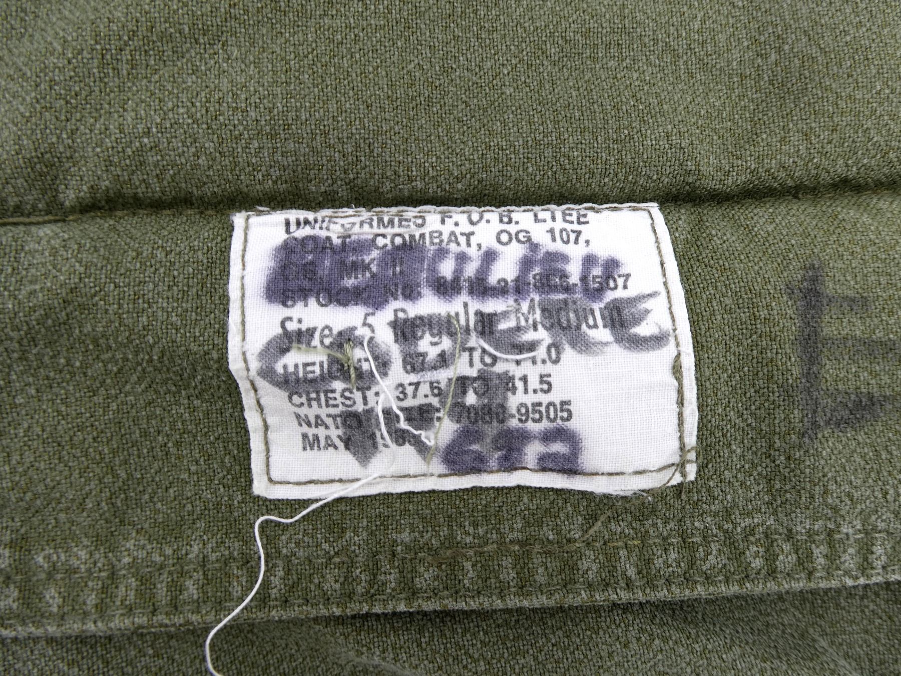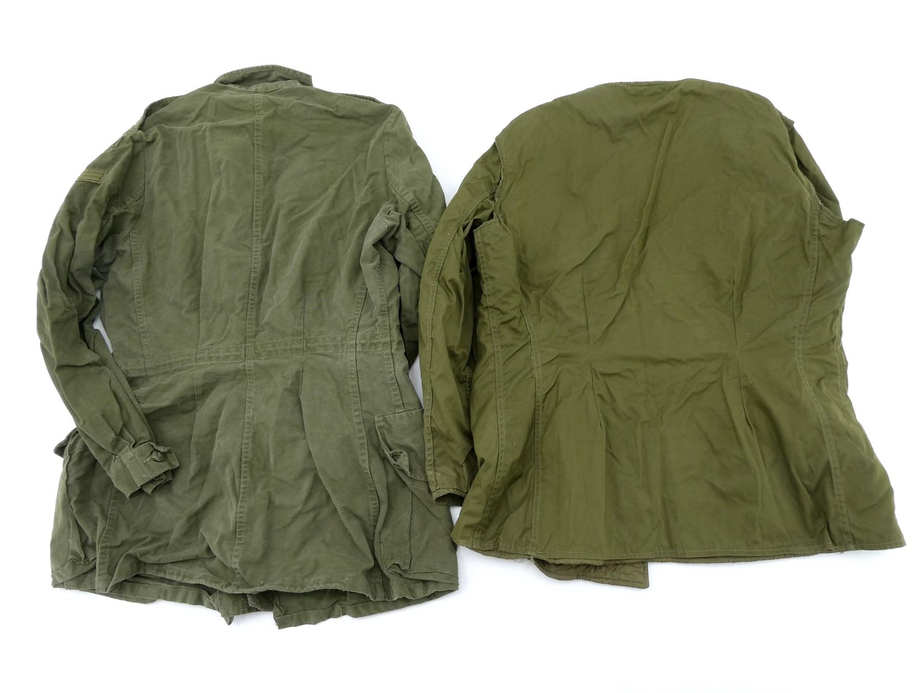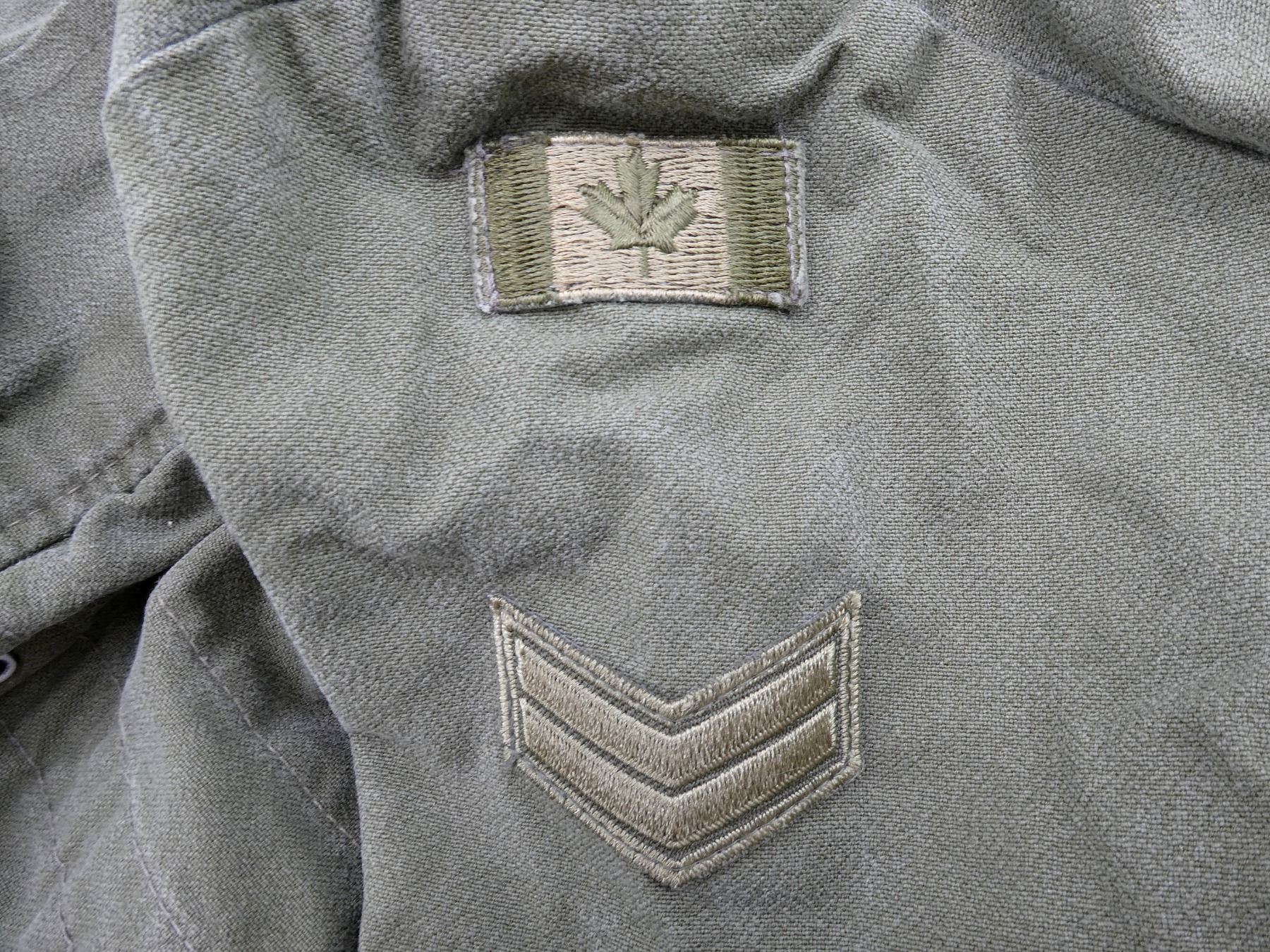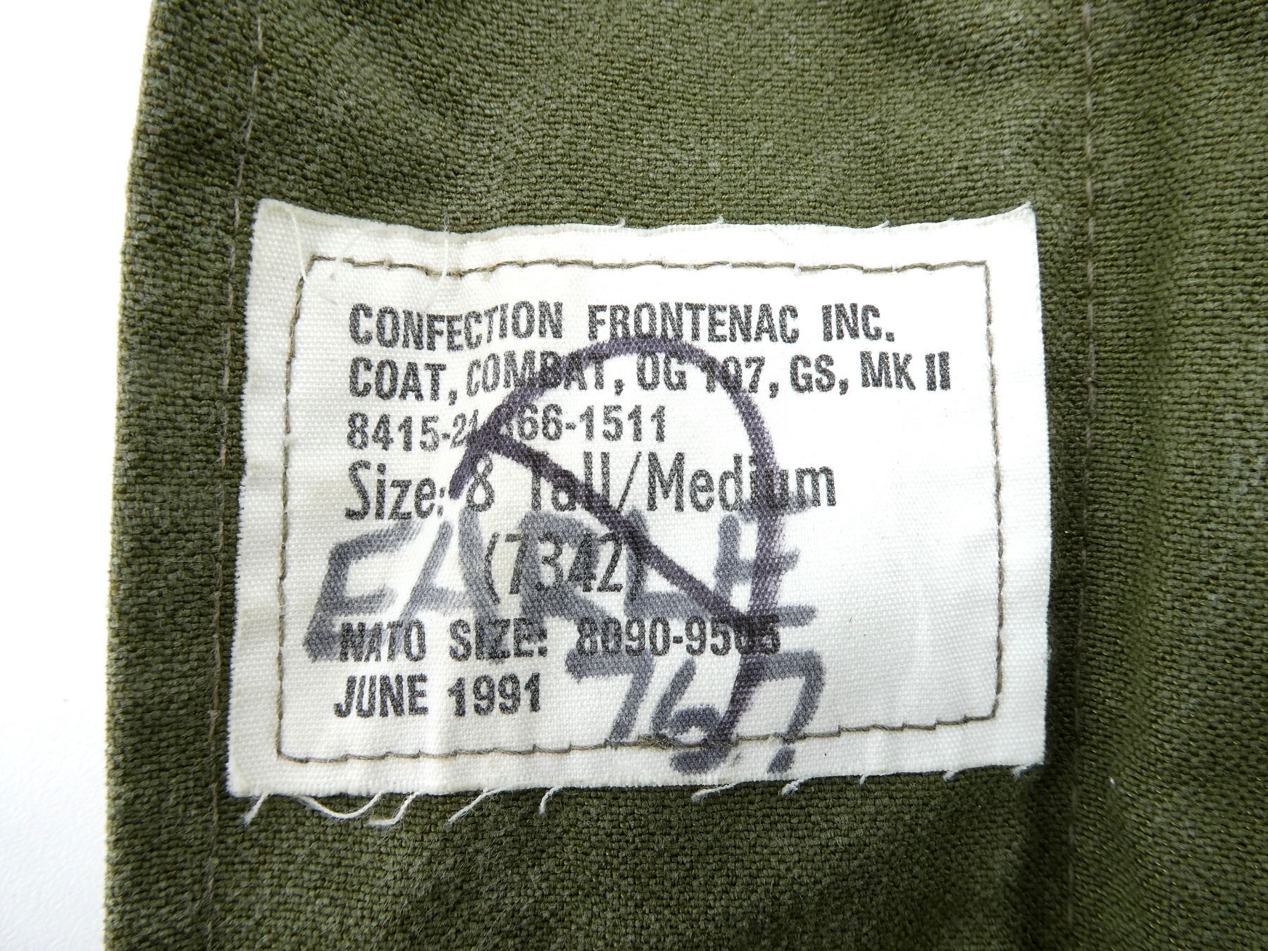 LOT INCLUDES; (3) GREEN CANVAS GS MKII COMBAT COATS, SIZE 5 REG-MED / SIZE 8 TALL-MED, VARIOUS LABELS / MARKINGS, SOME WITH CANADIAN FLAG SHOULDER BADGES / RANK CHEVRONS / NAME TAGS, BUTTON / ZIPPERED-FRONTS (WORKS), SHOWS AGE / WEAR / TEAR & (1) GREEN GS COMBAT COAT LINER, SIZE 6 REG-LRG, VARIOUS LABELS / MARKINGS, BUTTONS TO ATTACHED, SHOWS AGE / WEAR / TEAR. SEE PHOTOS.