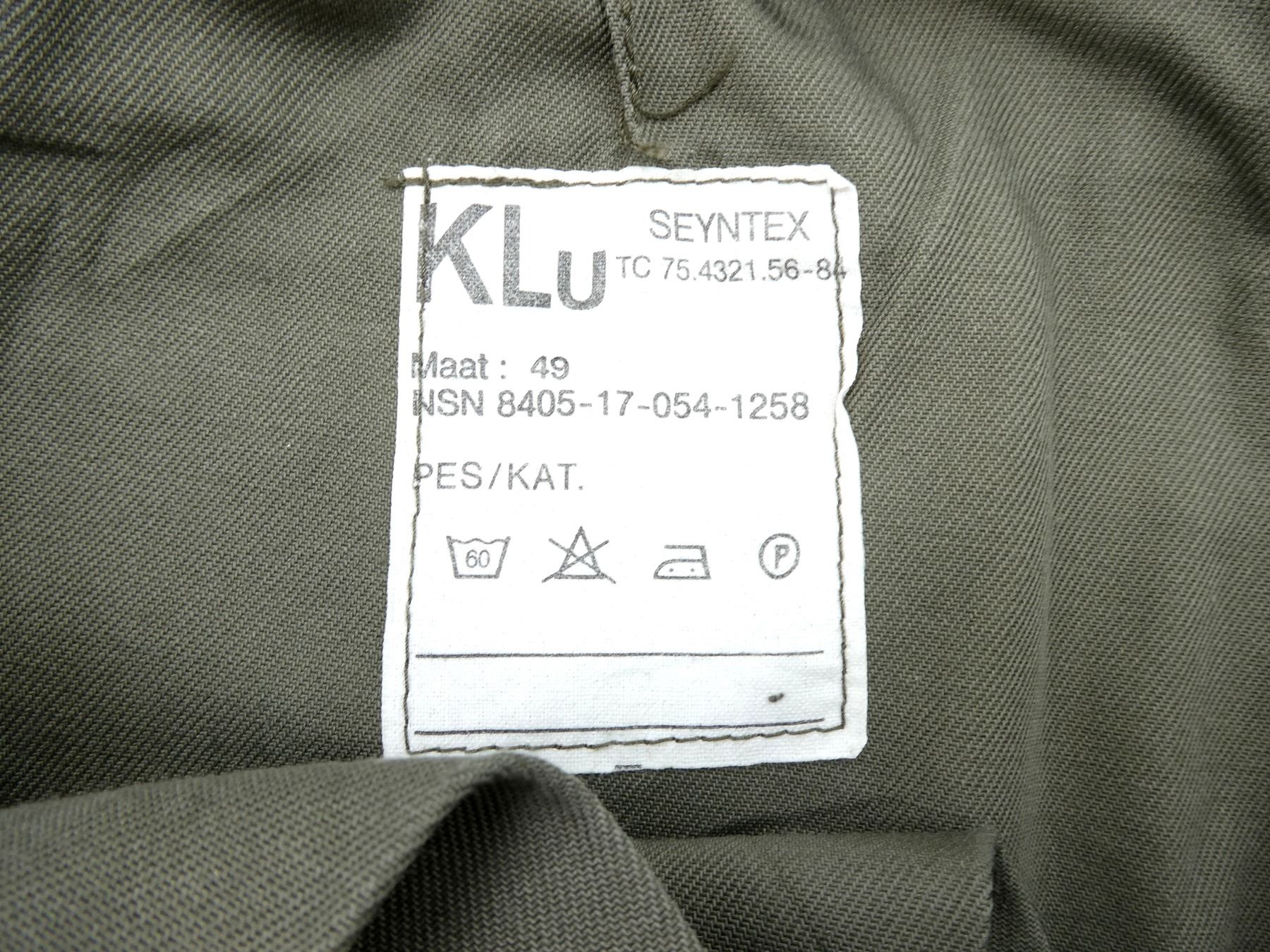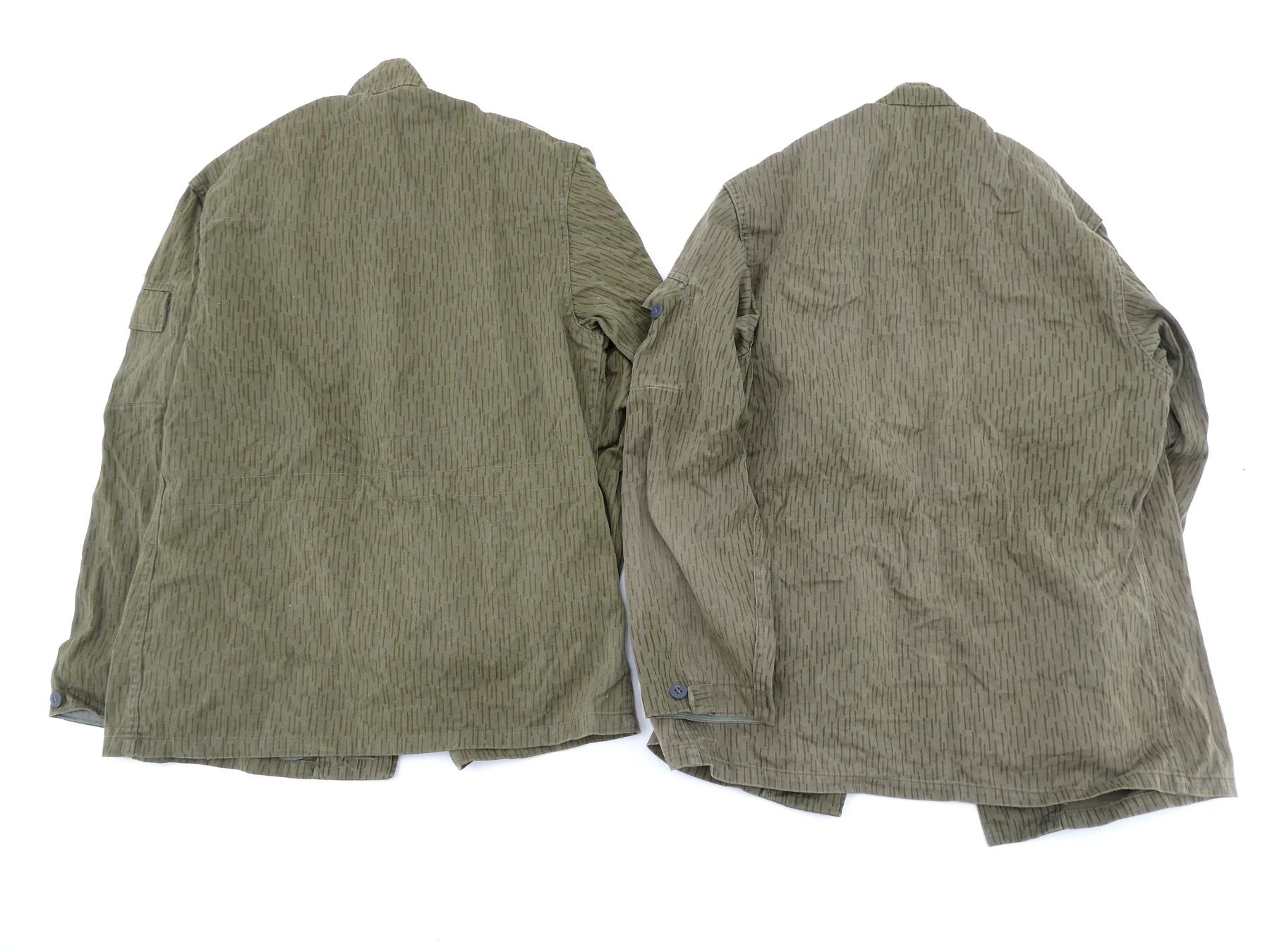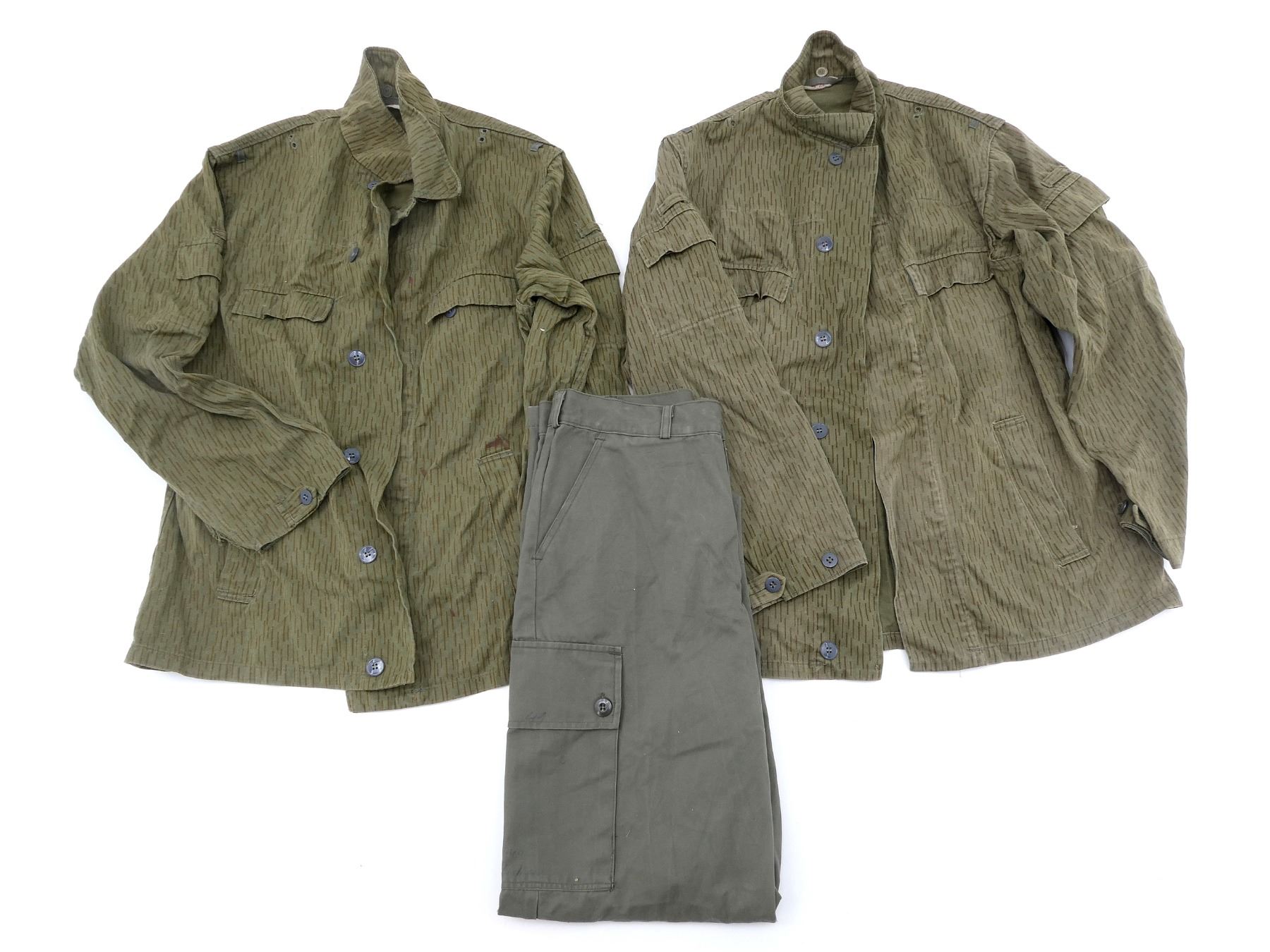 LOT INCLUDES; (2) EAST GERMAN MILITARY RAINDROP CAMO FIELD JACKETS, MARKED: "G48", NO OTHER VISIBLE MARKINGS, BUTTON-FRONTS, SHOWS AGE / WEAR, SHOULDER WIDTHS APPROX. 18" & (1) PAIR OF NETHERLANDS MILITARY GREY PANTS, MARKED: "KLU, SEYNTEX, MAAT: 49, NSN 8405-17-054-1258" ETC., BUTTON-FLY, SHOWS AGE / WEAR, WAIST APPROX. 30". SEE PHOTOS.