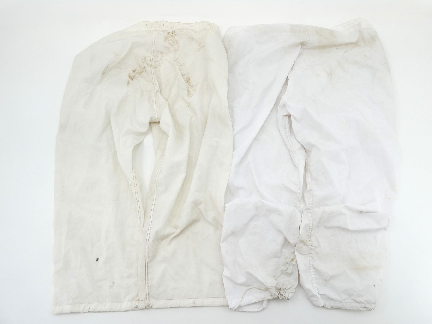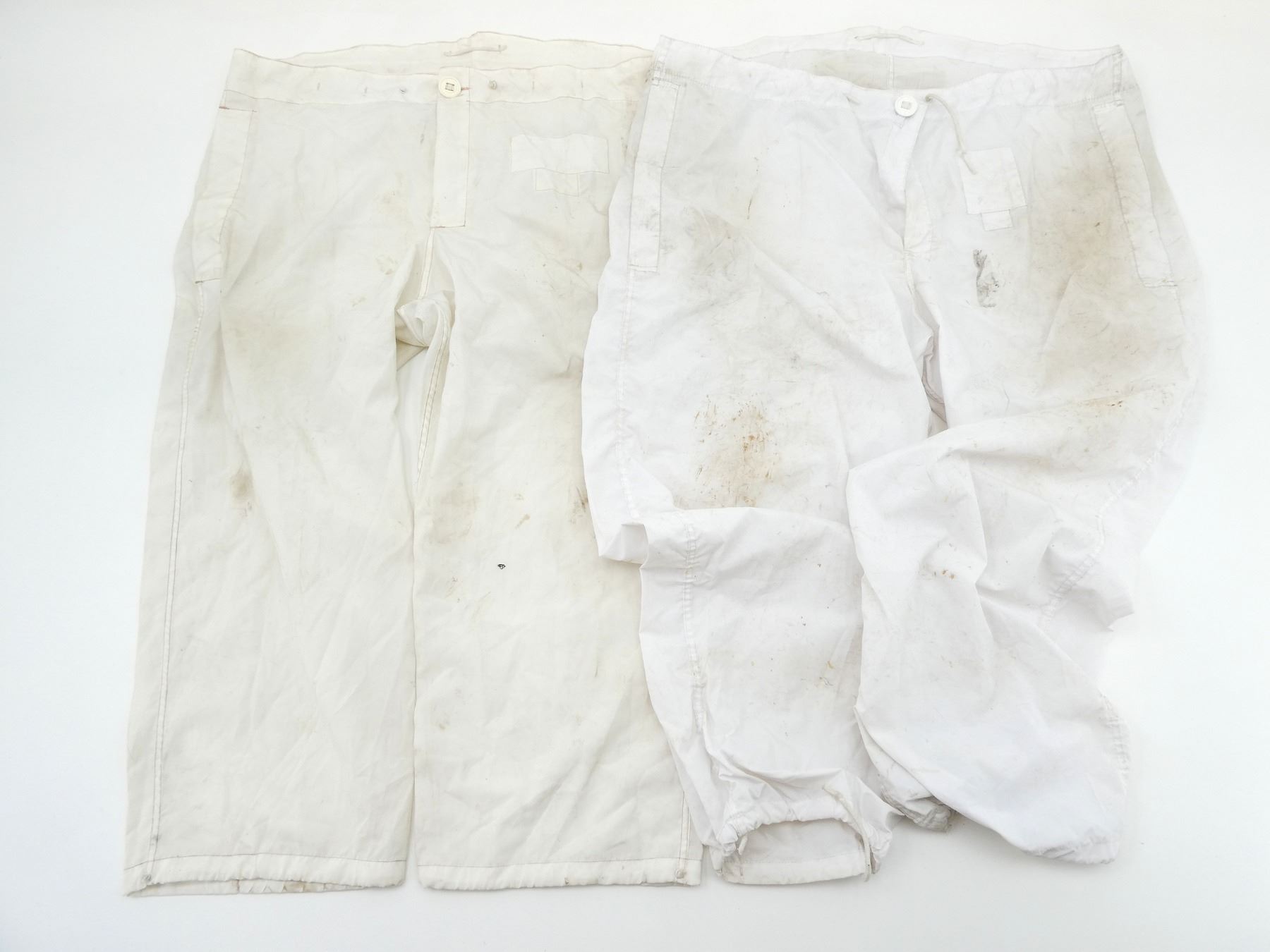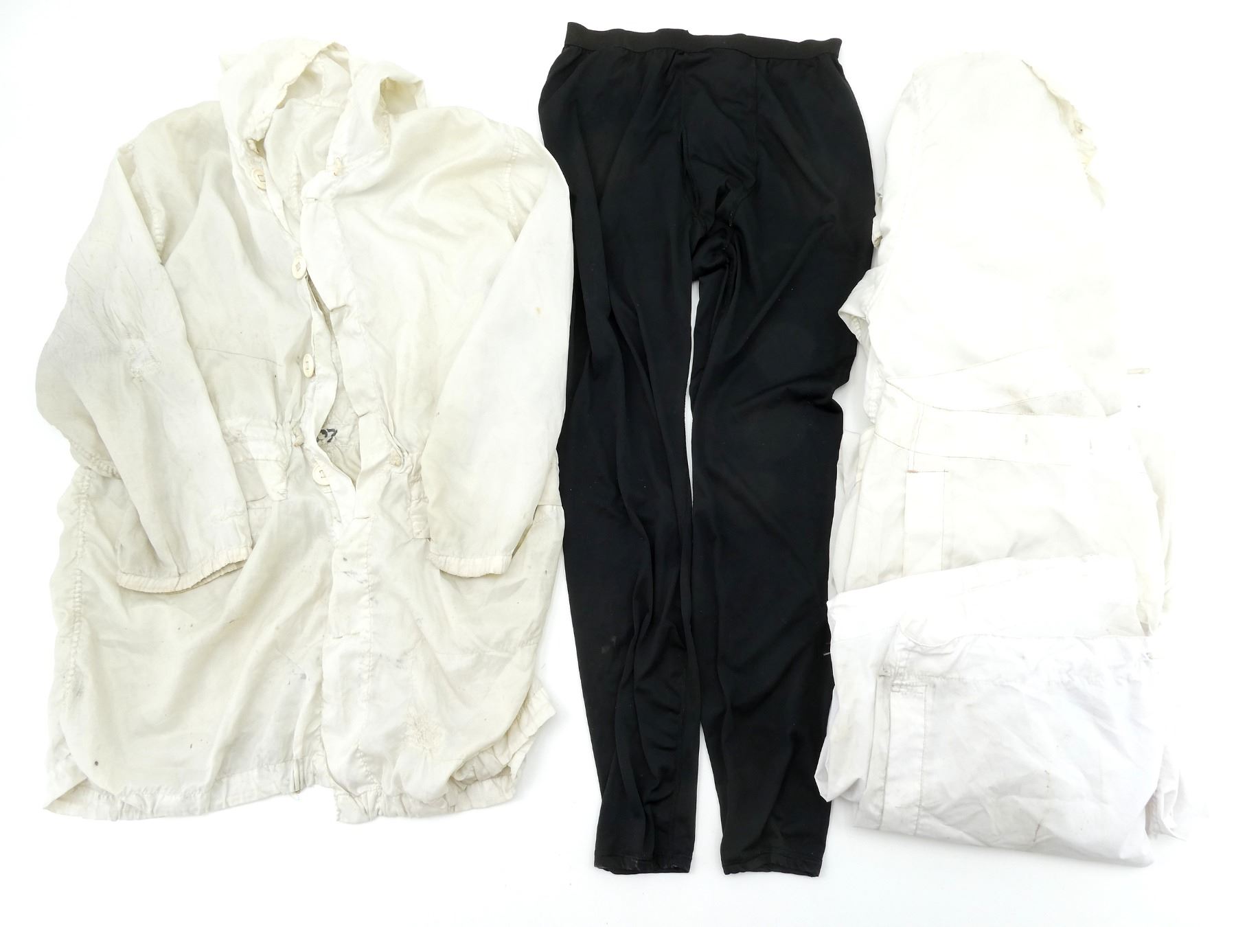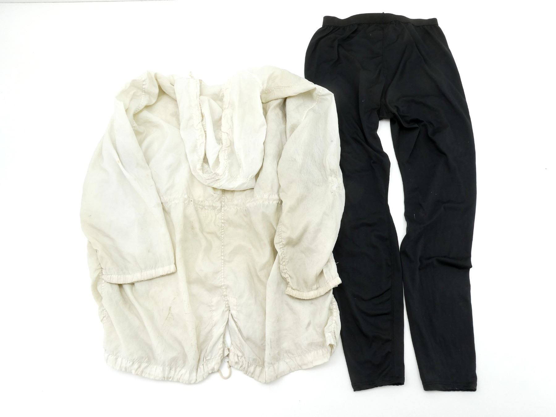 LOT INCLUDES; (2) WHITE CAMO PARKAS, SIZE LONG 36-44 (HEIGHT 5'11"-6'2) / UNKNOWN, VARIOUS MARKINGS / LABELS, BUTTON-FRONT, HOODED, VARIOUS DRAWSTRINGS, SHOWS AGE / WEAR / TEAR, (2) PAIRS OF WHITE CAMO PANTS, SIZE SHORT (HEIGHT 63"-66", WAIST 30"-38") / X-LARGE, VARIOUS MARKINGS / LABELS, BUTTON-FLY, VARIOUS DRAWSTRINGS, WAIST ADJUSTABLE, SHOWS AGE / WEAR & (1) U.S. MILITARY BLACK THERMAL LEGGINGS, SIZE LRG-LONG, VARIOUS MARKINGS / LABELS, SHOWS SLIGHT WEAR. SEE PHOTOS.