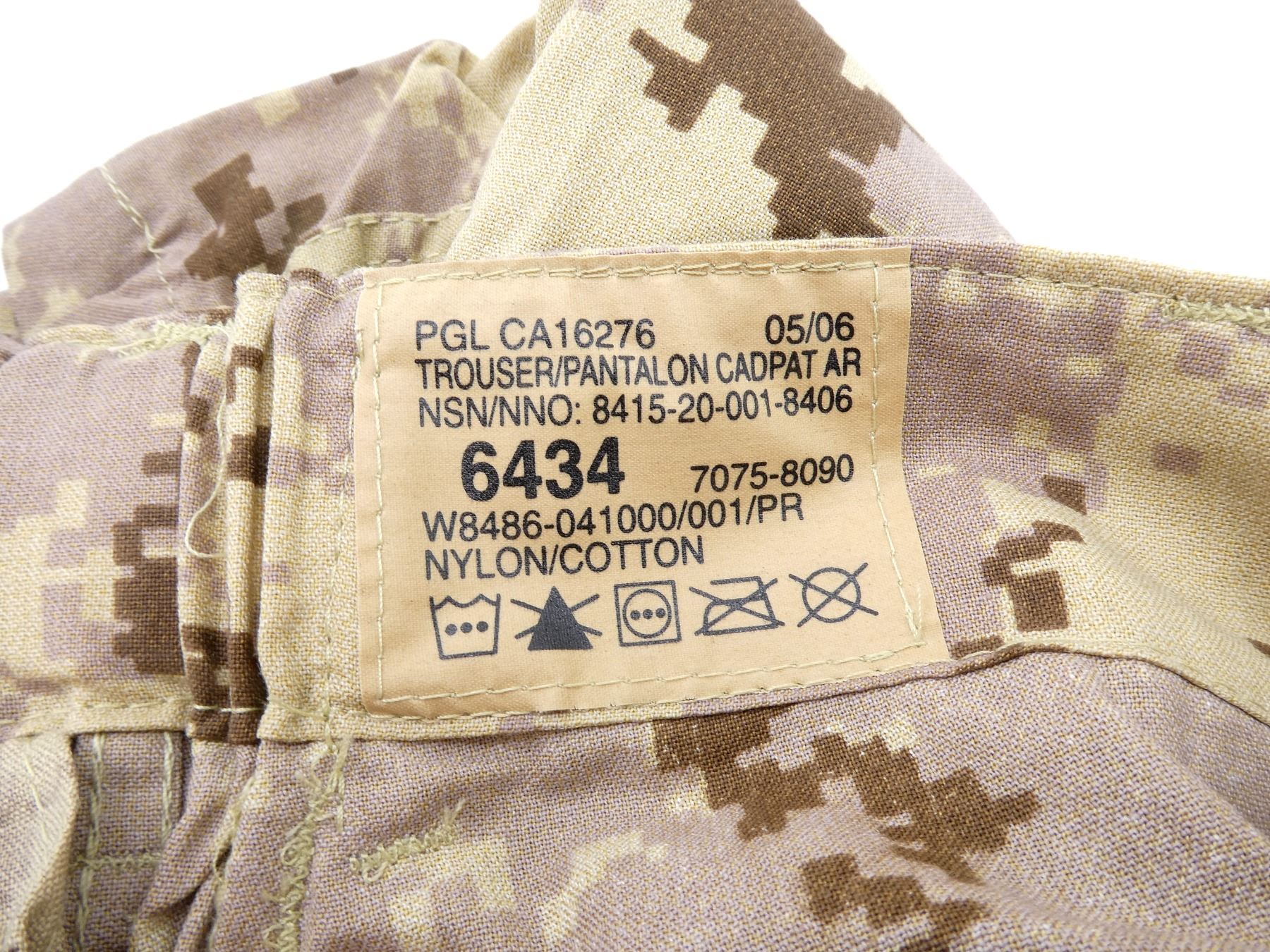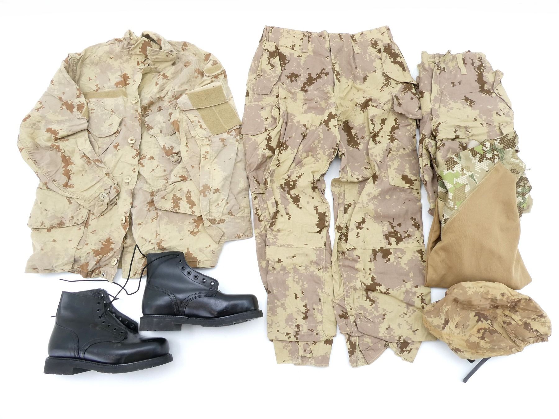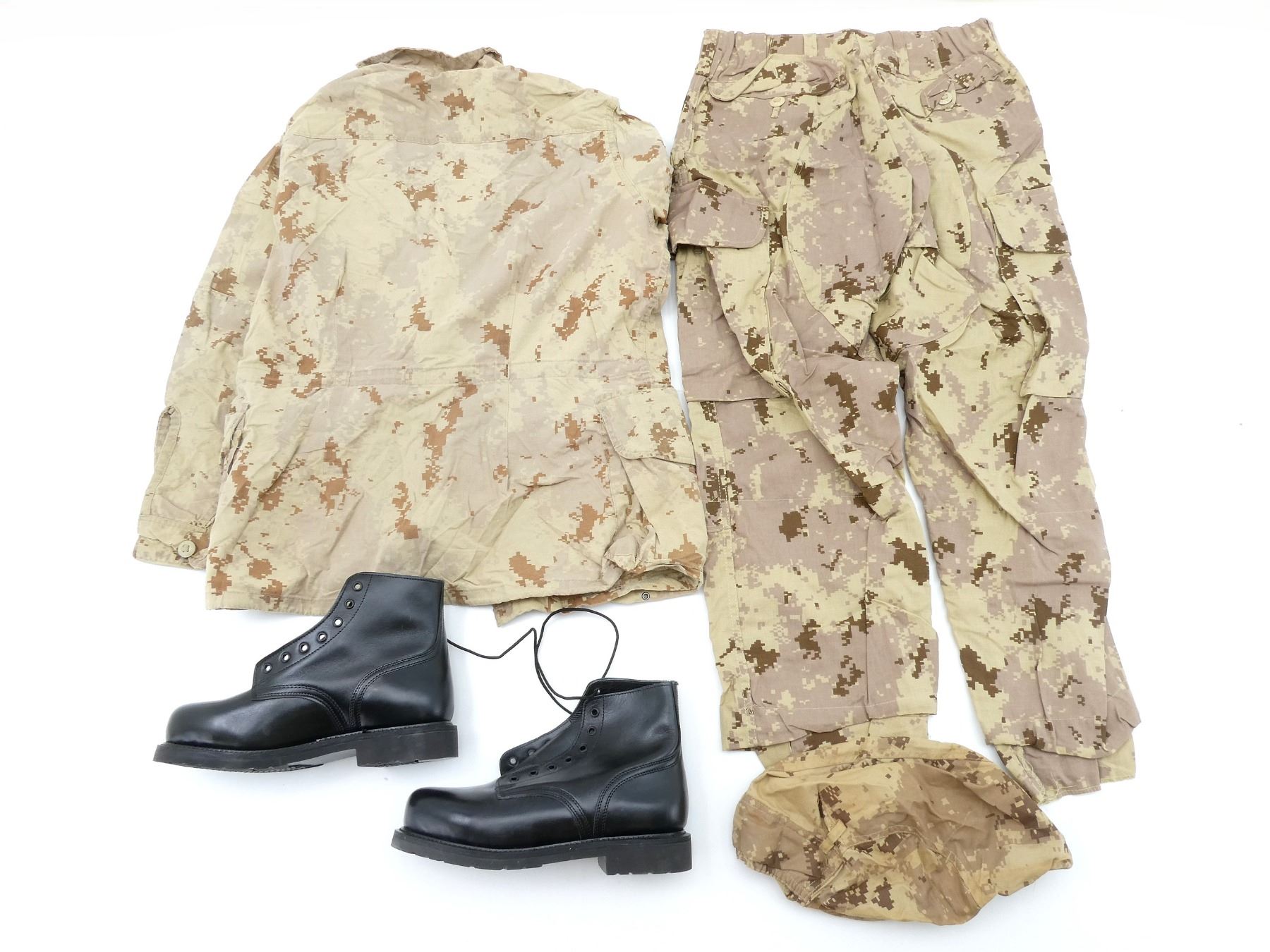 LOT INCLUDES; (2) CANADIAN MILITARY TAN CADPAT AR PANTS, SIZE 6434 (64" HEIGHT, 34" WAIST), CONSIGNOR STATES: "NEVER ISSUED", VARIOUS LABELS / MARKINGS, ZIPPERED-FLY (WORKS), (1) CANADIAN MILITARY TAN CADPAT AR COAT, SIZE 6740 (67" HEIGHT, 40" CHEST), VARIOUS LABELS / MARKINGS, BUTTON-FRONT, SHOWS WEAR, (1) CANADIAN MILITARY BLACK LEATHER BOOTS, SIZE 250-106, MARKED: "912084, 8430-20-006-2523, 250-106, ITEM 1113, 1113" ETC., ONE SHOE LACE, WIDEST PART OF SOLE APPROX. 4", SOLE OVERALL LENGTH APPROX. 11.5", (1) CANADIAN MILITARY TAN CADPAT HELMET COVER, SIZE MEDIUM, VARIOUS LABELS / MARKINGS & (1) COLUMBIAN ARMY MULTI-CAMO SHIRT, SIZE XL, MARKED: "XL", NO OTHER VISIBLE MARKINGS, PARTIALLY ZIPPERED-FRONT (WORKS). SEE PHOTOS.