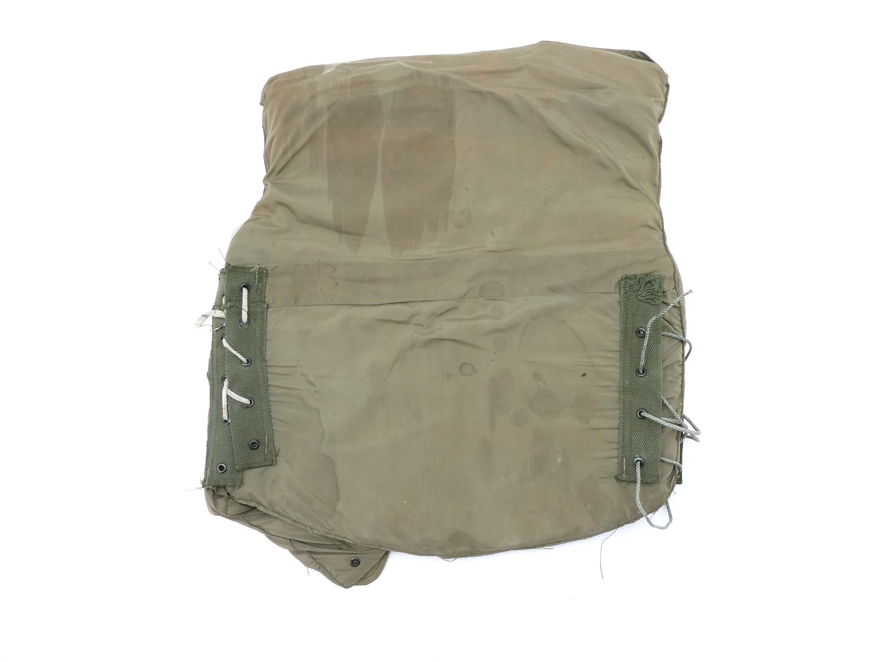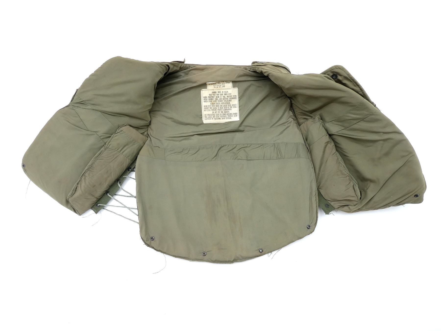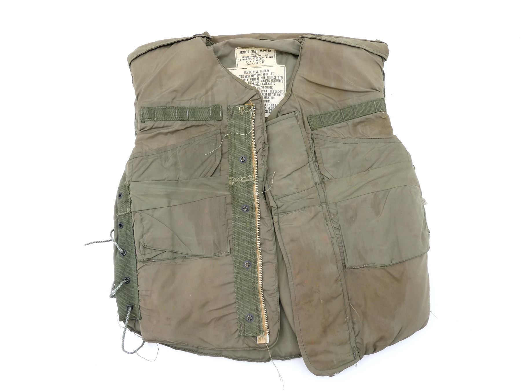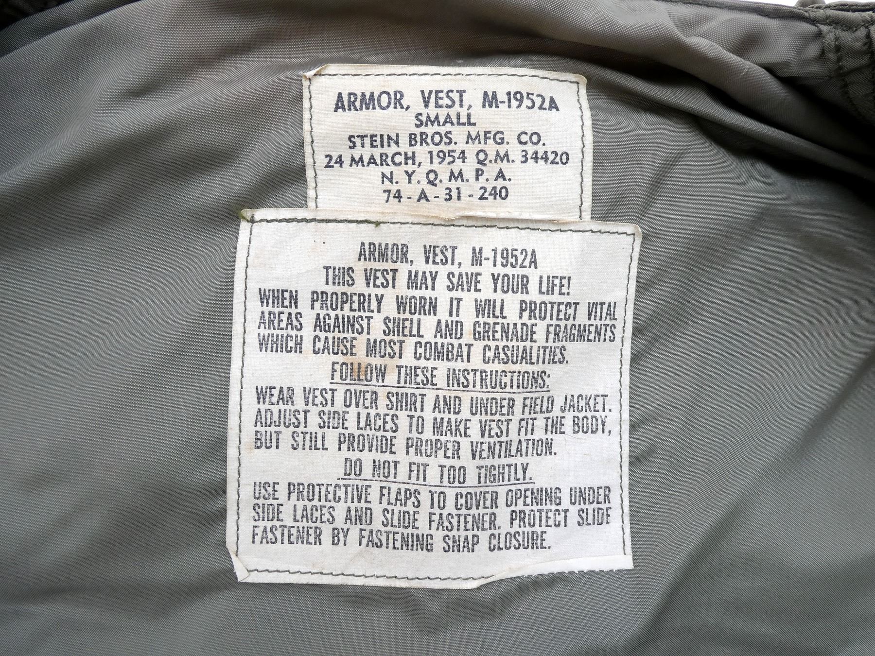 (1) M-1952A FLAK VEST, MARKED: "ARMOR, VEST, M-1952A, SMALL, STEIN BROS. MFG. CO., 24 MARCH, 1954 Q.M. 34420, N.Y.Q.M.P.A., 74-A-31-240", VARIOUS OTHER LABELS / MARKINGS, ZIPPERED-FRONT (WORKS), LACE-UP SIDES, SHOWS AGE / WEAR / TEAR. SEE PHOTOS.