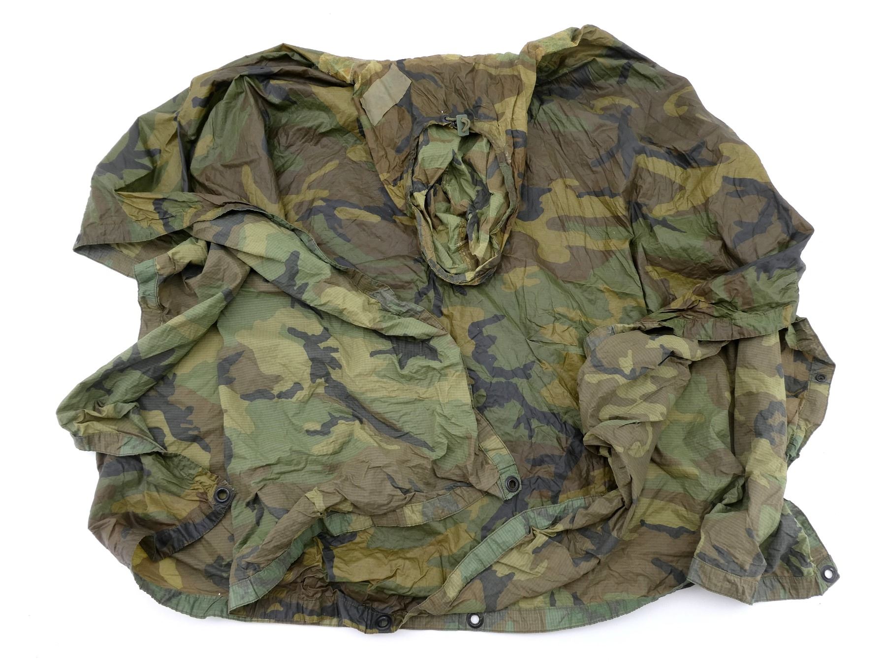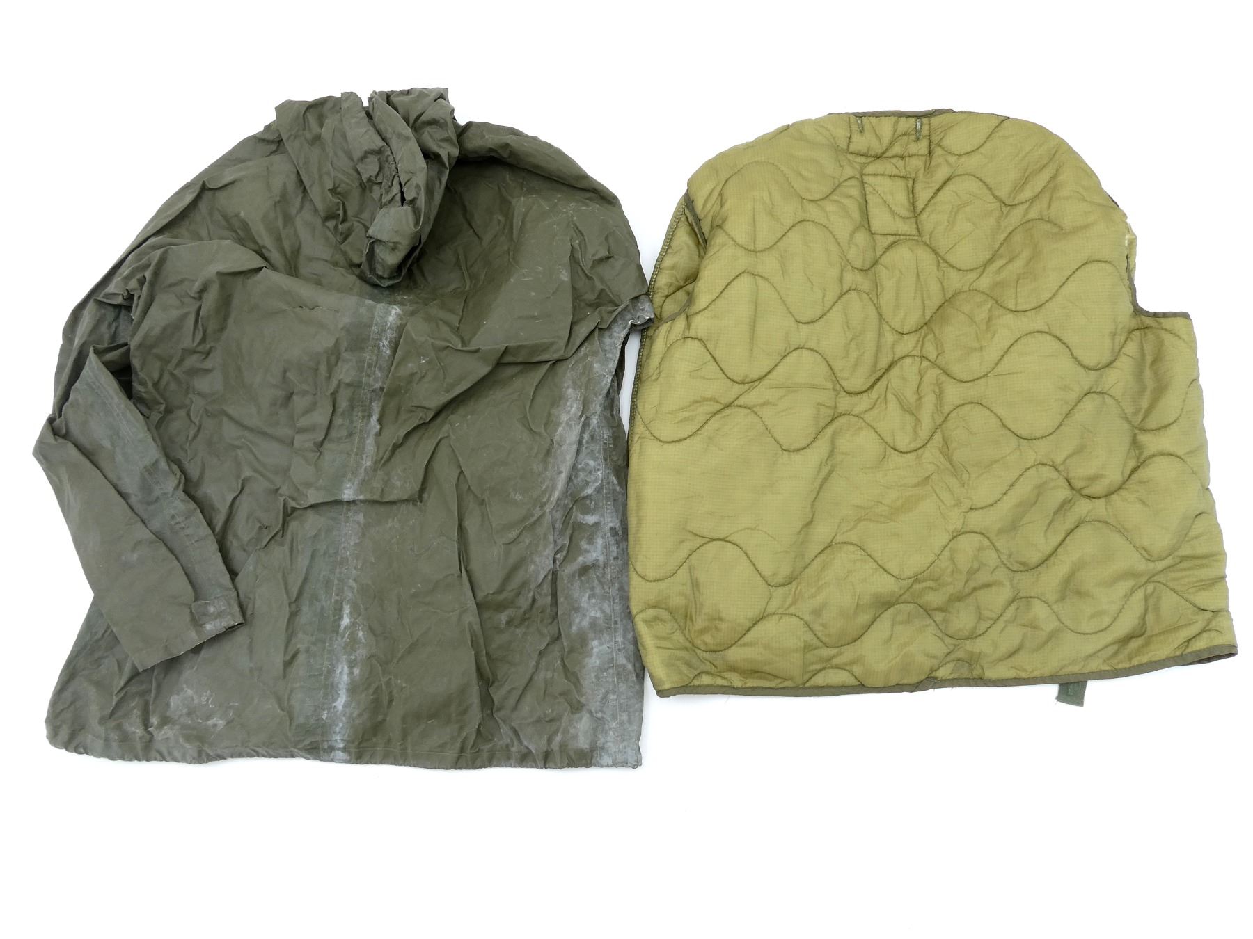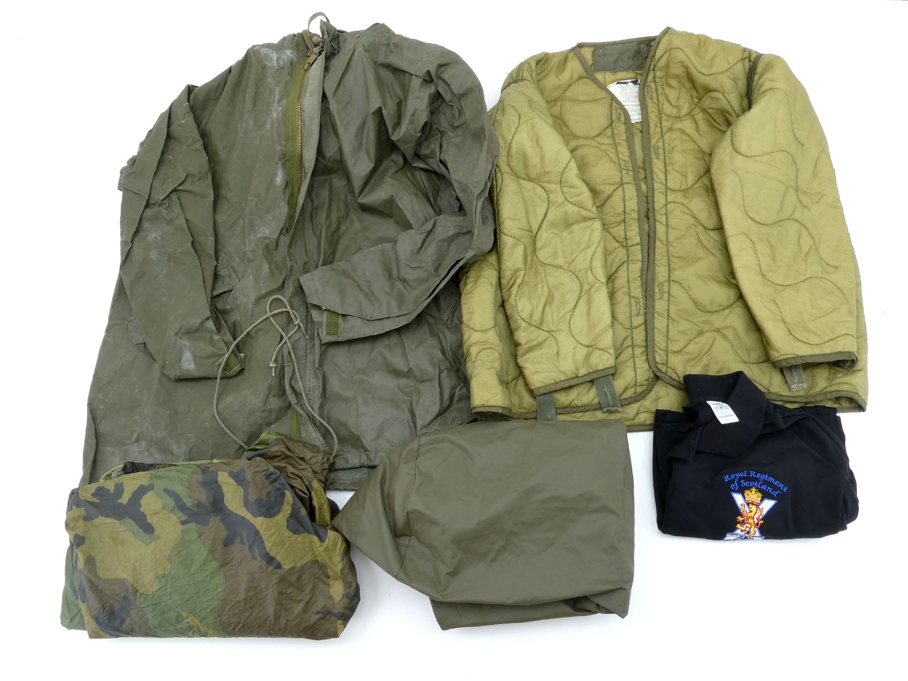 LOT INCLUDES; (1) U.S. MILITARY WET WEATHER PARKA, SIZE SMALL, VARIOUS INK STAMP MARKINGS, BUILT-IN HOOD, ZIPPERED-FRONT (WORKS), SHOWS AGE / WEAR, (1) U.S. MILITARY WOODLAND CAMO STYLE RAIN PONCHO, NO VISIBLE MARKINGS, BUILT-IN HOOD, SHOWS AGE / WEAR, APPROX. 86" X 63", (1) U.S. MILITARY COLD WEATHER COAT LINER, SIZE LARGE, VARIOUS LABELS / MARKINGS, SHOWS AGE / WEAR / TEAR & (1) ROYAL REGIMENT OF SCOTLAND BLACK T-SHIRT, SIZE XL, EMBROIDERED BADGE, VARIOUS LABELS / MARKINGS. SEE PHOTOS.