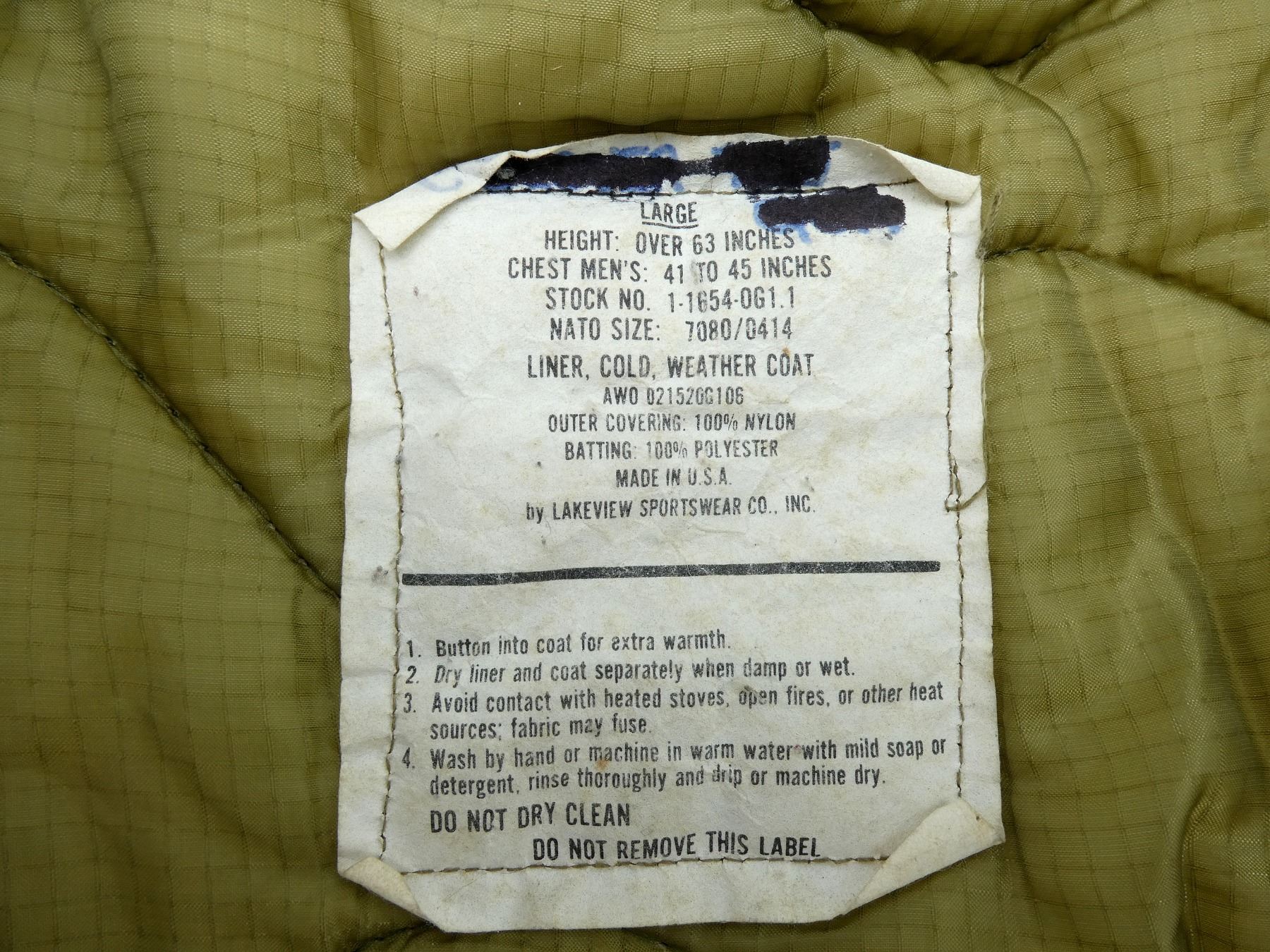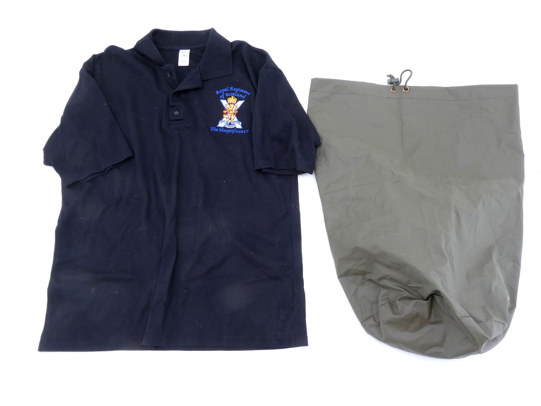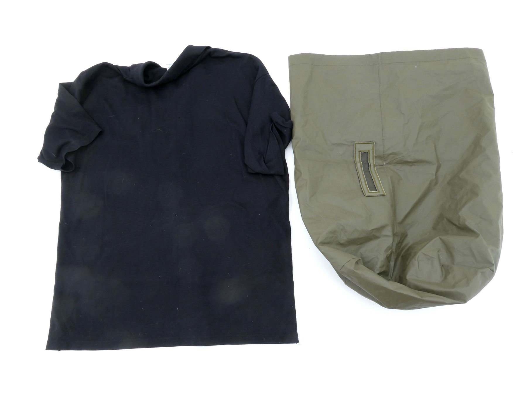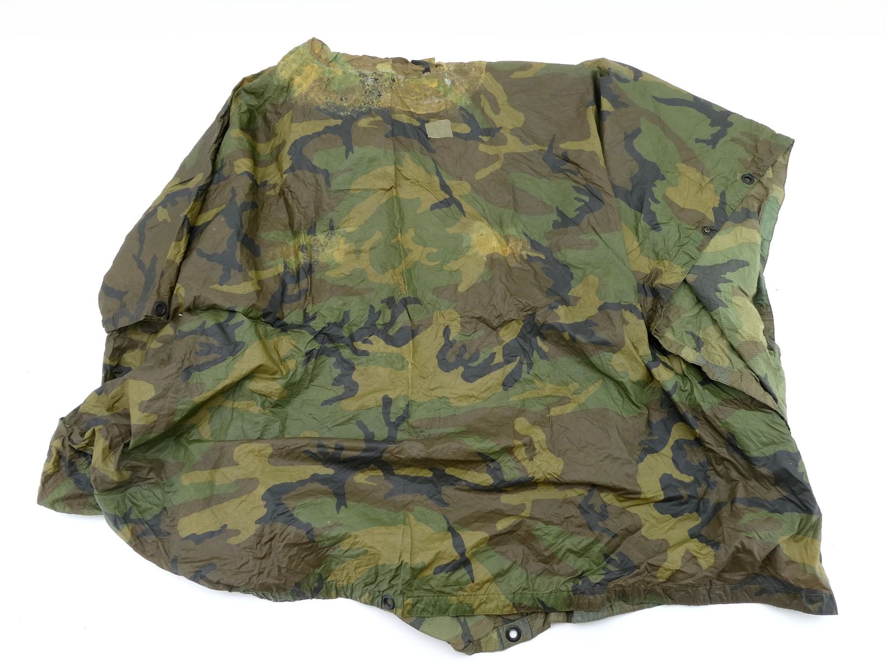 LOT INCLUDES; (1) U.S. MILITARY WET WEATHER PARKA, SIZE SMALL, VARIOUS INK STAMP MARKINGS, BUILT-IN HOOD, ZIPPERED-FRONT (WORKS), SHOWS AGE / WEAR, (1) U.S. MILITARY WOODLAND CAMO STYLE RAIN PONCHO, NO VISIBLE MARKINGS, BUILT-IN HOOD, SHOWS AGE / WEAR, APPROX. 86" X 63", (1) U.S. MILITARY COLD WEATHER COAT LINER, SIZE LARGE, VARIOUS LABELS / MARKINGS, SHOWS AGE / WEAR / TEAR & (1) ROYAL REGIMENT OF SCOTLAND BLACK T-SHIRT, SIZE XL, EMBROIDERED BADGE, VARIOUS LABELS / MARKINGS. SEE PHOTOS.