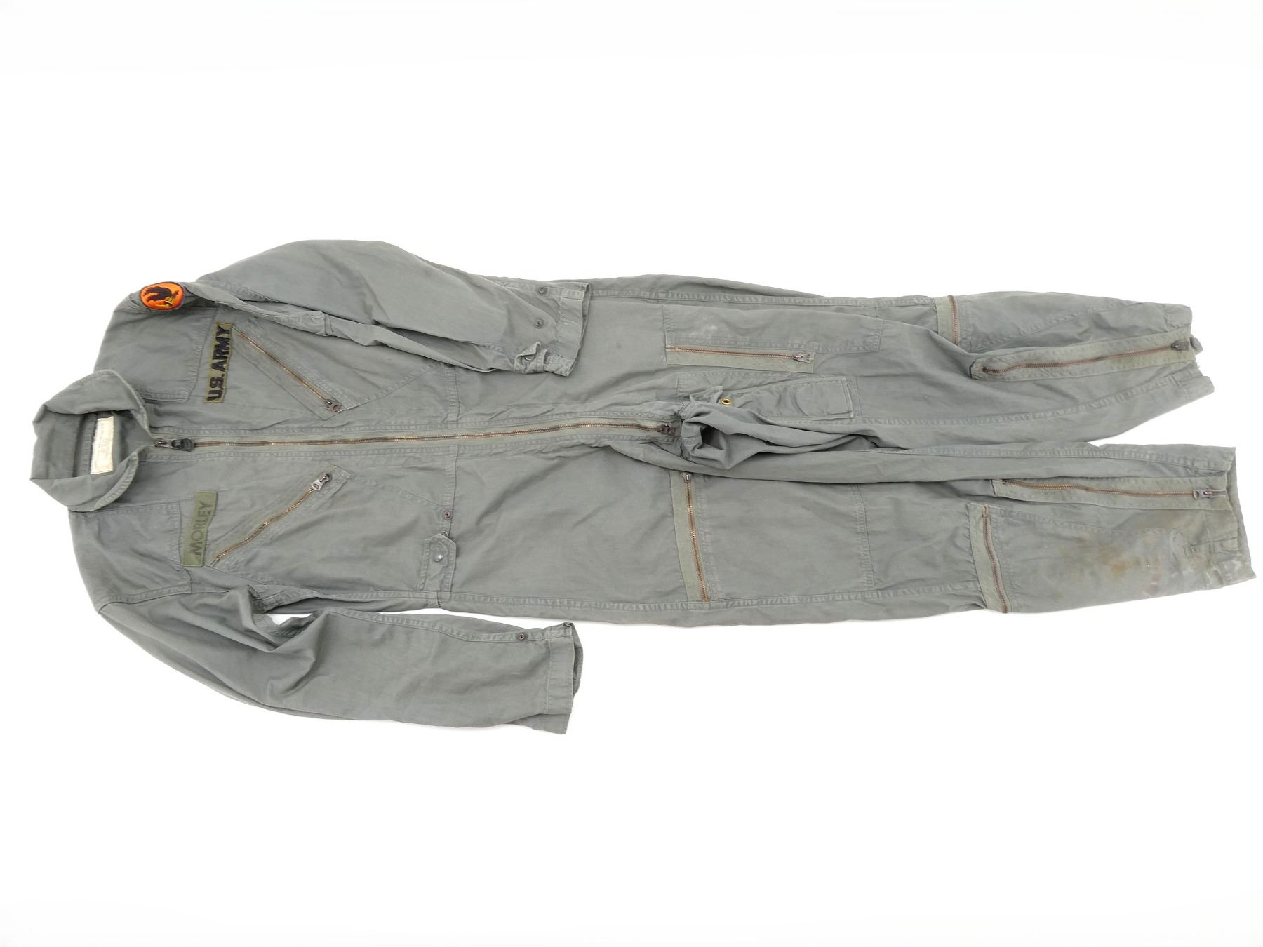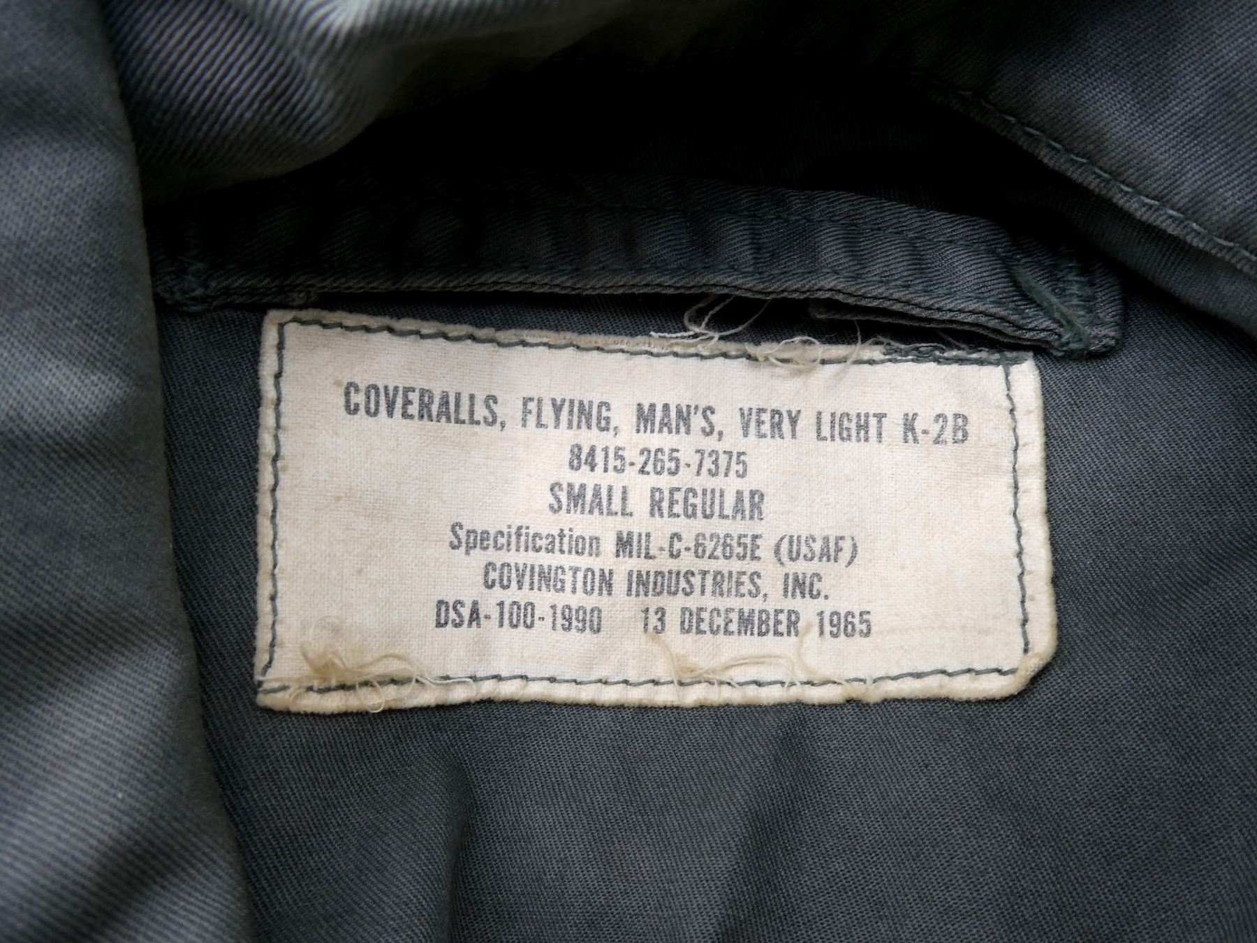 (1) FLIGHT SUIT, MARKED: "COVERALLS, FLYING, MAN'S, VERY LIGHT K-2B, 8415-265-7375, SMALL REGULAR, 13 DECEMBER 1965" ETC., SIZE SM-REG, ZIPPERED-FRONT (WORKS), ALL OTHER ZIPPERS WORK, U.S. ARMY BADGE, NAME TAG, AVIATION SCHOOL SHOULDER BADGE, SHOWS SLIGHT AGE / WEAR. SEE PHOTOS.