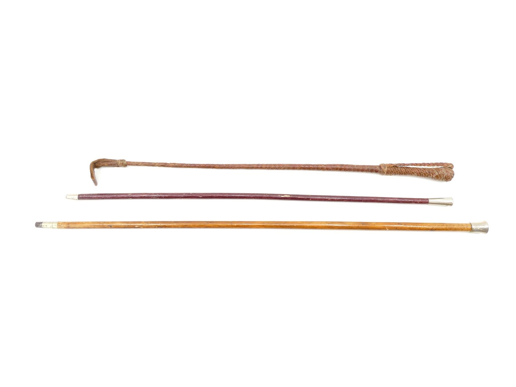 LOT INCLUDES; (1) CANADIAN MILITARY WOODEN SWAGGER STICK, MARKED: "CANADA" WITH MAPLE LEAF ON TOP METAL PIECE, OVERALL LENGTH APPROX. 27 1/8", (1) UNKNOWN MILITARY WOODEN SWAGGER STICK, NO VISIBLE MARKINGS, METAL FITTINGS, OVERALL LENGTH APPROX. 31 1/8" & (1) UNKNOWN MILITARY LEATHER BOUND RIDING CROP, NO VISIBLE MARKINGS, LEATHER WRIST STRAP & OVERALL LENGTH APPROX. 26 7/8". SEE PHOTOS.